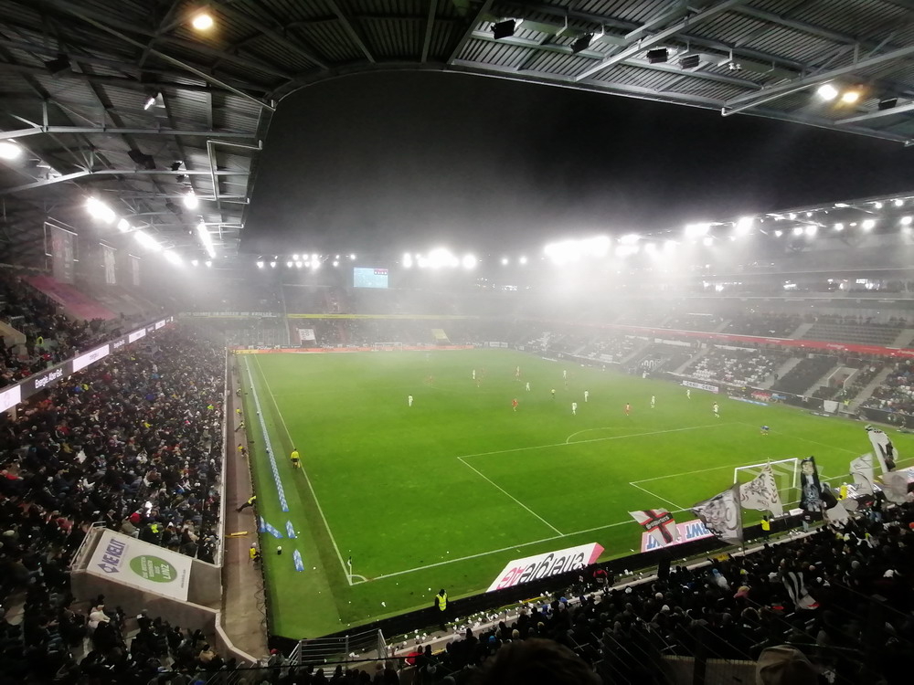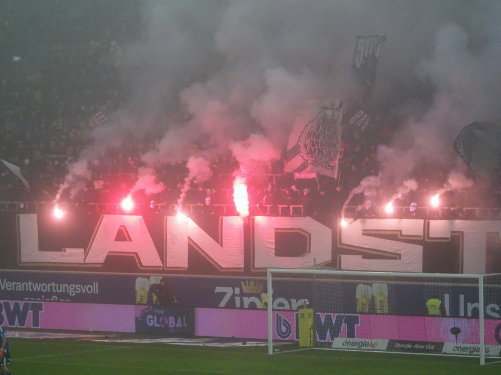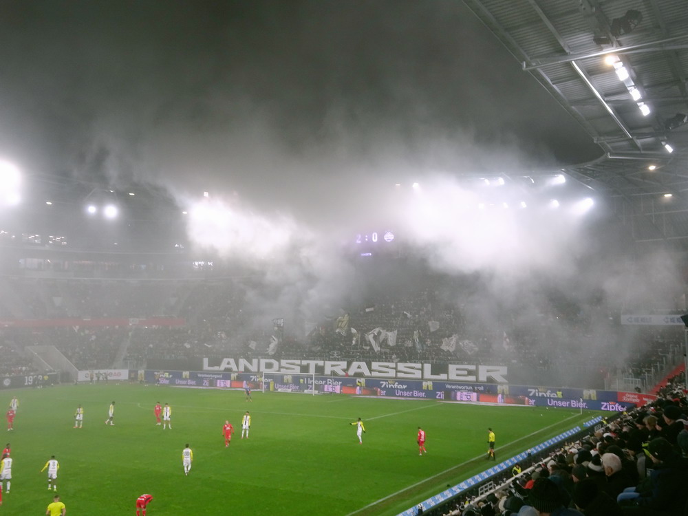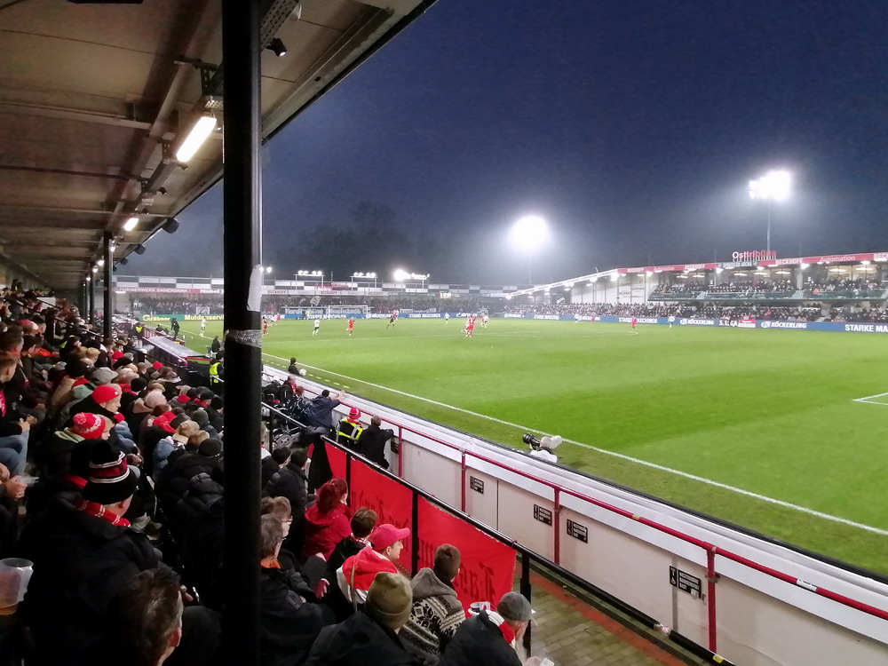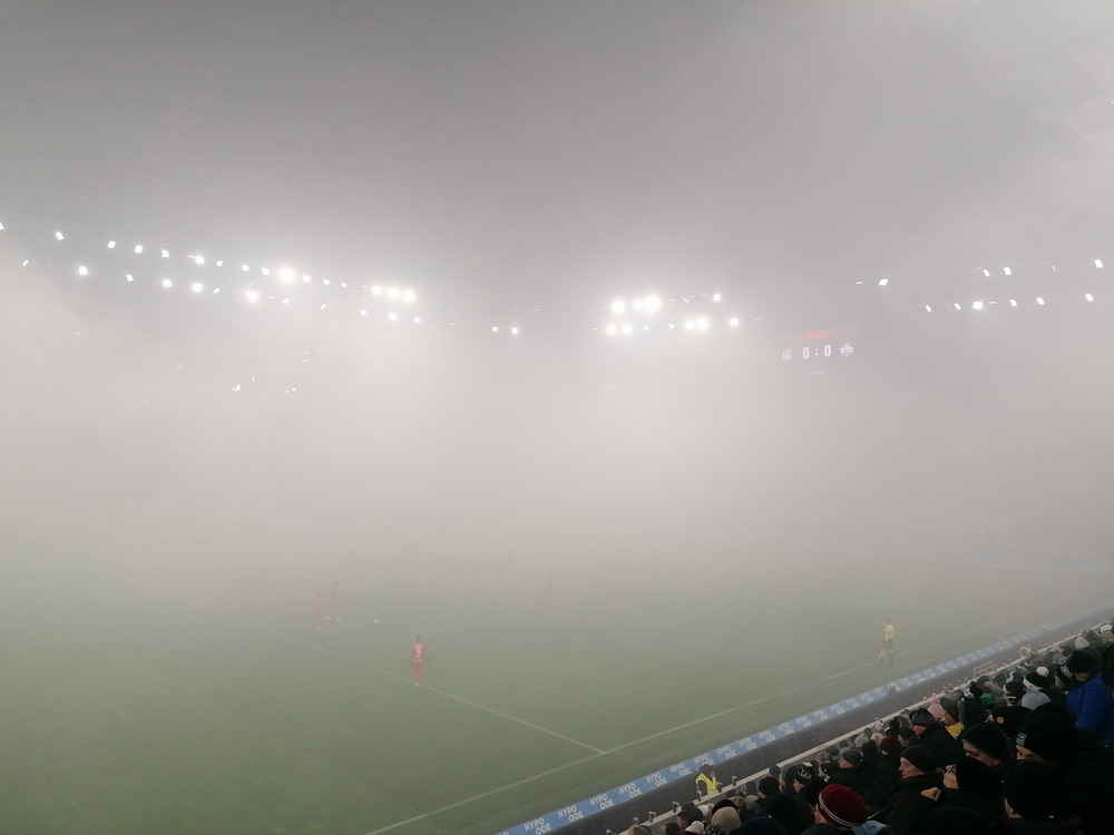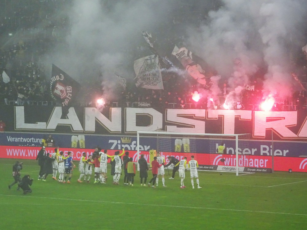 Völlig überflüssig, aber viel Zeit blieb nicht, um sich darüber zu ärgern. Moustier brachte eine seiner Einwurf-Schleudern in den Ulmer Strafraum. Diese wurde zwar geklärt, aber Mizuta lederte den geklärten Ball aus 18 Meter volley ins rechte untere Eck zur erneuten Führung. Die alte Regel des Fußballs. Stehste in der Tabelle unten, geht vieles schief. Stehst Du oben, gelingen Dinge, die sonst nicht gelingen. Der eingewechselte Safi hätte die Partie entscheiden können, als er einen Gäste-Verteidiger mit seiner Schnelligkeit stark überlief und den Schnapper schon ausgespielt hatte, sich aber noch entscheidend stören ließ und den Hundertprozenter vergab. Mal wieder, muss man sagen. Es reichte dennoch für den knappen, aber nicht ganz unverdienten Sieg. Die Stimmung – nicht überragend, aber bodenständig. Mit dieser Architektur kann die Hafenstraße nur zum Hexenkessel werden, wenn das Zusammenspiel von Ultra-Gruppen und den anderen Tribünen funktioniert und möglichst alle mitmachen. Beides passiert aber viel zu selten. Ich bin gespannt, ob die Schließung der offenen Ecken, welche im Sommer beginnen soll, die Stimmung entscheidend zum Positiven beeinflusst. Es brannte. Sehr oft. Meist einige Fackeln hier und da, dann mal roter und weisser Rauch und im letzten Spieldrittel gab es auch eine zentrale Aktion mit massivem Fackeleinsatz.