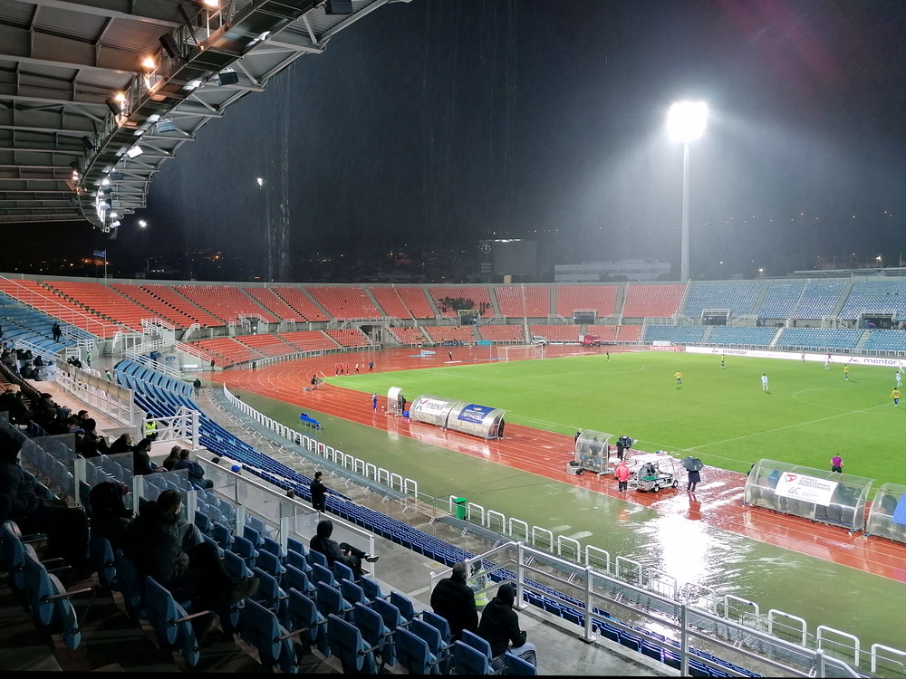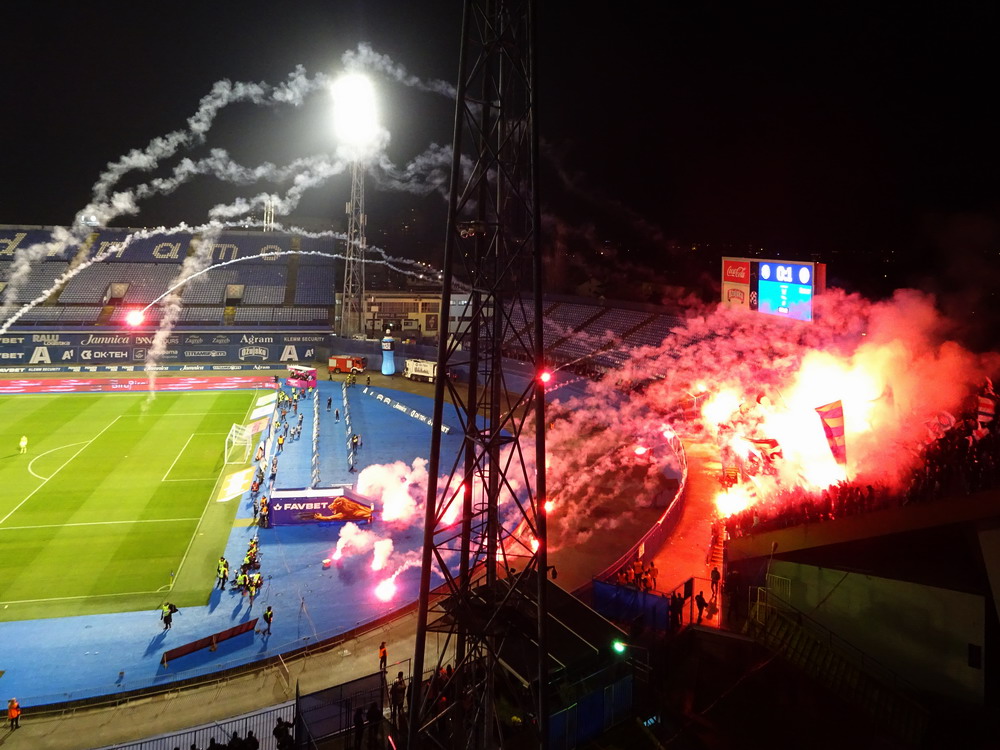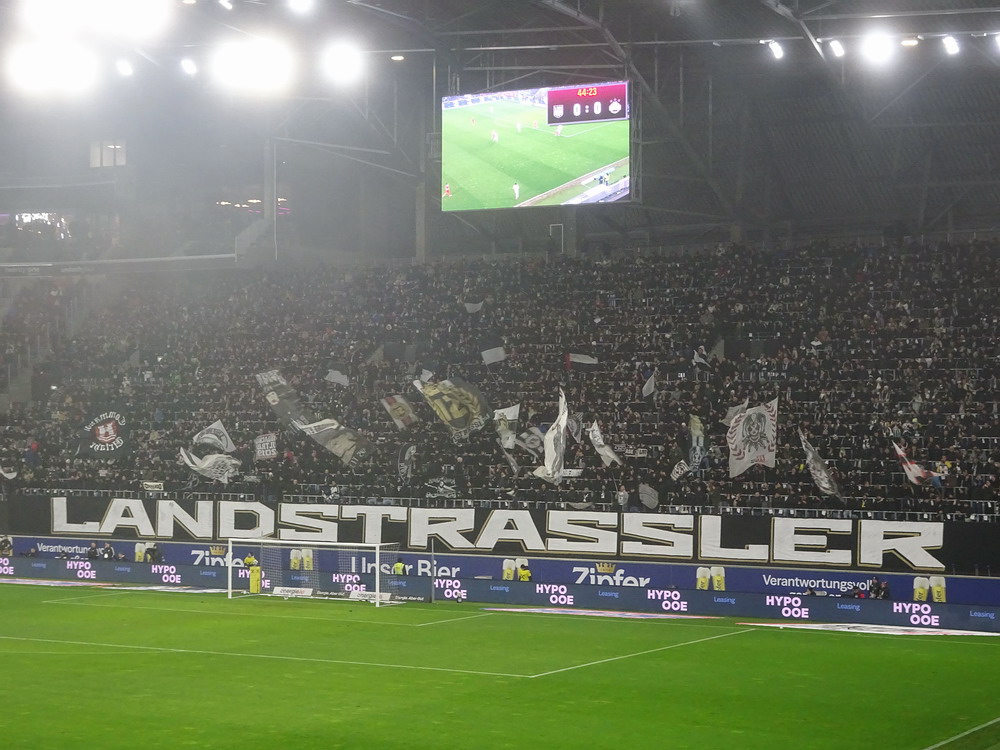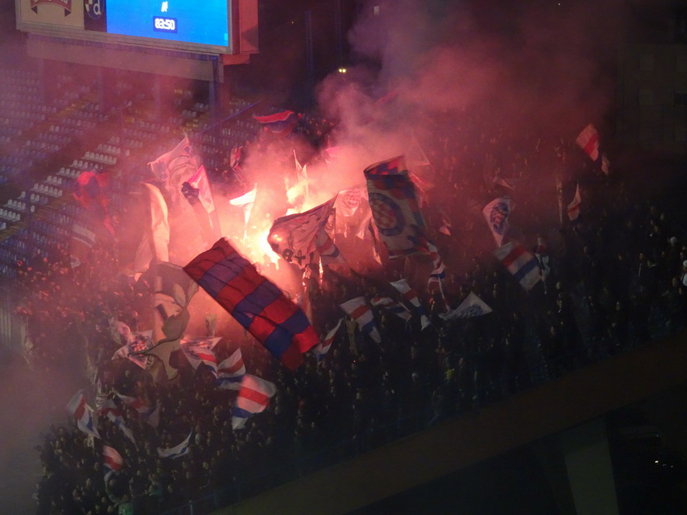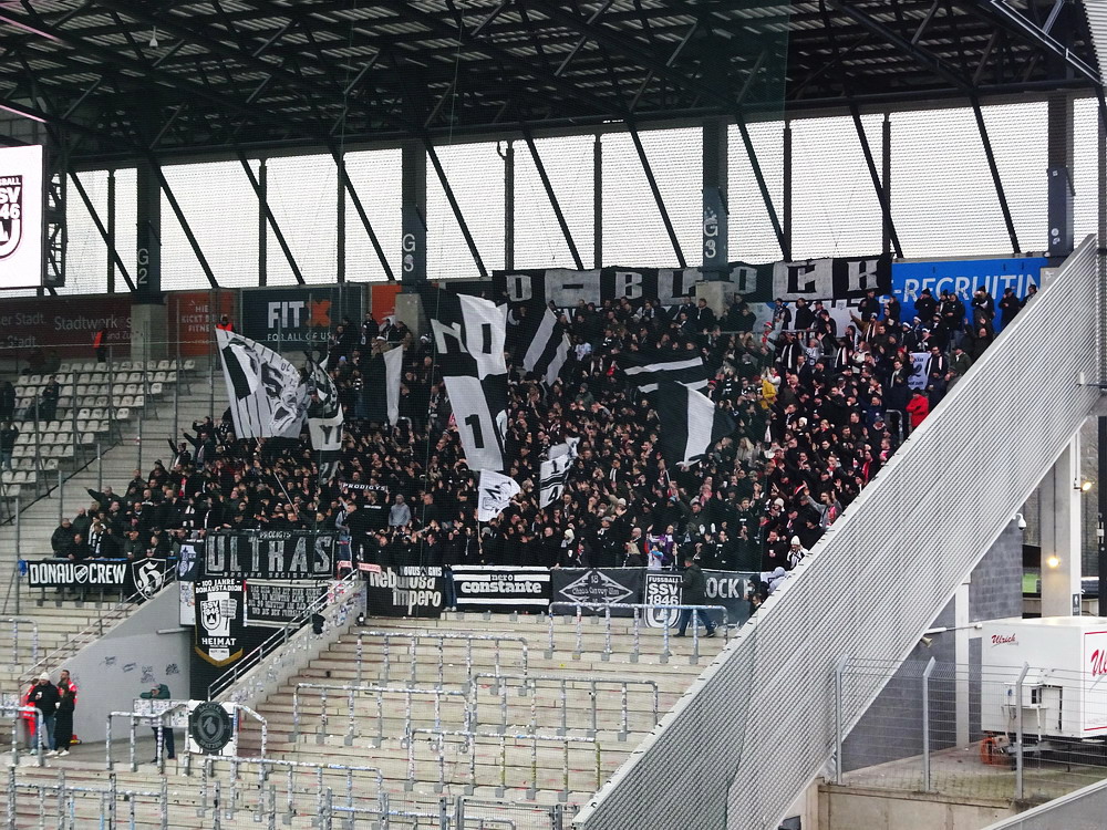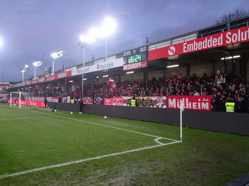Völlig überflüssig, aber viel Zeit blieb nicht, um sich darüber zu ärgern. Moustier brachte eine seiner Einwurf-Schleudern in den Ulmer Strafraum. Diese wurde zwar geklärt, aber Mizuta lederte den geklärten Ball aus 18 Meter volley ins rechte untere Eck zur erneuten Führung. Die alte Regel des Fußballs. Stehste in der Tabelle unten, geht vieles schief. Stehst Du oben, gelingen Dinge, die sonst nicht gelingen. Der eingewechselte Safi hätte die Partie entscheiden können, als er einen Gäste-Verteidiger mit seiner Schnelligkeit stark überlief und den Schnapper schon ausgespielt hatte, sich aber noch entscheidend stören ließ und den Hundertprozenter vergab. Mal wieder, muss man sagen. Es reichte dennoch für den knappen, aber nicht ganz unverdienten Sieg. Die Stimmung – nicht überragend, aber bodenständig. Mit dieser Architektur kann die Hafenstraße nur zum Hexenkessel werden, wenn das Zusammenspiel von Ultra-Gruppen und den anderen Tribünen funktioniert und möglichst alle mitmachen. Beides passiert aber viel zu selten. Ich bin gespannt, ob die Schließung der offenen Ecken, welche im Sommer beginnen soll, die Stimmung entscheidend zum Positiven beeinflusst. Es brannte. Sehr oft. Meist einige Fackeln hier und da, dann mal roter und weisser Rauch und im letzten Spieldrittel gab es auch eine zentrale Aktion mit massivem Fackeleinsatz.