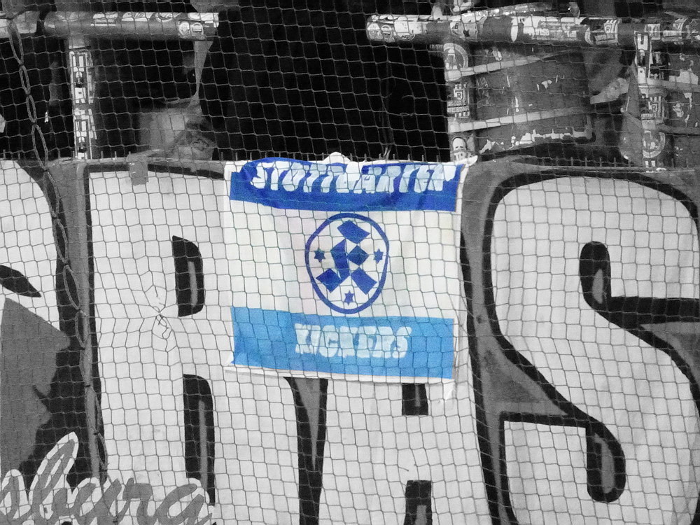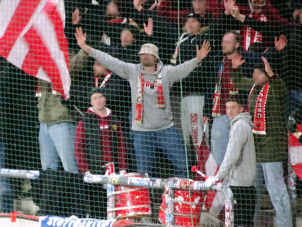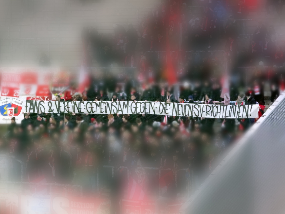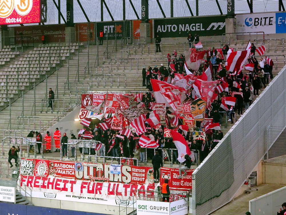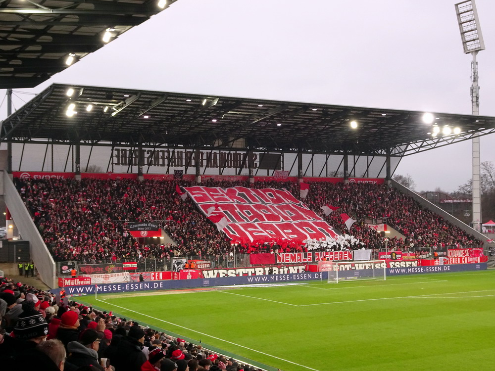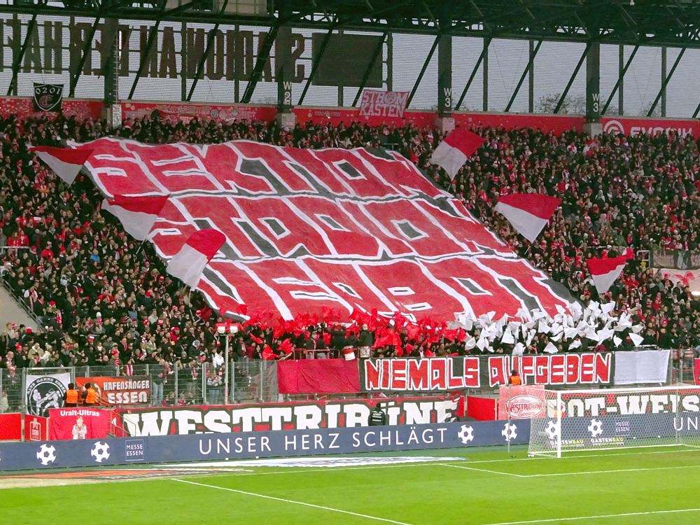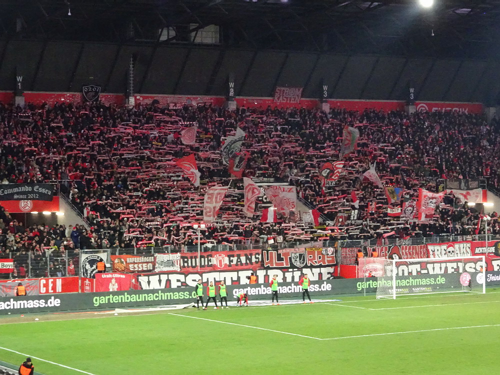 Mit dem Jahn aus ‚Rengschburg‘ stellte sich mal wieder eine vermeintlich einfache Aufgabe. Aber – ich wiederhole mich – es gibt sie in dieser Liga nicht, die einfachen Gegner. Dennoch war ein Sieg unabdingbar, wenn der Aufstiegsanspruch des RWE bestehen bleiben sollte. Die Gäste aus der Oberpfalz sind dagegen noch lange nicht von Abstiegssorgen befreit und müssen noch fleißig Punkte sammeln. Die Westkurve eröffnete mit einer kleinen Choreo zu Ehren ihrer Stadionverbotler. Aus Regensburg waren gut 300 Leute angereist. Die aktive Szene bertrat den Block aus mir unbekannten Gründen erst kurz vor dem Anstoß und lieferte unterstützt von ein paar Freunden von Blau-Weiß Linz und den Stuttgarter Kickers einen ordentlichen Auftritt ab. Der RWE hatte Anstoß und wählte erst einmal den Weg zurück. Über Gjasula, Brumme und Hüning fand der Ball den Weg zu Schlussmann Wienand, der noch nicht ganz auf der Höhe war, sich den Ball zu weit vorlegte und diesen an einen Regensburger verlor, der dann locker zur Führung einschob. Schnelle Gegentreffer nach eigenem Anstoß können wir. In der Vorwoche dauerte es nach Wiederanpfiff zur zweiten Halbzeit 16 Sekunden, heute nur noch deren 14. Die Defensive arbeitet halt an schnellen Lösungen. Dass die Abwehrreihe neu formiert war, darf nicht als Ausrede gelten. Das Gute war, dass weiterhin 90 Minuten zu spielen waren. Und so ackerten sich die Roten in die Partie und nach fünf Minuten gab es den ersten Aufreger, als Safi elfmeterreif im Strafraum gefoult wurde. Der nur wenige Meter entfernt stehende Referee hat beste Sicht auf das Geschehen, doch die Pfeife blieb stumm. Safi blieb heute ein Aktivposten, zwar weiterhin nicht torgefährlich, aber arbeitsintensiv mit guten Aktionen. Der ebenfalls von Beginn spielende Abiama konnte seinen Turbo-Auftritt vom letzten Wochenende dagegen nicht bestätigen und blieb blass.
