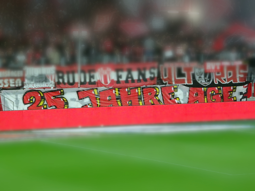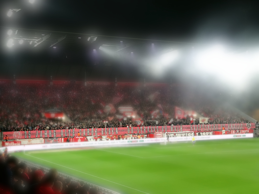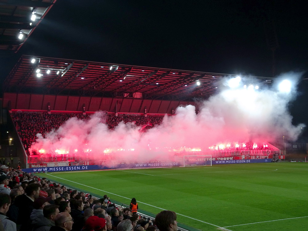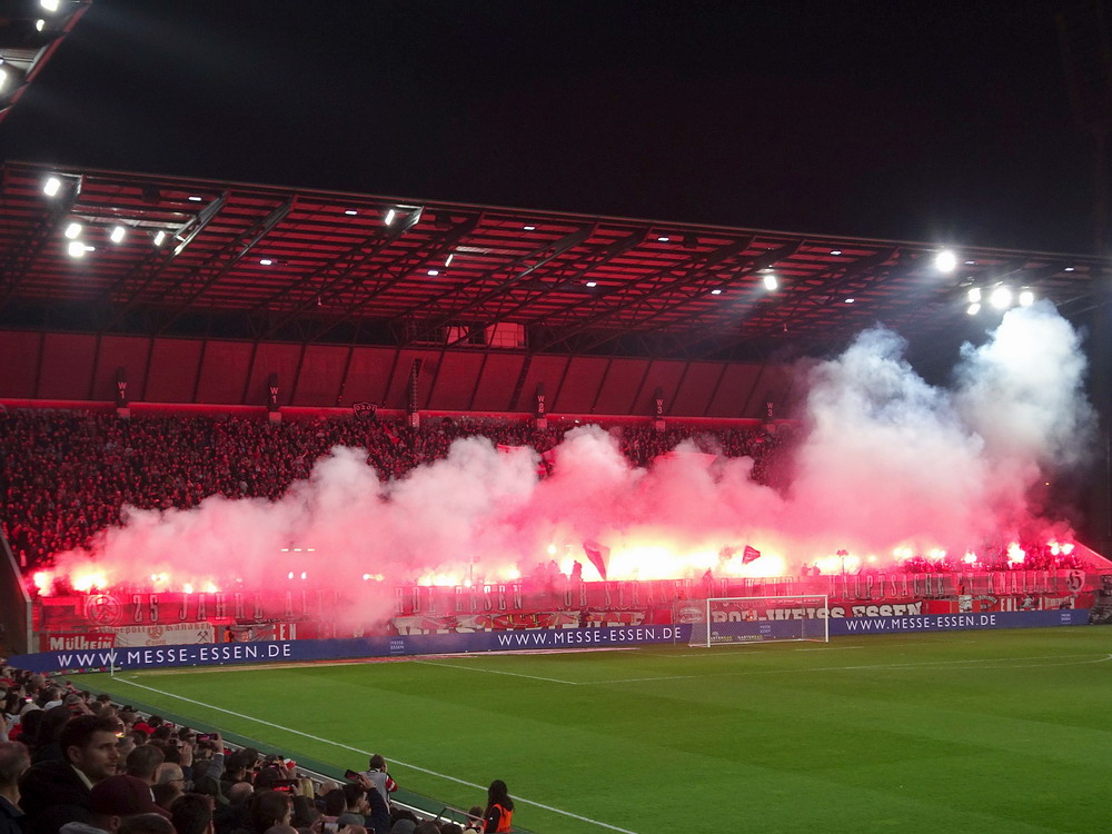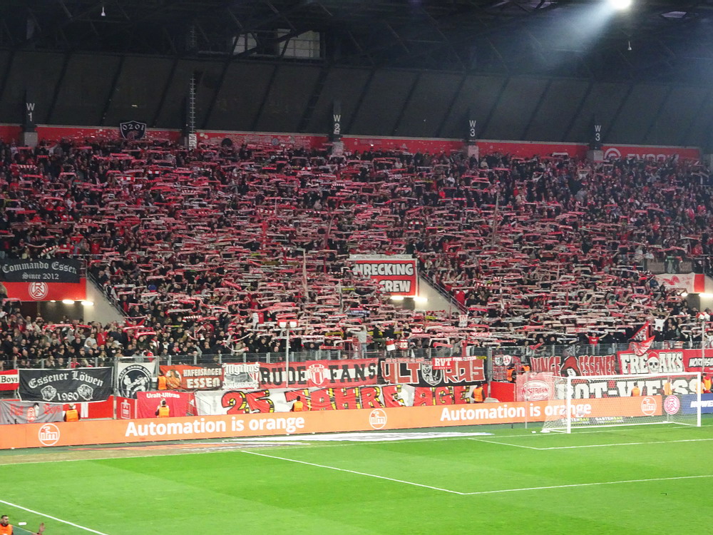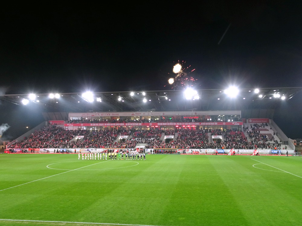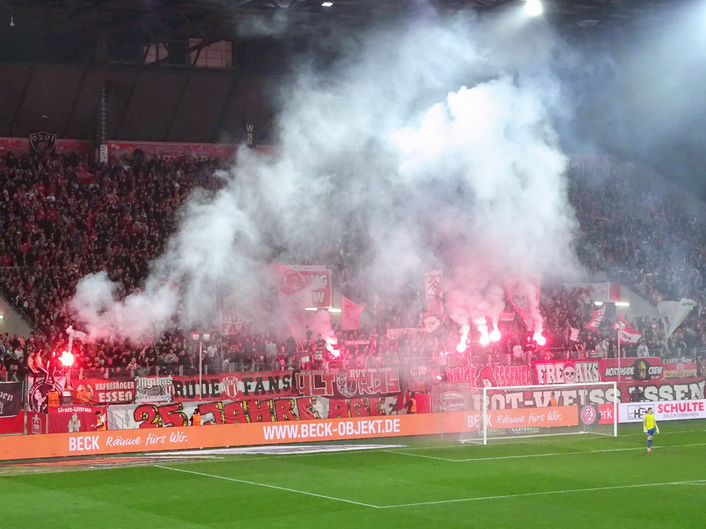 Es sollte ein denkwürdiger Abend werden, da ein Feuerwerk abgebrannt wurde, nur leider nicht von den teilnehmenden Mannschaften. Das Intro der Westkurve stand im Zeichen des 25-jährigen Jubiläums der ‚Alte Garde Essen‘, einer in letzter Zeit nicht mehr groß öffentlich in Erscheinung tretenden Gruppierung aus der ‚Hau drauf‘-Sparte. „Ob Straße, ob Wald – Hauptsache et knallt!“ stand in großen Lettern am Zaun zu lesen, hinter dem auf voller Breite rote Fackeln gezündet wurden. Auch im weiteren Verlauf der ersten Hälfte wurden immer mal wieder ein paar Bengalos in gasförmigen Stoff verwandelt. Mit Spannung war erwartet worden, wie der glorreiche RWE mit den beiden Niederlagen in den beiden aufeinanderfolgenden Auswärtsspielen in Osnabrück und Rostock umgehen und darauf reagieren würde. Die Roten diktierten dann die ersten Minuten der Partie, ehe sich auch der von gut 400 Fans begleitete Waldhof mal in Bewegung setzte. In der Folge gab es dann hüben wie drüben zaghafte Versuche, echte Torgefahr war allerding selten. Mizuta hatte noch die beste Gelegenheit, auf der Gegenseite musste Wienand bei einem Kracher vom Strafraum reflexartig die Faust hochreißen. Insgesamt hatten die Rot-Weissen aber mehr von der Partie ohne jedoch die Gäste wirklich zu beherrschen und es blieb das Gefühl, dass die ‚Barackler‘ jederzeit gefährlich werden können. Nach einer halben Stunde erzielte Janssen die Führung. Kapitän Schulz, eigentlich ja eher ein Holzfuß, spielte einen perfekten Flugball aus der eigenen Hälfte genau in den Lauf des Stürmers, der die Kirsche optimal mitnahm, noch einen Verteidiger aussteigen ließ und dann frei vor dem Waldhof-Schnapper cool einschob. Hofmann hatte vor dem Seitenwechsel per Distanzschuss noch die Chance zu erhöhen, das hätte dem Spielverlauf aber auch nicht entsprochen.