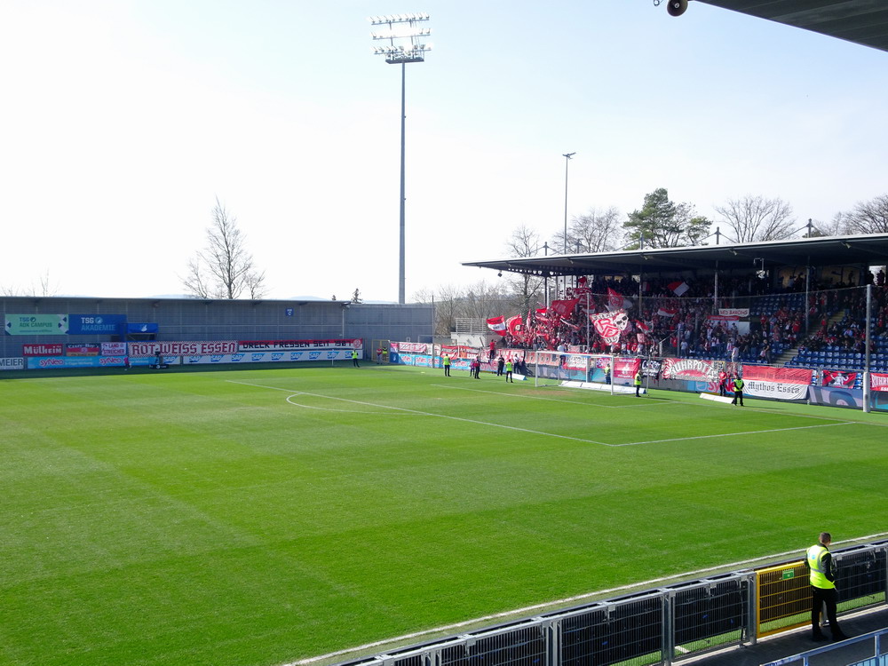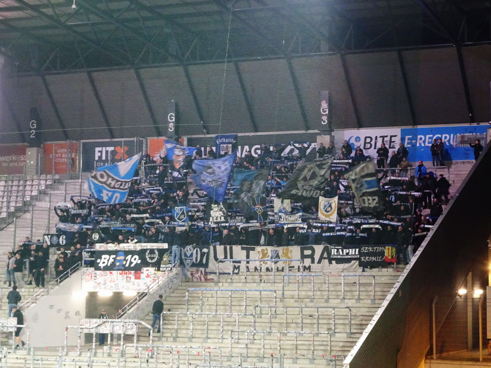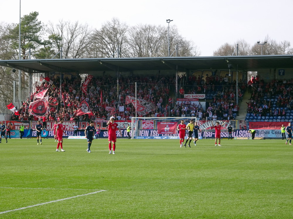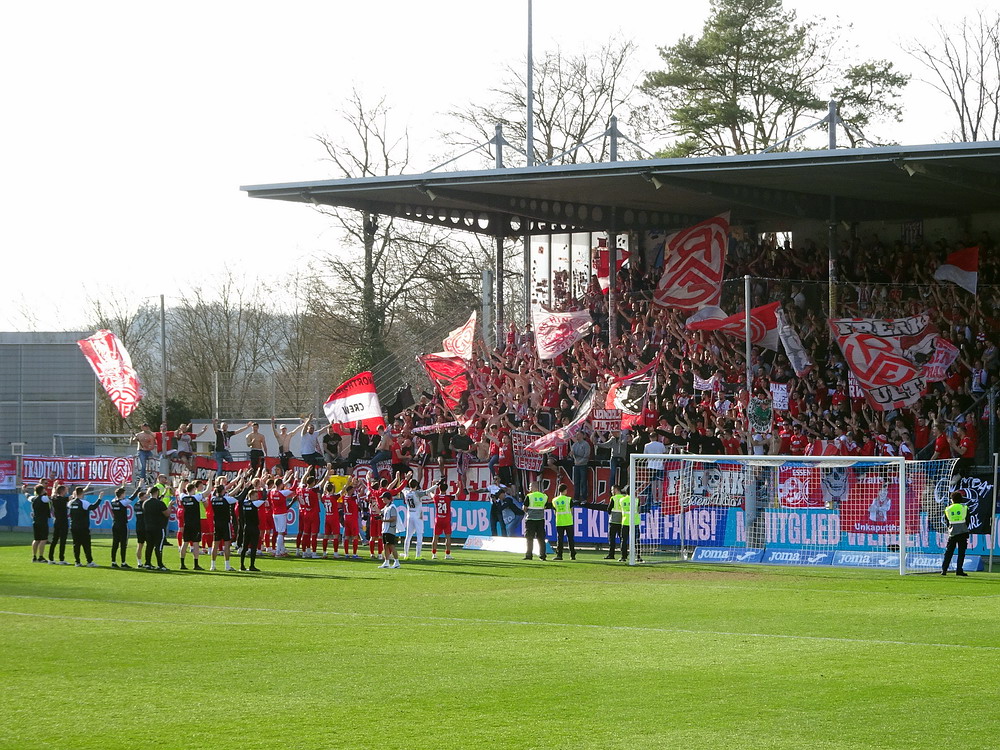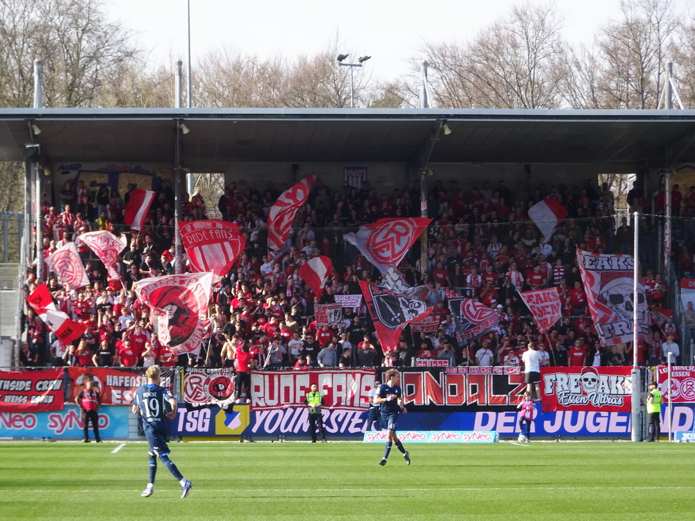 Auch für die Roten gab es nicht mehr viel Gefährliches. Brumme brachte einen schönen Freistoß in Richtung des rechten Torgiebels auf den Weg, den der Waldhof-Torhüter stark parierte. Ansonsten glänzten die Roten mal wieder damit, ihre Kontermöglichkeiten zu unsauber oder zu umständlich auszuspielen. Einfluss auf das Endergebnis hatte das nicht mehr. Positiv bleib anzumerken, dass die Westkurve den Gäste-Schlussmann vor ihrer Nase nach der Fortsetzung des Spiels komplett in Ruhe ließ. Eigentlich absolut selbstverständlich und doch ein wenig bemerkenswert, denn nicht nur auf den Anhang der ‚Buwe‘, sondern auch auf das Team fokussierte sich natürlich der Unmut. Beides eigentlich nicht berechtigt, da es ja nun mal ein Einzeltäter war, der nicht für den ganzen Verein steht. Nicht so positiv war, dass einige Gäste-Akteure nach dem Schlusspfiff auf dem Weg zu den eigenen Fans Faxen in Richtung der RWE-Fans machten. Auch wenn Provokationen von der Tribüne kamen, hätten sie das unter den besonderen Bedingungen einfach reaktionslos aushalten sollen. Trotz des wichtigen Sieges mit dem man wieder in Richtung des Relegationsplatzes schielen darf, war es irgendwie ein gebrauchter Tag, der Erfolg trat etwas in den Hintergrund. Viel Zeit zum Grübeln bleibt nicht, schon am Samstag geht es auswärts weiter bei der Reserve von Didis SAP-Betriebsmannschaft.