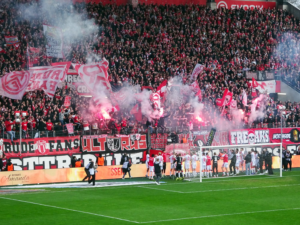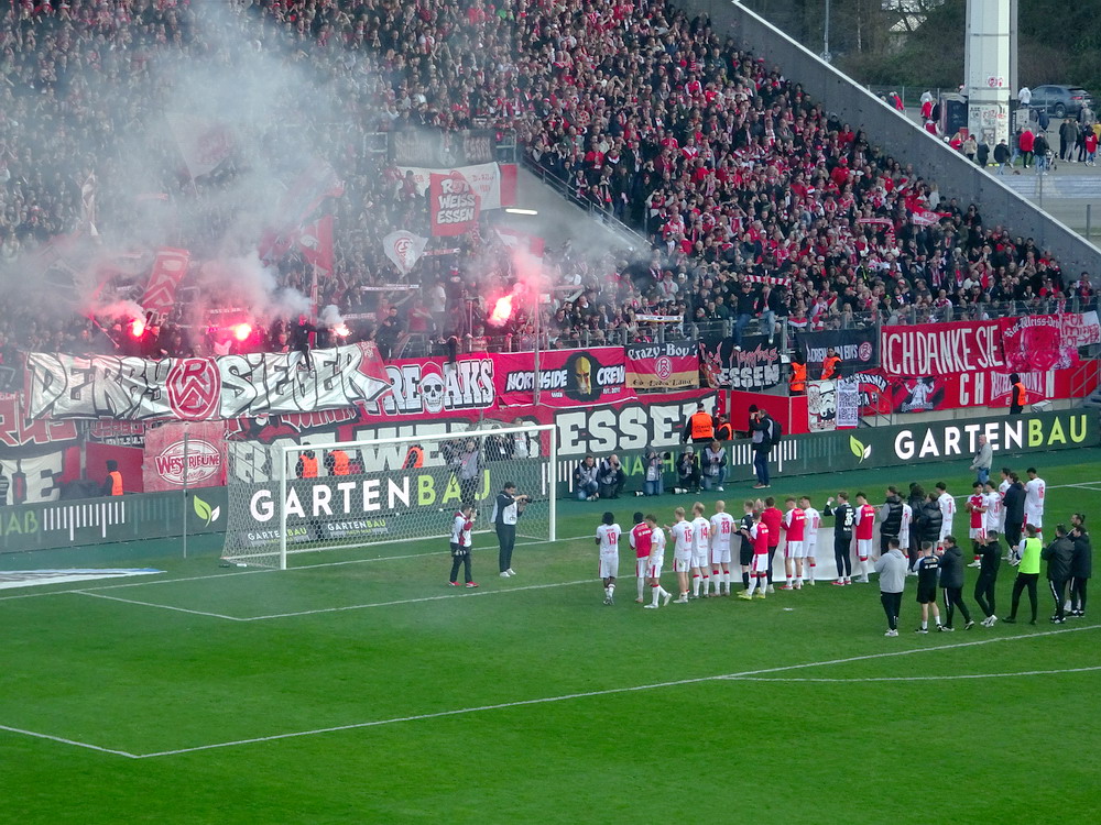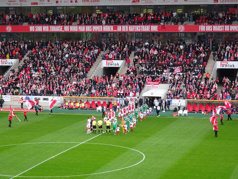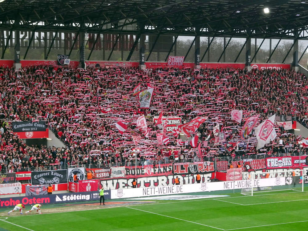 Zwanzig Minuten vor Schluss hätte Müsel für etwas mehr Gewissheit sorgen können. Von Gjasula mit einem fantastischen Steilpass eingesetzt, schabbelte er das Spielgerät etwas bedrängt an MSV-Schnapper Braune vorbei und zum dritten Mal war der Torpfosten der beste Duisburger Verteidiger. Dann wurde es hektisch auf dem Grün. Nach dem üblichen Gerangel nach einem Eckball für die Gäste, ließ sich Casar zu einer Tätlichkeit hinreißen und trat den vorzeitigen Gang unter die Dusche an. Und plötzlich war es ein anderes Spiel. Ich stehe eh nicht so auf Platzverweise für den Gegner. Die Ordnung geht durch die geänderten Kräfteverhältnisse oft völlig verloren und die Mannschaft in Unterzahl macht auf einmal zusätzliche Kräfte frei. So war es auch heute, denn die Roten kamen total aus dem Tritt und der MSV noch zu zwei recht ordentlichen Chancen. Das konnte aber am hochverdienten Sieg nichts mehr ändern, auch im siebten Spiel in Folge gegen die Gestreiften blieb der RWE ohne Niederlage und die Hafenstraße versank im Jubel. Und der RWE beißt sich richtig in der Spitzengruppe fest. Fünf Siege in Serie führen dazu, dass selbst ein Pessimist wie ich plötzlich an den Aufstieg glauben mag. Aber alle sind gut beraten von Spiel zu Spiel zu denken. In dieser Liga kann sich alles ganz schnell wieder drehen. Denn wer hätte nach den beiden ganz schwachen Auftritten in Osnabrück und Rostock schon diese Siegesserie erwartet. Next Stop Schweinfurt.