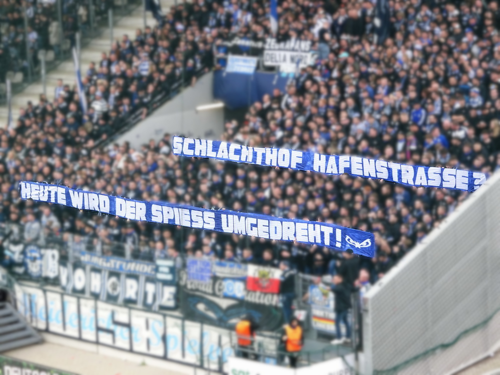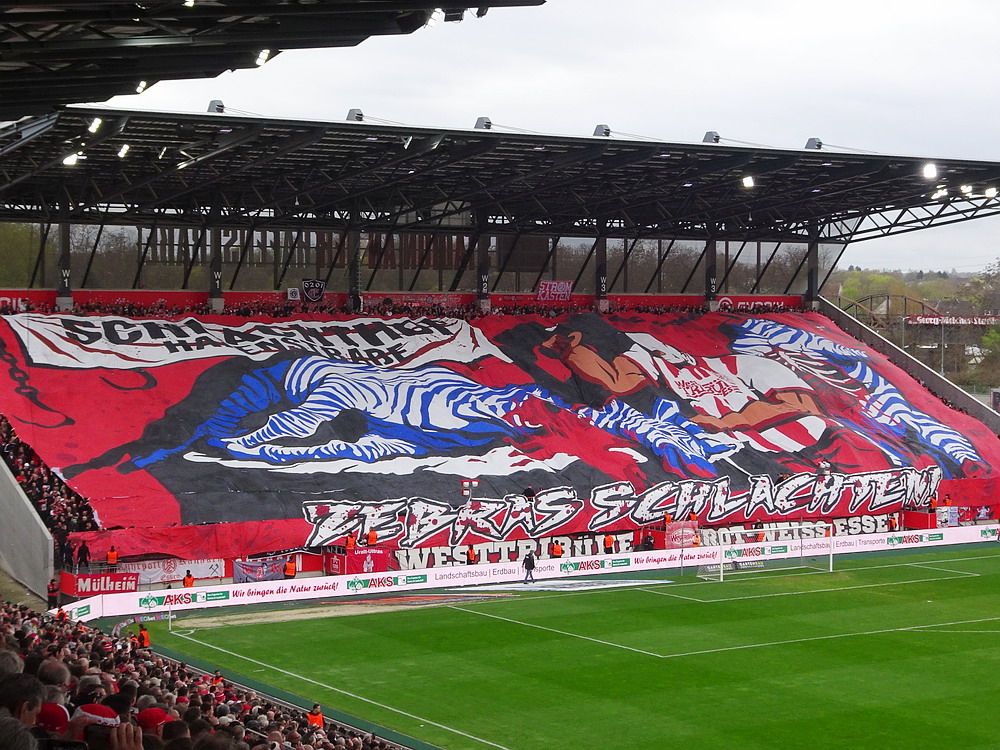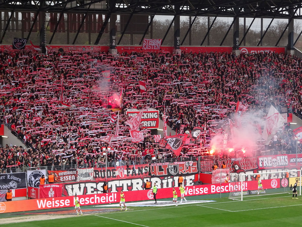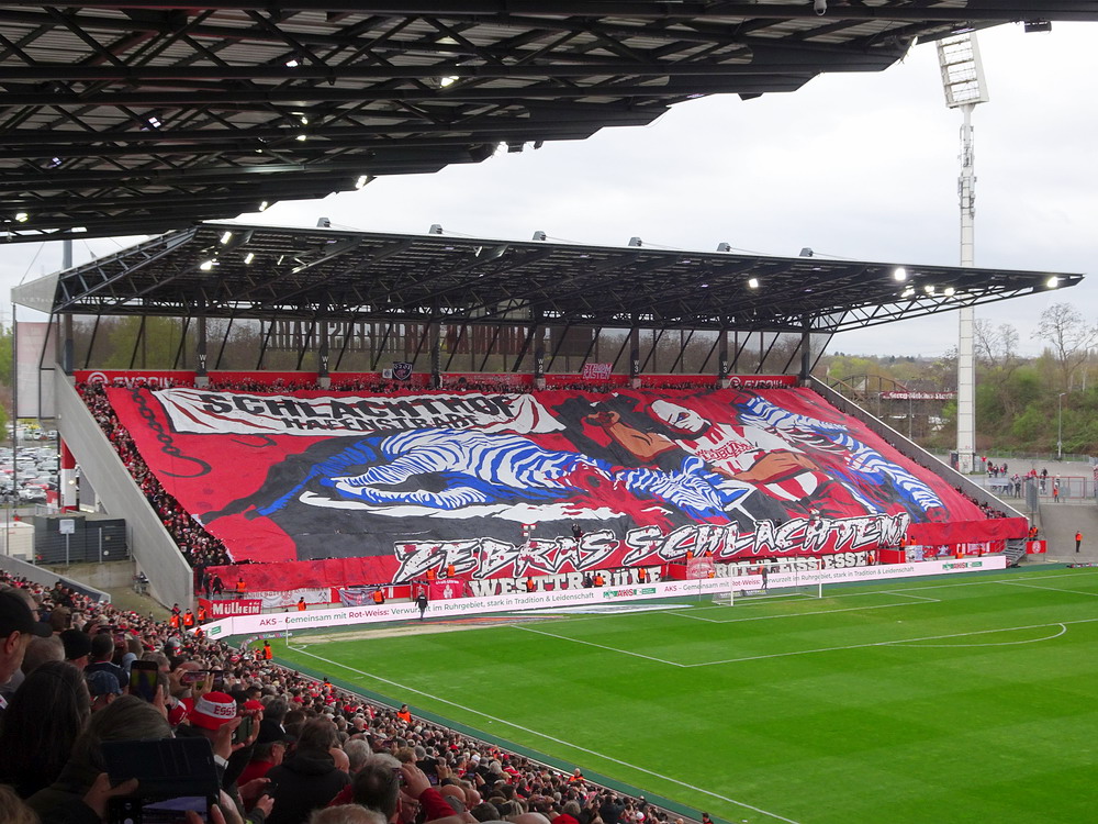 Lange war das Spiel gegen die Zebra-Herde aus Meiderich ein Derby zweiter Klasse. Da aber das einzig wahre Derby gegen den größten Rivalen aus der Stadt mit der höchsten Arbeitslosenquote Deutschlands zuletzt vor mehr als 30 Jahren stattfand, hat sich das Spiel gegen die Gurkentruppe von der Regattabahn zum aktuell wohl wichtigsten Duell gemausert. Auch dadurch begünstigt, dass die Klingen in den vergangenen Jahren ja häufiger gekreuzt wurden. Aufgrund der sportlichen Ausgangslage war heute noch mal ne Schüppe mehr Brisanz dabei, es brannte schon ziemlich die Luft. Die großen Ultra-Gruppen des RWE hatten gemeinschaftlich eine groß angelegte Choreo gefertigt. Auf einer die ganze Westkurve bedeckenden Blockfahne war ein martialisches Motiv unter der Überschrift ‚Schlachthof Hafenstraße‘ abgebildet. Zwar gut und detailliert gemalt, aber nichts für Moralapostel und zartbesaitete Gemüter. Der Gästeblock verzichtete heute auf jegliche Stilelemente. Jedoch wurde von der ‚Proud Generation‘ schon vor dem Display der RWE-Choreo ein Spruchbang präsentiert, das Bezug zu eben jener nahm. Immer wieder interessant, wie in den Ultra-Szenen Information durchsickern und Aktionen geleakt werden. In der Westkurve wurde noch ein Spruchband zur Rauch-Fernzündung im Spiel bei der Kölner Viktoria gezeigt, die ja nach meiner Meinung eine durchaus gelungene Provokation vor dem Derby war. Außerdem wurden die sexuellen Vorlieben eines ‚Kohorte‘-Mitglieds geoutet – schon eher eine fragwürdige Aktion, aber das muss man wohl abkönnen, wenn man einer Ultra-Gruppierung angehört.