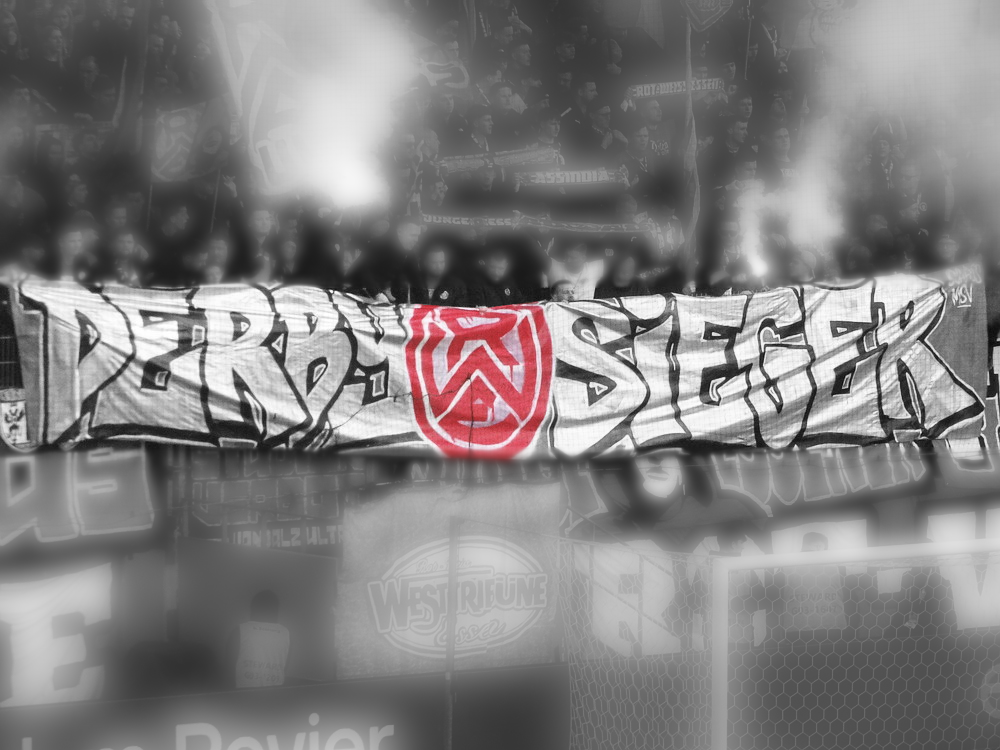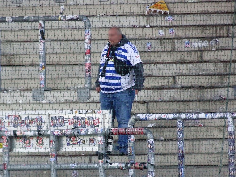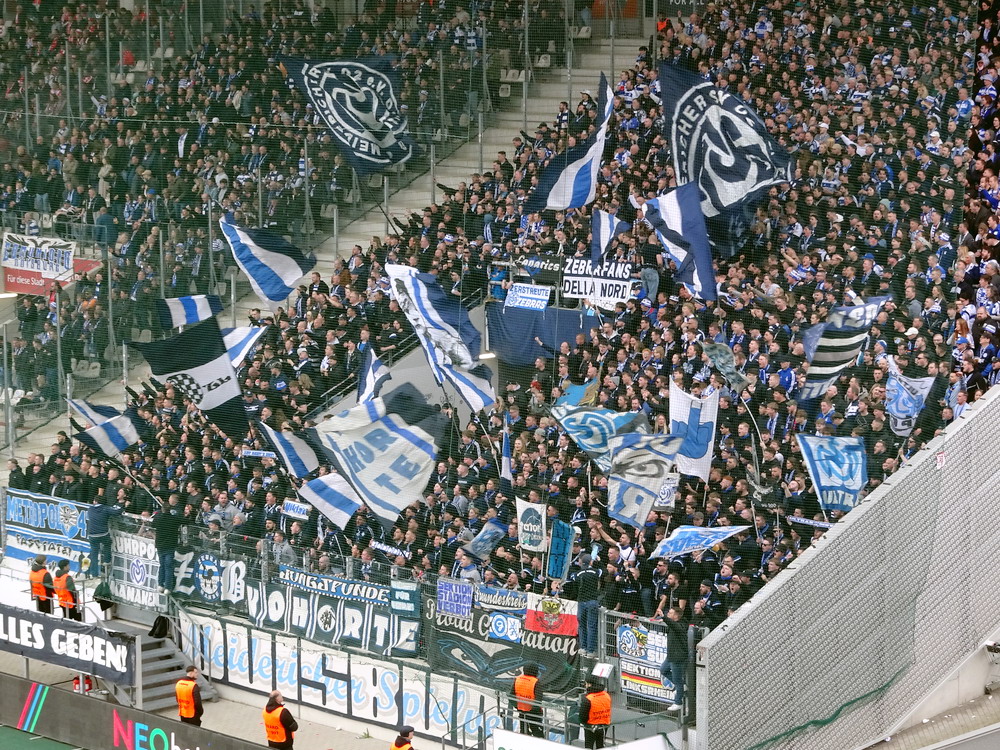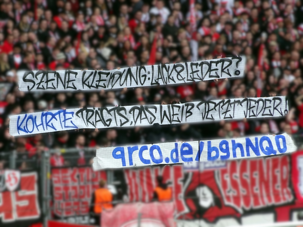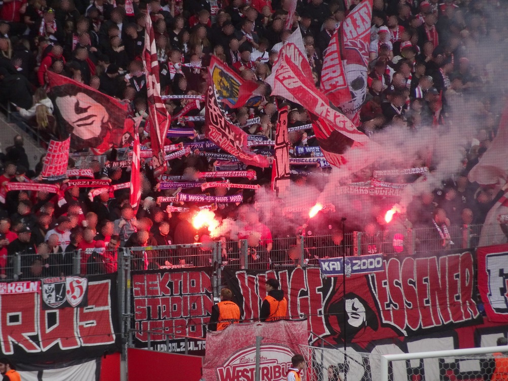 Lange war das Spiel gegen die Zebra-Herde aus Meiderich ein Derby zweiter Klasse. Da aber das einzig wahre Derby gegen den größten Rivalen aus der Stadt mit der höchsten Arbeitslosenquote Deutschlands zuletzt vor mehr als 30 Jahren stattfand, hat sich das Spiel gegen die Gurkentruppe von der Regattabahn zum aktuell wohl wichtigsten Duell gemausert. Auch dadurch begünstigt, dass die Klingen in den vergangenen Jahren ja häufiger gekreuzt wurden. Aufgrund der sportlichen Ausgangslage war heute noch mal ne Schüppe mehr Brisanz dabei, es brannte schon ziemlich die Luft. Die großen Ultra-Gruppen des RWE hatten gemeinschaftlich eine groß angelegte Choreo gefertigt. Auf einer die ganze Westkurve bedeckenden Blockfahne war ein martialisches Motiv unter der Überschrift ‚Schlachthof Hafenstraße‘ abgebildet. Zwar gut und detailliert gemalt, aber nichts für Moralapostel und zartbesaitete Gemüter. Der Gästeblock verzichtete heute auf jegliche Stilelemente. Jedoch wurde von der ‚Proud Generation‘ schon vor dem Display der RWE-Choreo ein Spruchbang präsentiert, das Bezug zu eben jener nahm. Immer wieder interessant, wie in den Ultra-Szenen Information durchsickern und Aktionen geleakt werden. In der Westkurve wurde noch ein Spruchband zur Rauch-Fernzündung im Spiel bei der Kölner Viktoria gezeigt, die ja nach meiner Meinung eine durchaus gelungene Provokation vor dem Derby war. Außerdem wurden die sexuellen Vorlieben eines ‚Kohorte‘-Mitglieds geoutet – schon eher eine fragwürdige Aktion, aber das muss man wohl abkönnen, wenn man einer Ultra-Gruppierung angehört.