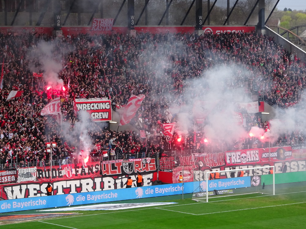Doppelschlag, es lief also. Etwas zu gut, denn die Psychologie der Führung ermunterte die Roten, den Fuß vom Gas zu nehmen. Die Gastgeber wurden etwas agiler, kamen aber nur zu einem gefährlichen Abschluss nach einer halben Stunde, als sich Golz strecken musste, um einen Kopfball zu entschärfen. Ansonsten verwaltete der RWE die Führung unaufgeregt und Abiama hätte den Sack mit dem Pausenpfiff eigentlich schon zuschnüren können. Völlig unnötig kam die Viktoria dann nur fünf Minuten nach Wiederanpfiff zum Anschluss. Nach einer Freistoßflanke pingpongte die Murmel durch den Sechzehner und Alonsos Klärungsversuch kurz vor der Torlinie fand nur noch ins eigene Netz. Kein guter Tag für den Leistungsträger, der auch noch seine fünfte gelbe Karte sah und dadurch im Derby gegen Meiderich fehlen wird. Danach passierte erst einmal nicht viel, wenn man von einer blauen Rauchdose absieht, welche die MSV-Szene wohl vorher schon mal als Derby-Gruß im Away-Sektor versteckt hatte und die nun von ein paar ‚Terroristen‘ von draußen ferngezündet wurde. Zwanzig Minuten vor dem Ende zündete langsam auch die Viktoria und bereitete der RWE-Defensive ordentlich Beschäftigung. Diese löste die gestellten Aufgaben aber fast fehlerfrei und da die eigenen Konterchancen mal wieder desaströs gespielt wurden, blieb es beim knappen Auswärtssieg und der glorreiche RWE grüßt zum allerersten Mal seit dem Aufstieg in die Dritte Liga von einem direkten Aufstiegsplatz.