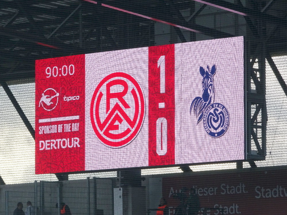 Die Roten waren von Beginn an drin in der Partie und überließen dem Gegner nicht einen Millimeter Rasen zur Entfaltung. Hüning setzte mit einem Kopfball nach wenigen Minuten ein erstes Zeichen und nur das Aluminium verhinderte die frühe Führung. In der Folge kontrollierte der RWE die Partie, die Abschlüsse waren aber ungefährlich. Die Meidericher kamen aus dem Spiel heraus überhaupt nicht zur Geltung, konnten nur bei Eckbällen im rot-weissen Sechzehner Präsenz zeigen. Als man eigentlich davon ausgehen konnte, dass es torlos in die Pause geht, gingen die Rot-Weissen doch noch in Führung. Mizuta, der ein Riesen-Spiel machte, war einmal mehr der Ausgangspunkt. Seine Flanke von links fand zwar keinen Abnehmer, aber die Kirsche querte den gesamten Strafraum und landete bei Brumme. Dieser ließ einen Gegner aussteigen und passt quer wieder auf Mizuta, der sich in den Rückraum geschlichen hatte, mutterseelenallein war und per Direktabnahme zur Führung rechts unten einlochte. Wird schwer den Japaner, dessen Vertrag ausläuft, zu halten, dafür muss wohl schon mindestens der Aufstieg her. Der Treffer fiel zum richtigen Zeitpunkt, denn nach einem Sanitäter-Einsatz in der Westkurve hatten beide Seiten gerade erst wieder den Support aufgenommen. Kurz nach Wiederanpfiff zirkelte Brumme einen direkten Freistoß aus halblinker Position links an der Mauer vorbei und die Kugel klatschte ans Aluminium. Danach gab es weitere Möglichkeiten, aber auch der MSV nahm nun ein wenig am Spiel teil und Golz musste den Ausgleich mit einer Fußabwehr verhindern.
