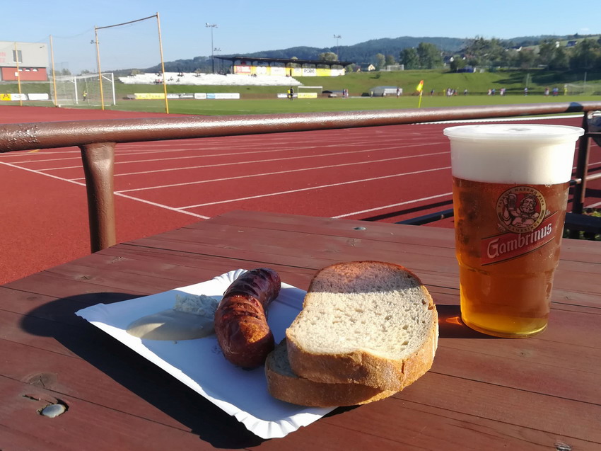 Der nächste Morgen führte mich nur einige Kilometer weit in einen Vorort von Olomouc zu einem Spiel der höchsten Spielklasse des gleichnamigen Verwaltungsbezirks. Auch hier waren natürlich die elementaren Voraussetzungen für einen Fußballgenuss in Tschechien vorhanden – frisch gezapftes Helles und Krainer Wurst. Diese kam hier sogar aus dem Räucherschrank und ein kräftig-rauchiges Aroma verbreitete sich auf der ganzen Anlage. Der Grillmaster verteilte seine köstlichen Erzeugnisse stilecht gekleidet in eine Jogging-Peitsche. Die ‚Zigary‘ – eine dünnere Variante der Krainer Wurst – waren ein Traum. Das Spiel wurde im Elfmeter-Schießen entschieden, dass dem Sieger in den unteren Klassen einen weiteren Punkt bringt, wenn es nach regulärer Spielzeit unentschieden steht.
