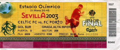 Am 24. April 2003 saß ich mit Michael und Martin, Anhänger der Mönchengladbacher Borussia, zu denen ich über meine Schwester Kontakt bekam, die uns wegen unseres gemeinsamen Faible für den Celtic Football Club zusammen brachte, vor dem Fernseher und schaute das Rückspiel im Halbfinale des UEFA-Cup zwischen Boavista und Celtic. Das Hinspiel war mit einem 1:1 zu Ende gegangen, die Tore fielen kurz nach der Pause binnen zwei Minuten – Henrik Larsson glich das Eigentor eines Teamkollegen aus. Zur Halbzeit des Rückspiels, beim Stande von 0:0, schlossen wir den Pakt, zum Finale nach Sevilla zu reisen, falls Celtic es noch packen sollte. Während der Celtic Park im Hinspiel mit 60.000 Fans aus allen Nähten platzte, befanden sich im Estadio de Bessa gerade einmal knapp über 10.000 Zuschauer. Lange sah es danach aus, dass uns der Trip nach Andalusien verwehrt bleiben sollte, aber in der 80. Minute traf Henrik Larsson, zu dieser Zeit ja so eine Art Lebensversicherung für Celtic, zum Sieg, ebnete damit den Weg zum Finaleinzug und verhindert ein reines Porto-Finale.