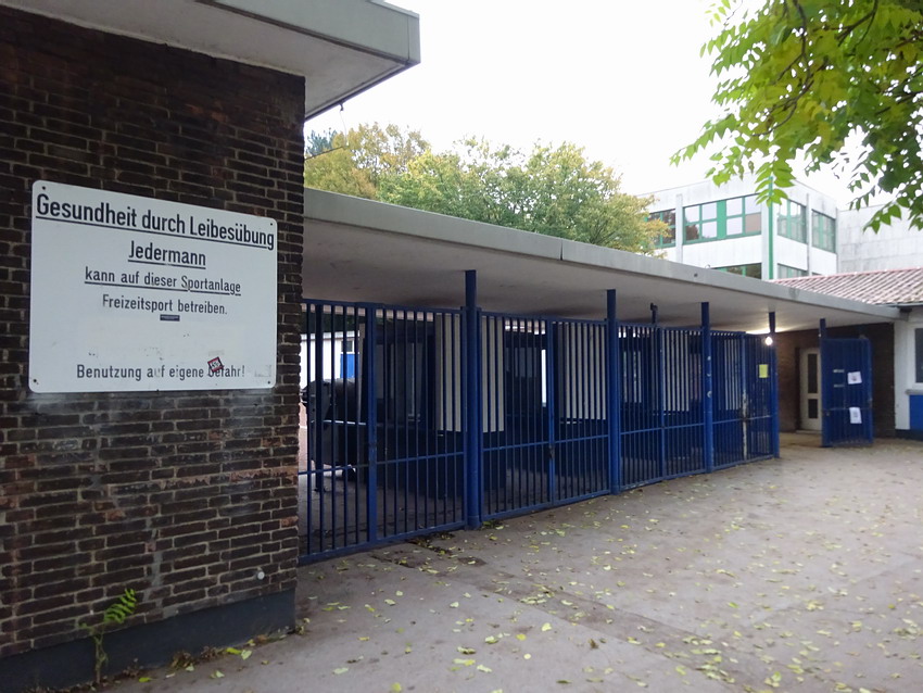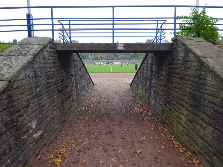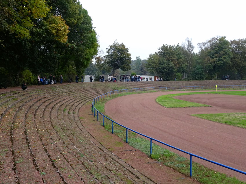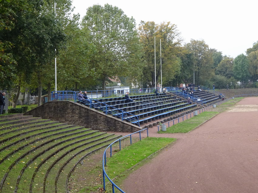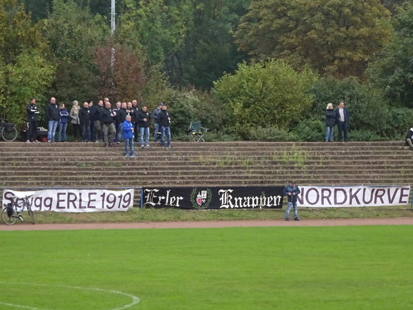 Weiter ging es nach Erle in die verbotene Stadt. Als ich mein Rad abgestellt hatte, rannte ich direkt mal Sascha in die Arme und Thomas, den ich schon ‚Am Hallo‘ unerwartet getroffen hatte, fand auch noch zu uns. Über die Schönheit der Stadt Gelsenkirchen lässt sich (nicht!) streiten, das ändert aber nichts an der Tatsache, dass es dort überdurchschnittlich viele ansehnliche Anlagen und Stadien gibt. An der Oststraße in Erle steht eine solche Perle. Für 15.000 Zuschauer war das weite Oval einst zugelassen. Ob diese Kapazität auch nur mal ansatzweise ausgereizt wurde, wage ich stark zu bezweifeln. Wie auch heute dürften sich über die Stehtribüne und auf der unüberdachten Sitztribüne meist nur wenige, vielleicht mal einige hundert Zuschauer verteilt haben. Über die Geschichte dieses nostalgischen Stadions lässt sich leider nicht viel herausfinden. Die Gäste aus dem Halterner Ortsteil Lippramsdorf zeigten sich von dem wuchtigen Rund aber nur wenig beeindruckt und schenkten den Gastgebern ein halbes Dutzend ein. Hätte auch noch schlimmer kommen können – die Erler Deckung zeigte eklatante Lücken. Zwar steckte die Spielvereinigung nie auf, aber ernsthaft in Bedrängnis kam die Gäste-Defensive nur selten. Dabei genossen die Erler sogar die Unterstützung einer Fan-Gruppierung, die aber prinzipiell nur durch drei Banner am Zaun auffiel und die mitgebrachte Trommel und die Stimmbänder genau ein einziges Mal bemühte.