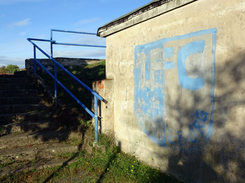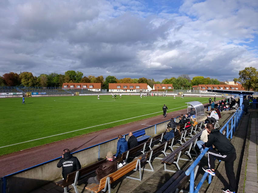 In dieser leidigen Virus-Epoche muss man flexibel bleiben. Der erste Teil von Plan A kippte am Freitag-Mittag aufgrund der Corona-bedingten Absage des anvisierten Spieles. Plan B war letztlich eher ein Plan C, aber wenn Teil 2 von Plan A noch umgesetzt werden wollte, war das noch die angenehmste Lösung. Soweit alles verstanden? Magdeburg hieß also nun ganz unverhofft das Ziel am heutigen Samstag. Während der große FCM einige Kilometer verzweifelt um Drittliga-Punkte kämpfte, begab ich mich ins Heinrich-Germer-Stadion des MSC Preussen. Schon ein netter Ground mit rund um die Laufbahn angelegten Rängen, die auch nicht mehr komplett im besten Zustand sind und wohl nur noch auf der Hauptseite Nutzung erfahren. Landesliga wird hier gespielt, siebtklassig ist das auf Sachsen-Anhaltinischer Ebene, was sich schlimmer anhört als es ist. Zu Gast war der TSV aus dem nahen Kleinmühlingen, der sich bereits im Abstiegskampf befindet, während der MSC oben dabei ist. Spielerisch war es einigermaßen anzuschauen. Die Preussen reduzierten sich durch eine Tätlichkeit zwar schon nach einer halben Stunde um einen Spieler, waren aber insgesamt dennoch das bessere Team und gewannen verdient. Was gar nicht ging, waren die Äußerungen der mitgereisten etwa 30 Gäste-Sympathisanten und von der Ersatzbank des TSV. Ich bin kein Kind von Traurigkeit, aber was da 90 Minuten auf die MSC-Spieler und die Unparteiischen in voller Lautstärke einprasselte war unter aller Kanone. Auch wenn es von der reinen Wortwahl (meist) beim üblichen Fußball-Gepöbel blieb, hatte man den Eindruck, dass jedem Gast vorm Spiel ein großer Becher Blut gereicht worden war. Mein Respekt gehörte dem Schiri-Assistenten vor der Gästebank, der die Show meist seelenruhig ertrug in und in einigen Momenten die passenden Worte fand.