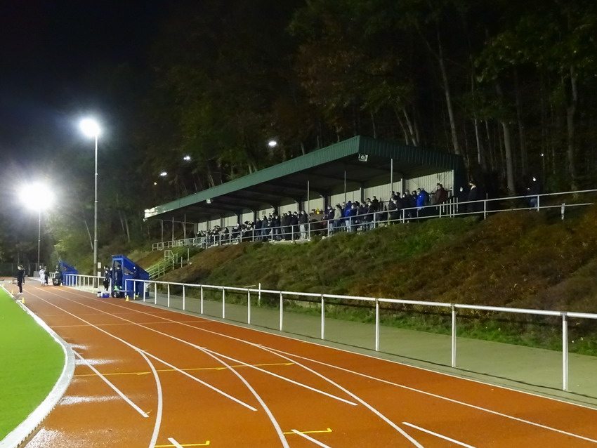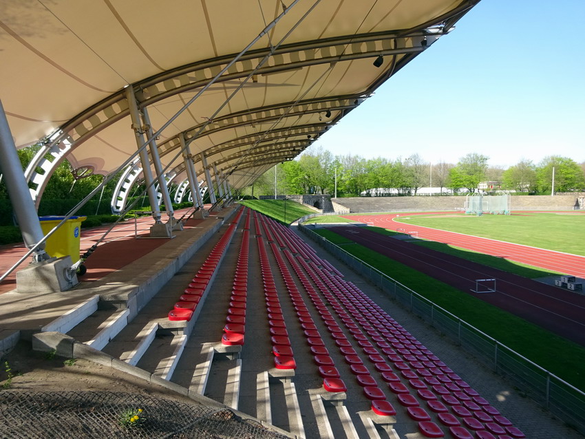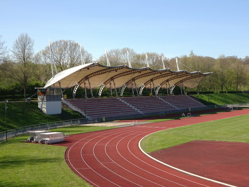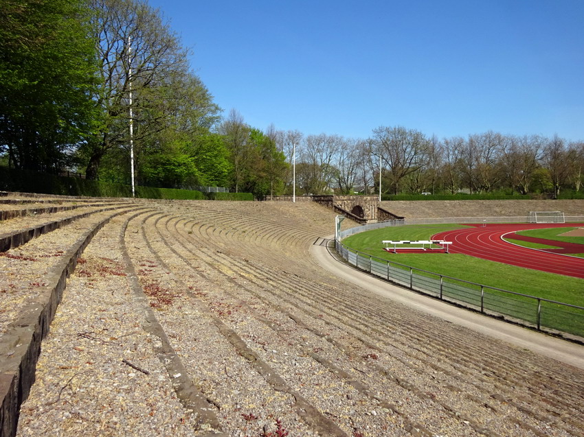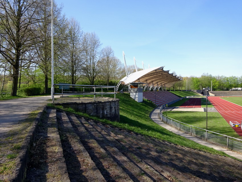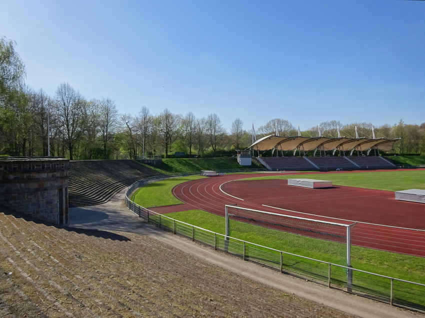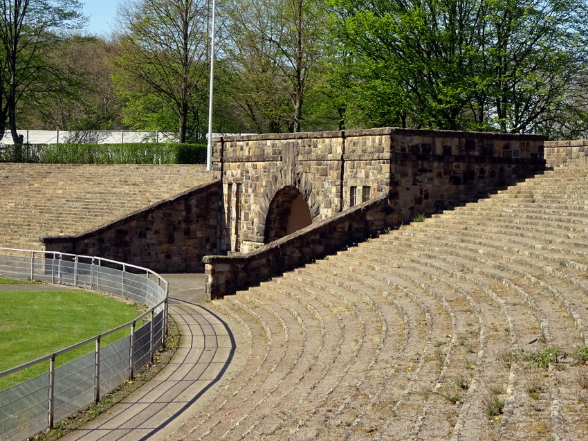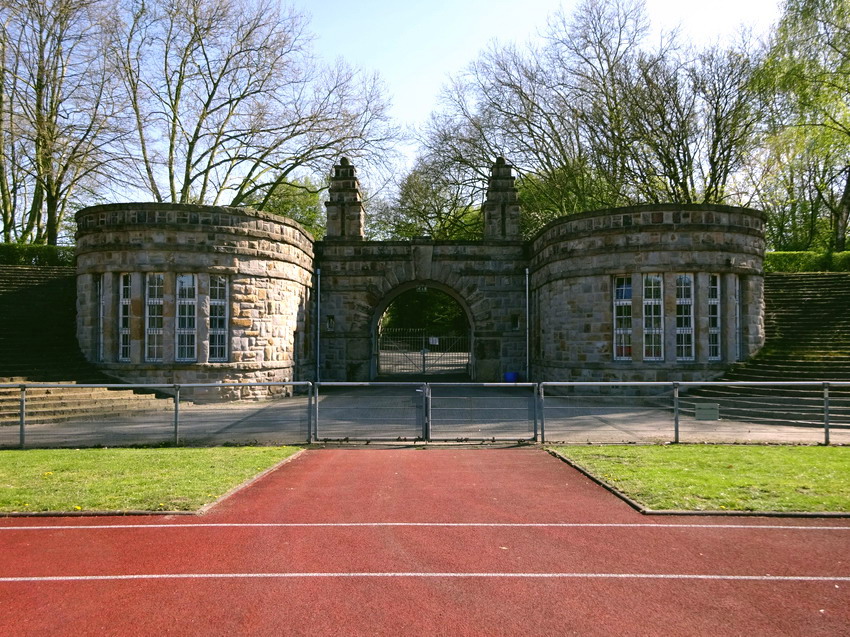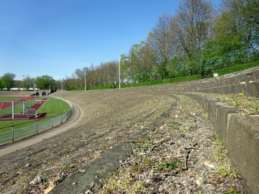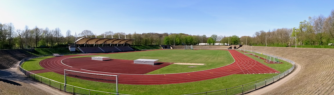 Als ich während der ersten Lockdown-Phase viel mit dem Rad unterwegs war, führte mich der Weg auch mal ins nahe Gladbeck. Ziel war dort die ‚Vestische Kampfbahn‘, welche heute nur noch den lieblosen und charakterfreien Namen ‚Stadion Gladbeck‘ trägt. Mein erster Besuch hier hat in den frühen 90er Jahren stattgefunden. Der glorreiche RWE trug ein Freundschaftsspiel aus, welches dick und fett zweistellig gewonnen wurde. Den Gegner kann ich allerdings nicht mehr sicher benennen. Blass kann ich den Nebelschwaden den Namen VfB Kirchhellen erkennen, aber wirklich sicher bin ich mir nicht. Ein weiteres Mal weilte ich vor einigen Jahren zum Pokalfinale des Kreises Gelsenkirchen in diesem wundervollen Rund. Fußballspiele finden eher selten in der Kampfbahn statt. Diese wird überwiegend für leichtathletische Disziplinen genutzt. Was schade ist. Denn das unter Denkmalschutz stehende Stadion ist genauso beeindruckend wie gepflegt. Mit seinem wuchtigen Hauptportal, den weiteren beiden Zugangstunneln und den weitläufigen, unbefestigten Rängen fühlt man sich in andere Zeit versetzt. Genau 37.612 Zuschauer finden Platz, 1.400 davon auf der Sitztribüne, die erst vor gut zehn Jahren mit einer zeltartigen Konstruktion überdacht wurde. Bis in die 80er Jahre waren Sitzplätze überhaupt nicht vorhanden und die weiten Ränge boten ausschließlich Stehplätze. Eröffnet wurde die Kampfbahn 1928. Einen dauerhaft nutzenden Verein gab es nie. In den Jahrzehnten vor und nach dem Krieg wurden einzelne Endrunden-Spiele um die westdeutsche Meisterschaft und die deutsche Meisterschaft ausgetragen. Die STV Horst-Emscher ging zu Zeiten der Oberliga West der Fußlümmelei in der Kampfbahn nach. Nach der Jahrtausendwende spielte Germania Gladbeck zu Oberliga-Zeiten im Stadion und auch der SV Zweckel war kurzzeitiger Nutzer. Wenn sich die Gelegenheit bietet, werde ich sicher mal wieder in diesem Stadion zu Gast sein.