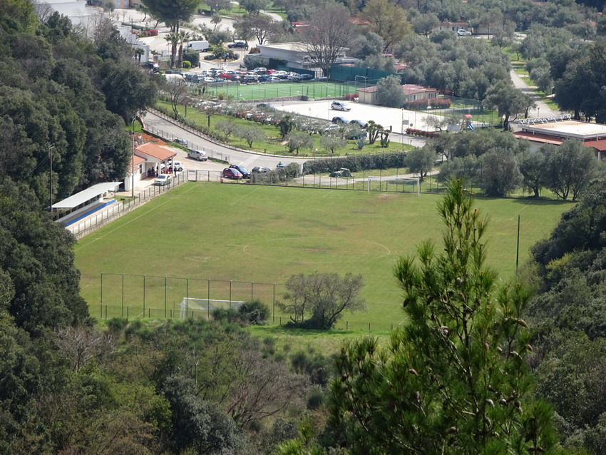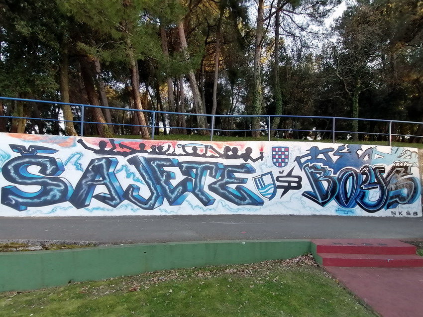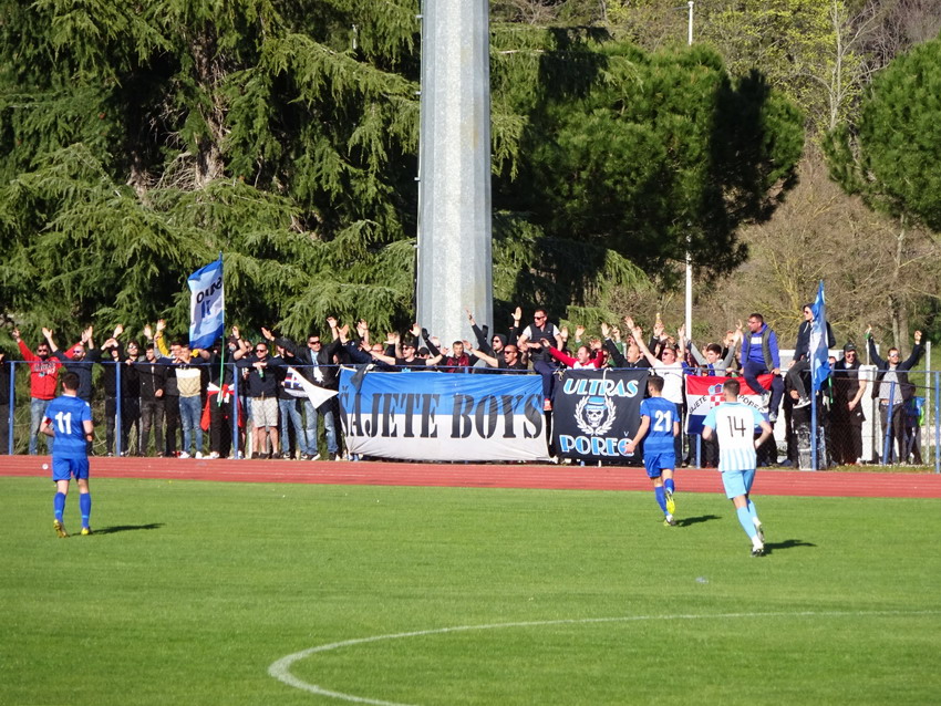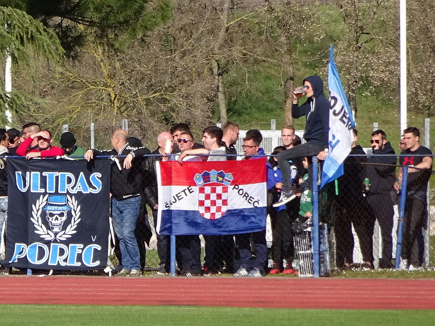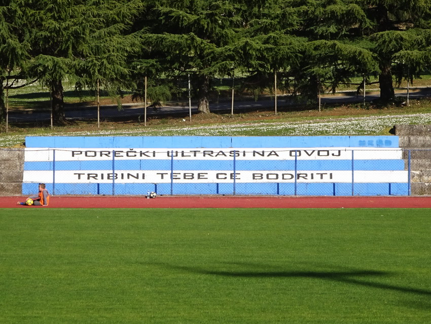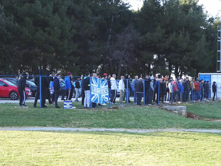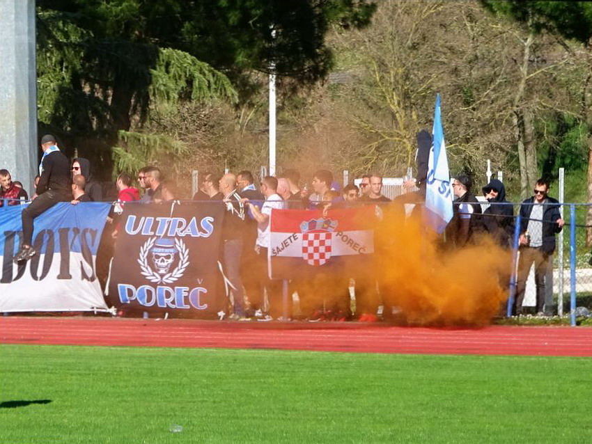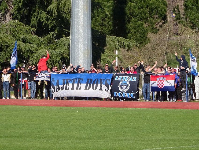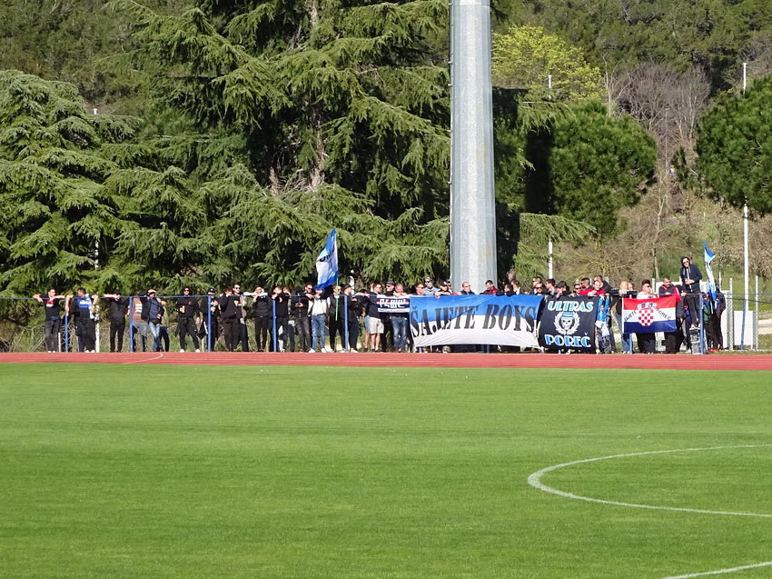 Der letzte Urlaubstag eröffnete noch eine Möglichkeit für einen Spielbesuch. Der Weg führte mich nach Porec, einen beliebten Touri-Ort an der Adria-Küste, zum Drittliga-Spiel zwischen dem gastgebenden NK Jadran und den Gästen von Pazinka Pazin. Auf beiden Seiten gibt es schon lange Jahre existierende Ultra-Gruppierungen. Beim NK Jadran sind das die ‚Sajete Boys‘ und beim NK Pazinka treibt die ‚Plava Legija‘ – oder ‚Blue Legion‘ – ihr Unwesen. Angeblich bedingte die Gründung der Plava Legija die Gründung der Sajete. Vor über 30 Jahren war das der Fall und seitdem besteht eine gesunde Rivalität, die wohl regelmäßig auch mal außerhalb der Stadionmauern diskutiert wird, dann aber meist weitestgehend wortlos. Auf freundliche Nachfrage erhielt ich Zugang zum Gelände. Mir war einigermaßen klar, dass die Sajete trotz des Zuschauer-Ausschlusses supporten würden. Das ließ sich anhand von Fotos auf der Facebook-Plattform des Vereins erahnen und so war es dann auch. Die Anlage ist von außen gut einzusehen und die Zäune nicht allzu hoch. Mit Spielbeginn begab sich ein 50 Mann-Mob hinter den Zaun einer Kurve und gab Stoff und das beinahe durchgehend. Nicht gerechnet hatte ich damit, dass sich auch tatsächlich ein Dutzend Leute der Plava Legija hier einfinden würde. Die Gäste-Ultras hefteten ein Banner an den Zaun des hinter der Tribüne liegenden Parkplatzes, klopften auf der mitgebrachten Trommel herum und verschafften sich auch ab und an Gehör. Überhaupt war das Spiel nicht schlecht besucht. Zum einen schienen die Kriterien, hereingelassen zu werden, nicht allzu hoch zu sein und außerdem sammelten sich hinter dem Zaun reichlich Interessierte. Sportlich war es ein riesiger Unterschied zu den beiden vorher gesehenen Spielen. Es war einfach viel athletischer, flüssiger in der Bewegung, technisch feiner, was da abgeliefert wurde. Die Gastgeber konnten das Spiel verdient für sich entscheiden. Das Ergebnis war irgendwie kroatisch, denn eine wahre Torflut erlebt man dort ja eher selten, auch wenn das eher für das Oberhaus gelten dürfte, wo gefühlt jedes zweite Spiel 1:0 ausgeht. Und genauso war es auch hier und heute der Fall. Für den Siegtreffer musste dann auch ein Elfmeter früh in der ersten Halbzeit herhalten, der mit einer dünnen Rauchsäule gefeiert wurde. Jadran darf sich noch Hoffnungen auf die Aufstiegs-Playoffs zur Liga 2 machen. Pazinka dagegen muss aufpassen, nicht noch übel in die Abstiegsränge zu rutschen. Kurz vor dem Spielschluss löste sich ungefähr die Hälfte der Sajete und latschte Richtung Ausgang, was mich wunderte, denn es galt ja noch die Mannschaft für den Sieg zu feiern. Die Lösung offenbarte sich kurz nach dem Abpfiff. Als die Pazinka-Leute ihre Sachen gepackt hatten und zu ihren Fahrzeugen gingen wurde seitens der Sajete noch mal handfest nachgefragt, ob es Ihnen in Porec denn auch gefallen hat. Die Staatsmacht war aber zügig zu Stelle und löste das kleine Scharmützel ohne übertriebenen Einsatz auf.