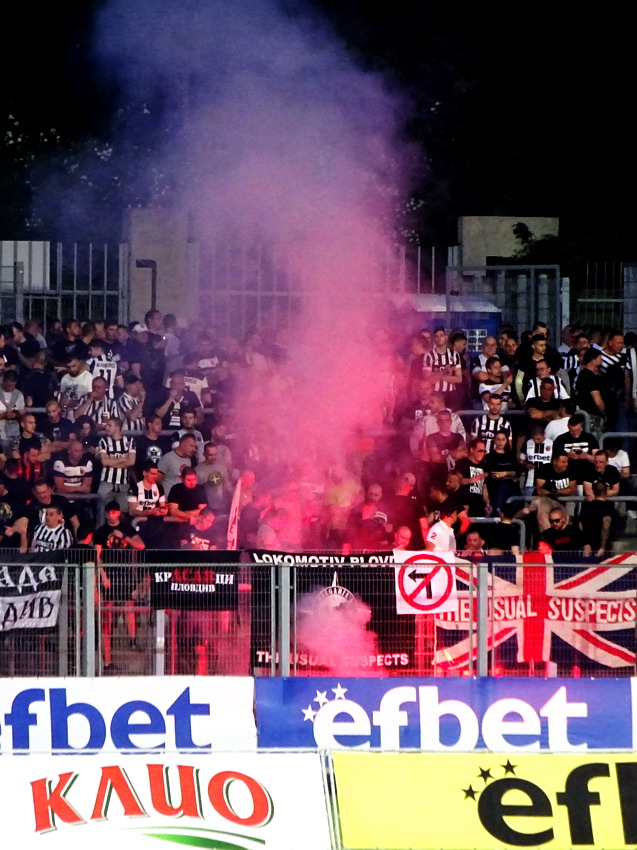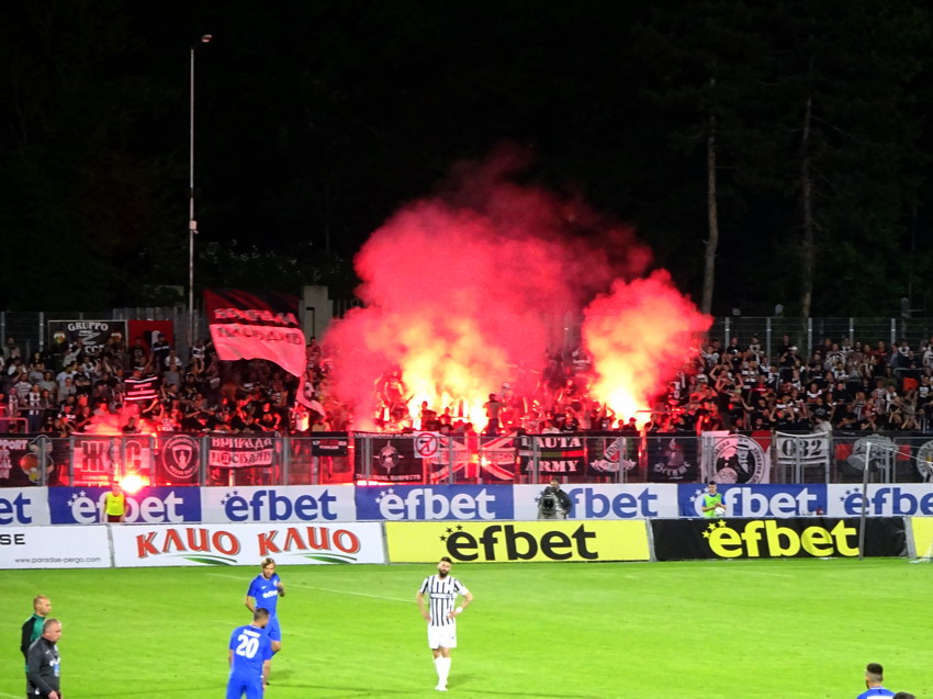 Die Zeit zwischen den Spielen reicht genau aus, um mit der Dame im Happy-Grill den kurzberockten Bedienungen auf den Hintern zu glotzen und eine kleine Mahlzeit einzunehmen. Bulgarien-Kenner ist diese Restaurant-Kette ein Begriff. Eigentlich kehre ich da nicht mehr ein, denn das Konzept dieser Läden sieht ja nur vor, die Kunden mit mehr oder minder attraktivem Personal hereinzulocken und dann zu kleine Portionen in eher durchschnittlicher Qualität zu servieren. Die Faktoren Zeit und räumliche Nähe gaben dem Fleischbräter aber den entscheidenden Zuschlag. Meiner Königin war das eine Spiel am späten Nachmittag ausreichend um das Fußballverlangen zu stillen ;-). Also trennten sich die Wege und ich machte mich allein auf den Weg zum Stadion Ticha, wo ich wieder auf die Kölner Vertreter traf. In der höchsten bulgarischen Spielklasse herrscht ja erst recht Alkoholverbot, aber wo der Durst ist, gibt es auch immer einen Weg. In der Theorie hätte dieses letzte Spiel der Quali-Runde für die Conference League – die Liga wurde nach der Hauptrunde in Meisterrunde, Conference League-Quali und Abstiegsrunde geteilt – ein richtiger Kracher werden können. Dummerweise hatte sich aber am vorletzten Spieltag schon alles entschieden. Levski, zweiterfolgreichster Club des Landes und der Verein mit den meisten Anhängern, war dennoch mit einer guten Anzahl an Supportern angereist, so dass die Veranstaltung abseits der fehlenden sportlichen Bedeutung einigermaßen okay war. Leider wurde jegliche optische Aufwertung vermisst. Levski konnte den Rückstand aus dem ersten Durchgang in Hälfte zwei ausgleichen und kurz vor dem Ende noch den Siegtreffer erzielen. Der Sieg wurde dann intensiver gefeiert, als eigentlich würdig, was aber mit dem anstehenden Geburtstag des Vereins zu tun hatte. Nach dem Spiel verabschiedete ich die Kölner Kollegen, die den Nachtbus nach Sofia erreichen mussten, unterhielt mich noch mit zwei anderen Angehörigen der Bewegung und schlurfte dann in Ruhe zu meiner Dame ins Hotel.
