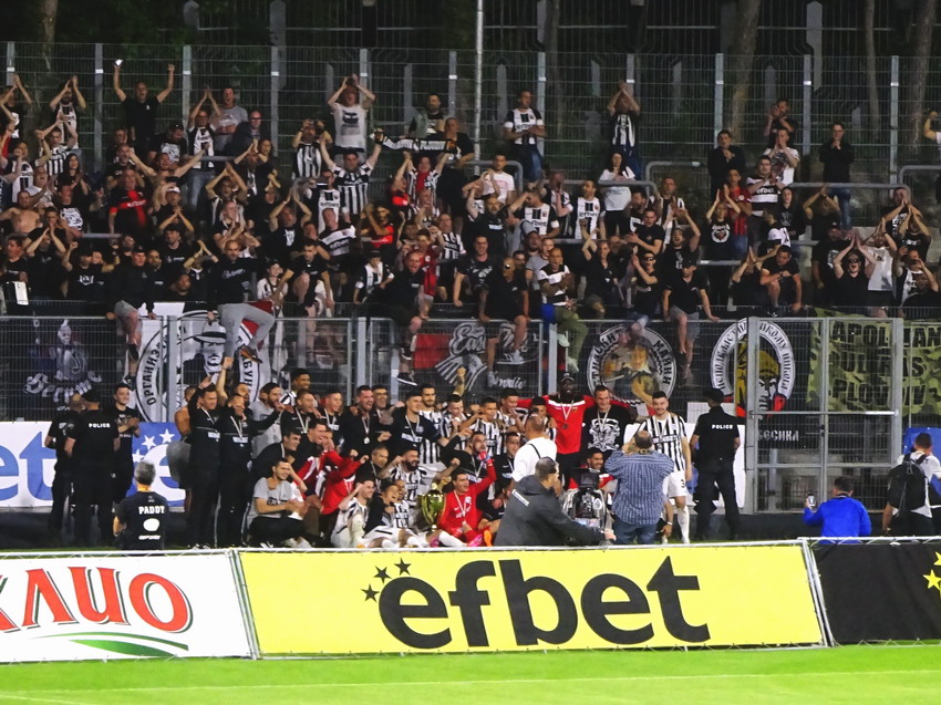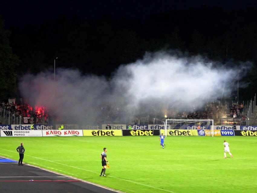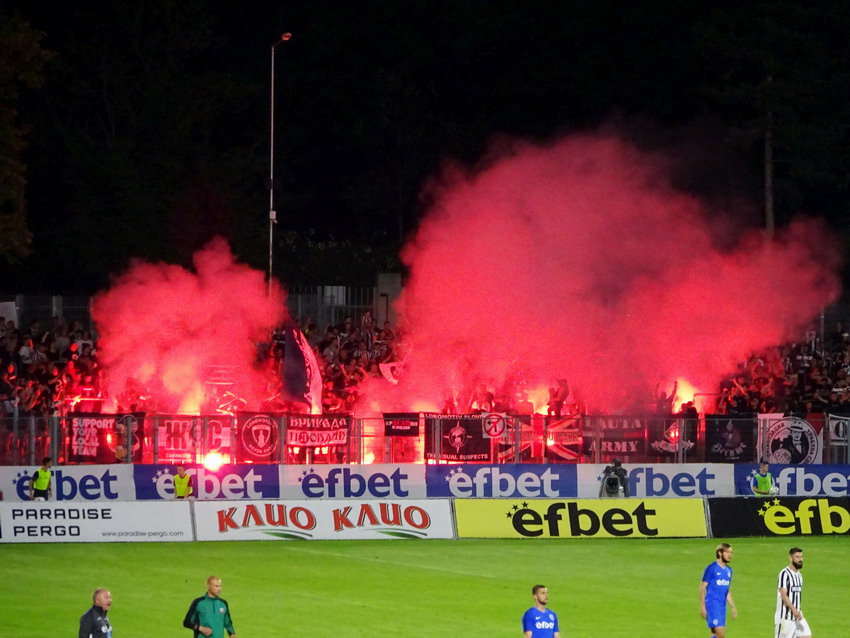 Die Gastgeber wollten ihren Fans – mit circa 700 Leuten wurde eine für bulgarische Verhältnisse sehr gute Zuschauerzahl erreicht – die Party nicht vermiesen und siegten souverän. Aus Silistra, an der Donau und damit der Grenze zu Rumänien gelegen, war auch ein Dutzend Anhänger angereist, die mal eine Wolke in den Vereinsfarben steigen ließen und ihr Team unterstützten. Der bessere Support kam natürlich aus dem Heimblock, wo an die hundert Aktive Gas gaben. Nicht überraschen trafen wir Franky, DiWa und Martin, Anhänger des Vereins mit dem Geißbock im Wappen. Das Spiel wurde also angemessen bei ins Stadion geschmuggeltem Pivo verquatscht. Der Wirt der Vereinsgastronomie machte noch Anstalten, uns in den Hals zu beißen, als wir nach Bier für das Stadion fragten, aber mit dem Hüpfer über den Zaun und dem kurzen Gang zur Imbissbude war das dann auch geklärt. Bei hohen Außentemperaturen soll man ja schließlich für stete Flüssigkeitszufuhr sorgen. Dass der Spartak-Anhang die Meisterschaft noch mit einer ordentlichen Pyro-Einlage feierte, erfuhr ich leider erst später. Das Stadion erst zehn Minuten nach Spielschluss zu verlassen, war also immer noch zu früh.