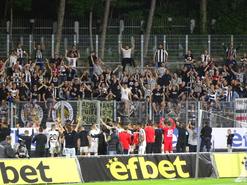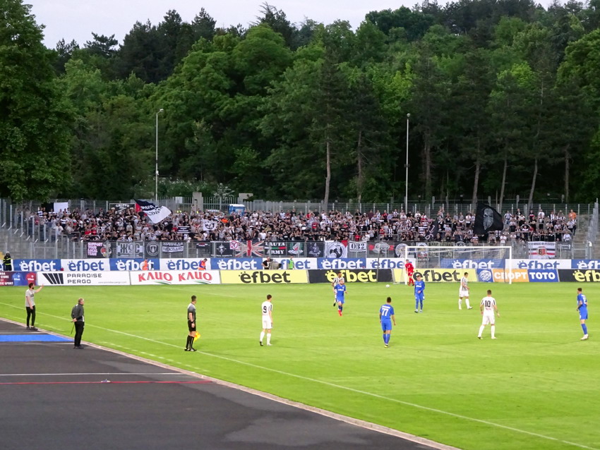 Der Sonntag bot die Chance zwei Spiele in Varna zu besuchen. Bei hochsommerlichen Temperaturen machte Drittligist Spartak den Anfang, das nicht mehr lange Drittligist ist. Spartak hat die eigentlich für bulgarische Clubs üblich wechselvolle Geschichte im Gepäck. Die Nummer lief ja eigentlich immer so oder so ähnlich… während der sozialistischen Epoche erfuhren die Clubs mal die eine oder Umbenennung, wurden in manchen Fällen auch mal zwangsfusioniert. Nach der Wende wurde es dann agil. Vereine wurde von dubiosen Mäzenen und Investoren übernommen und entweder fahrlässig kaputtgewirtschaftet oder für kriminelle Machenschaften missbraucht. Irgendwann war der Spuk dann vorbei, die waren Vereine pleite und fingen unterklassig wieder an. Manchmal gründeten verärgerte Fans auch einen neuen Verein, der dann – im besten Falle an die Stelle das alten trat oder eben eine Parallel-Existenz führte. Bei Spartak war es ein bisschen von allem. Bis vor gut zehn Jahren war es eigentlich noch ein halbwegs normaler Verein, der mal europäisch spielte, mal abstieg, mal aufstieg. Dann ging aber hier das Theater los und letztlich entstand der heutige Club aus der Fusion des ursprünglichen Vereins und einer Neugründung von Fans. Bereits am vorherigen Spieltag wurde der Aufstieg in die zweite Liga unter Dach und Fach gebracht, so dass heute nur Schaulaufen angesagt war.