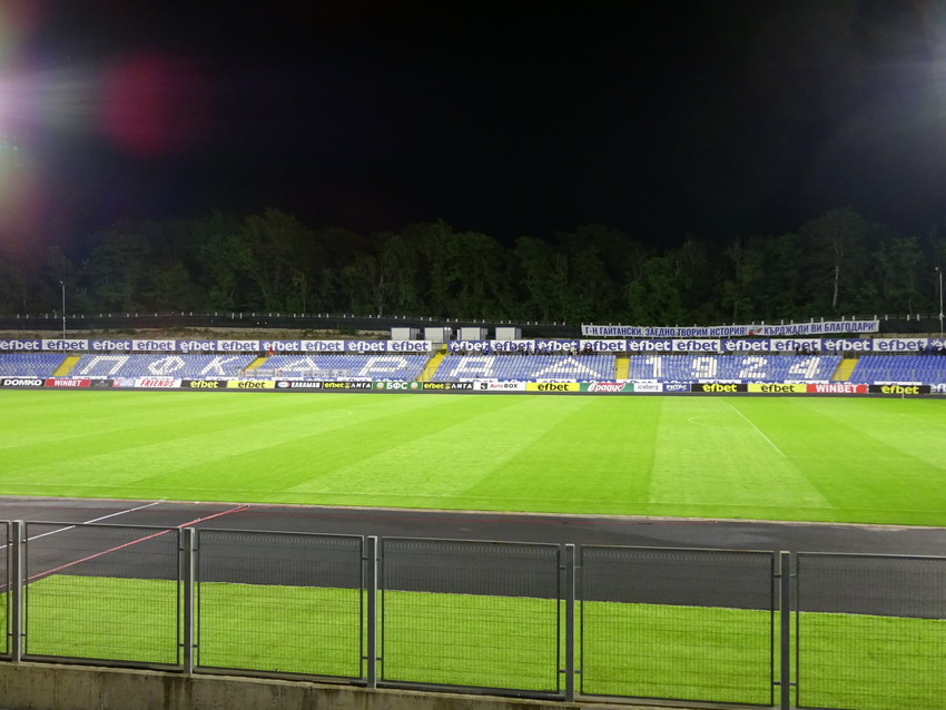 Der neue FC Chernomorets wurde 2015 von Fans gegründet. Die Heimspiele werden im alten Stadion Chernomorets ausgetragen, das eigentlich schon aufgegeben war. Pläne für ein modernes neues Stadion gibt es schon lange, aber die Umsetzung hat landesüblich nie stattgefunden. Der Vorgängerverein trug die Spiele im modernen Stadion Lazur aus, das alte Stadion verwilderte. Erst 1919 wurden die Ränge aufwändig von den wild wuchernden Pflanzen befreit, das Spielfeld wieder nutzbar gemacht. Seitdem trägt der Verein seien Spiele dort aus und müht sich aus der Dritten Liga nach oben zu kommen. Dass die Ränge des Stadions einst rundherum mit Sitzbänken ausgestattet waren, beweisen nur noch die steinernen Stümpfe die den Bänken Halt gaben. Lediglich auf der Hauptseite wurden neue Sitzschalen montiert, um dem aktuell (noch?) überschaubaren Publikum Platz zu geben. Die mächtige Anzeigetafel ist von einem zerrissenen Werbebanner verdeckt. Das weite Rund versprüht trotz oder gerade wegen seines Zustandes den Charme vergangener Zeiten. Eine kleine Gruppe fand sich zusammen und supportete das Team während der zweiten Spielhälfte, beflügelt von einigen verzehrten Bieren. Wie auch in den letzten beiden Jahren, scheint der Aufstiegstraum jedoch auch in dieser Saison knapp verpasst zu werden. Eine theoretische Chance bestand allerdings noch. Die Gäste aus Karlovo waren nicht in der Lage diese Theorie zu gefährden. Die Hoffnung stirbt also wohl erst am letzten Spieltag.