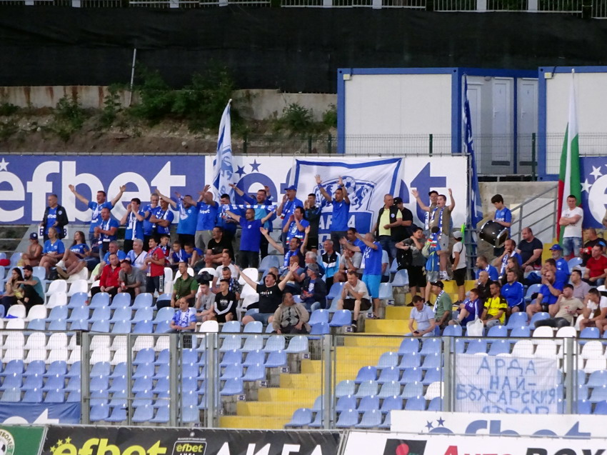 Aufgrund von Corona-fällen bei einer teilnehmenden Mannschaft wurde ein kompletter Spieltag in der Meisterrunde verschoben. Das kam mir zu Gute, denn es ermöglichte einen weiteren Spielbesuch. Dafür müssten wir Kardzhali im Süden des Landes, in den östlichen Ausläufern der Rhodopen gelegen, ansteuern. Das ist eine ganz schöne Ecke dort, wie ja Bulgarien allgemein recht aufregende Landschaften zu bieten hat. Ein starker türkischer Einschlag ist in dieser Gegend nicht zu übersehen, was nicht nur an den Minaretten zu erkennen ist, die sich an vielen Stellen in den Himmel recken. Auch der FC Arda hat die übliche Pleite hinter sich. Interessanter Weise spielte der Club bis dahin kaum eine Rolle im bulgarischen Fußball. Nach der Neugründung 2015 und dem Start in der vierten Liga, wurde aber befeuert von Sponsorengeldern in Windeseile der Weg in die erste Liga angetreten. Sportlich war auch diese Partie nicht mehr von Bedeutung. Die Gastgeber hatten sich bereits für das Final-Duell um einen Startplatz in der Conference League gegen Cerno More Varna qualifiziert und Loko hatte die Vize-meisterschaft sicher. Das hinderte den Gäste-Anhang um die Lauta Army aber nicht daran, zahlreich hier aufzudribbeln. Gut 700 Leute werden es am Ende gewesen sein, die sich die Überreichung einer sinnlosen Trophäe nach dem Schlusspfiff nicht entgehen lassen wollten. Um die Fanszene des FC Arda ist es dagegen nicht so gut bestellt. Bei den Stadiongängern handelt es sich um ein Feierabendpublikum. Lediglich eine Handvoll wenig ernst zu nehmender Leute fanden sich auf der Gegenseite des 08/15-Mehrzweckstadions, das ungeachtet seiner Ausstrahlung protzig Arda-Arena benannt ist, mit ein paar Fahnen und einer Trommel ein, um die Utensilien dann nicht zu benutzen. Da ging es im Gäste-Sektor schon lebhafter zu. Dauersupport mit hoher Mitmachquote und eine schöne Pyro-Aktion gab es zu hören und sehen. Auch auf dem Platz wurde dem interessierten Fußball-Touristen etwas geboten. Sechs Tore gab es zu sehen und dabei schaffte es Loko aus einem 1:3-Zwischenstand noch ein Remis herauszuklopfen. Während es für Kardzhali noch ein weiter Weg bis zur Fußballstadt ist, bat die Loko-Kurve ihr Team nach einer starken Saison zum Gruppenbild.