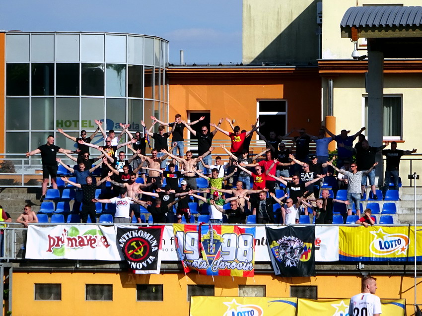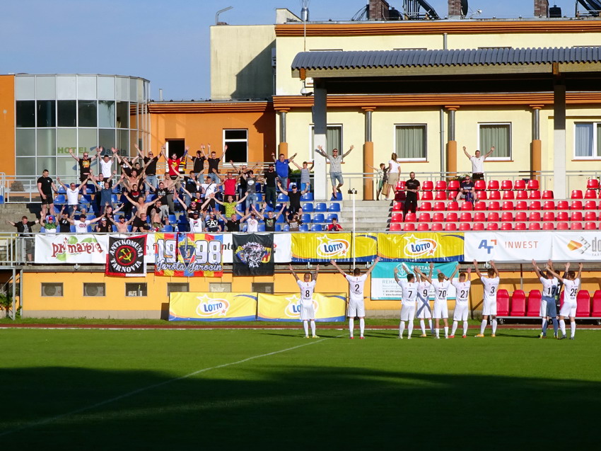 Noch bevor ich das Kölner Dreigestirn unverabredet in Varna traf, hatte ich mit diesen vereinbart, Fronleichnam für ein langes Polen-Wochenende zu nutzen. Martin musste letztlich passen. Am hochheiligen Fronleichnams-Tag zur äußerst unchristlichen Uhrzeit um sechs Uhr war Treffpunkt irgendwo an einem Autobahnzubringer in der nördlichen Hagener Peripherie. Franky war der Fahrer und spulte die 800 Kilometer trotz zweier Staus unbeeindruckt in neun Stunden ohne Gezeter ab. Viertliga-Gerümpel vor überschaubarer Kulisse war dort angesagt. Aus dem Hotelzimmer schauten wir direkt ins kleine Stadion und für einen ersten Halben des goldblonden Erfrischungsgetränks reichte es auch noch. Vom Spiel war nicht viel zu erwarten. Jarota brauchte freilich noch dringend Punkte gegen den Abstieg, während die Gäste hoffnungslos mit mageren vier Pünktchen und noch sieglos das Tabellenende zierten. Daran änderte sich heute nichts. Ohne spielerischen Glanz zu versprühen, wurde diese Partie überaus deutlich durch die Gastgeber entschieden. Auf der Haupttribüne des Stadions sammelten sich zwei Dutzend Kibole zur Unterstützung ihres Teams und rissen während des zweiten Durchgangs auch noch vier Fackeln an, die natürlich bei gleißendem Sonnenlicht nicht sonderlich zur Geltung kamen. Aber vier Fackeln am hellichten Tage wirken immer noch besser als gar keine Fackel! Die Gastmannschaft wurde von zwei älteren Herren begleitet, für die sogar der Gästekäfig aufgeschlossen wurde. Dass dieses völliger Schwachsinn war, wurde der Ochrona in der Halbzeit dann auch endlich mal klar und das Rentner-Duo dürfte ganz normal auf der Gegentribüne Platz nehmen. Nach dem Spiel gestaltete sich die Suche nach einem Biergarten mehr als schwierig so, dass der Abend schließlich im Außenbereich einer Grillbude seinen Lauf nahm. Auch schön.