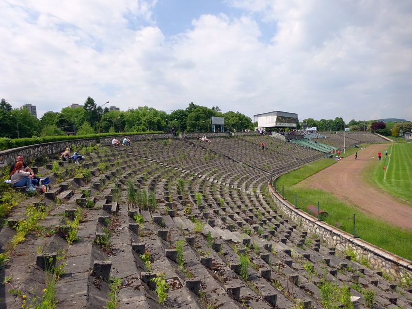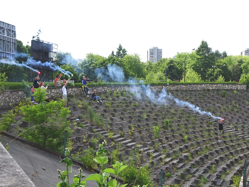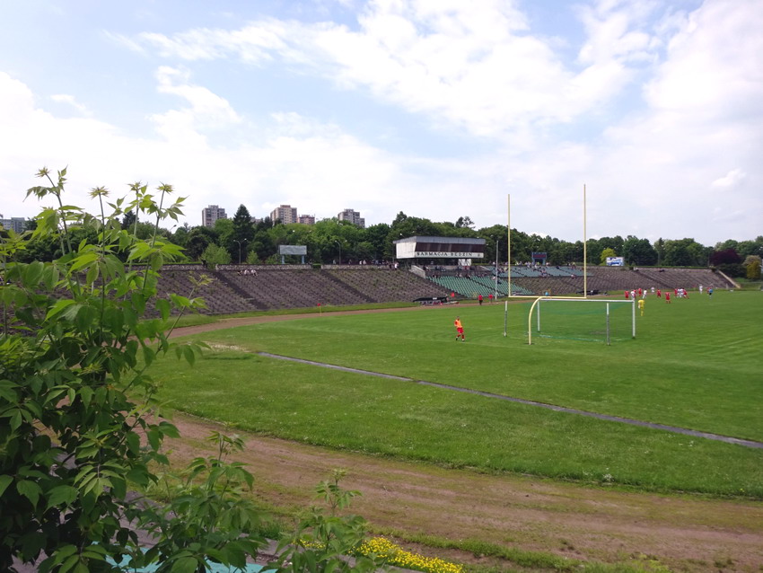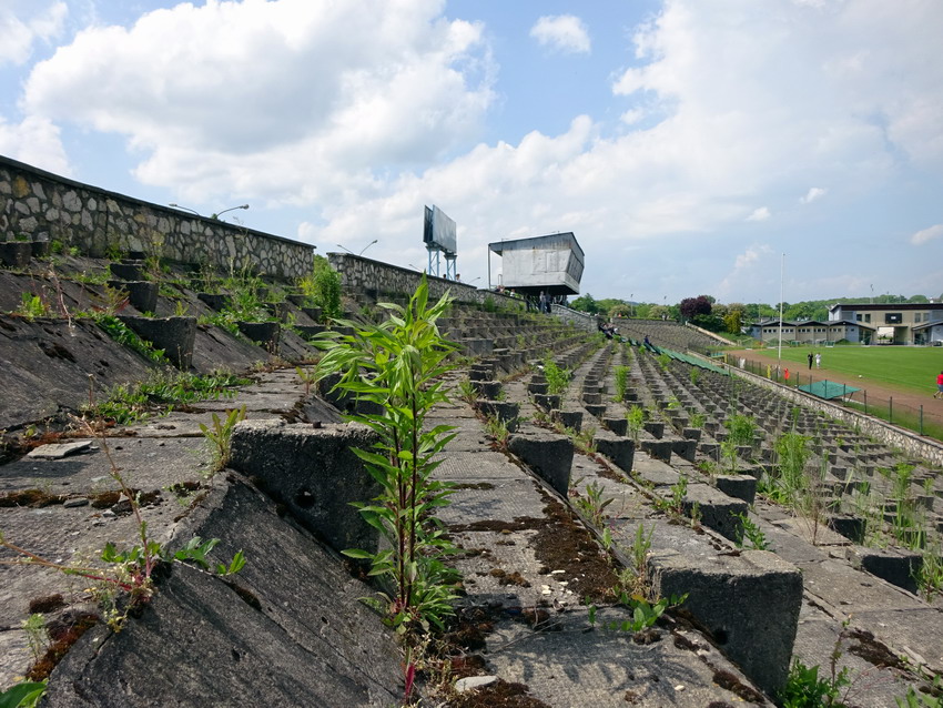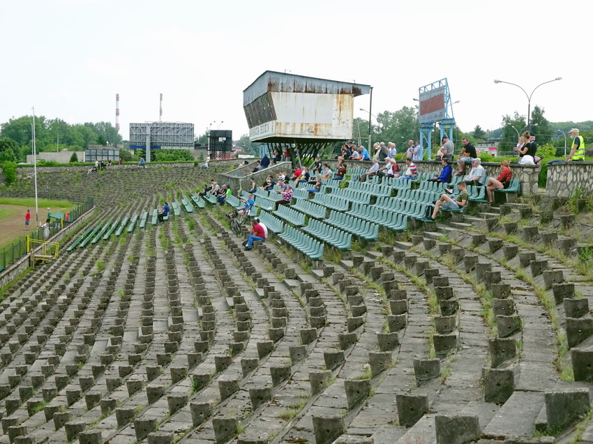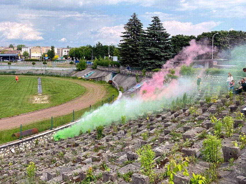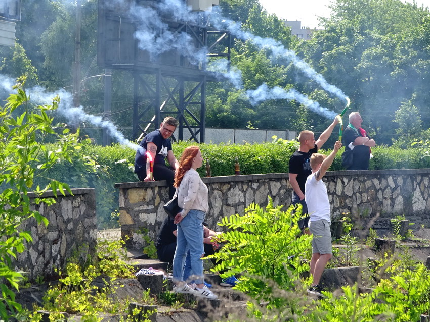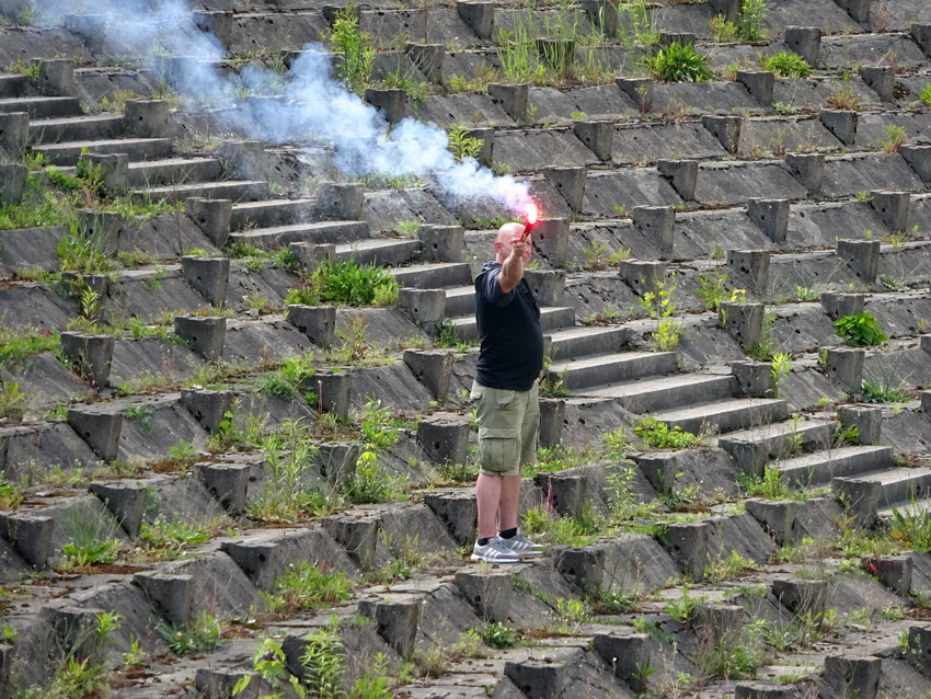 Und so war dann die Reisegruppe um viertel nach zehn wieder vereint. Die beiden Kölner sammelten mich planmäßig am Autobahnzubringer ein, wo ich mich per Taxi hinbegeben hatte. Etwas mehr als zwei Stunden später kamen wir in Bedzin an, etwas nordöstlich von Katowice gelegen. Nicht unerwartet trafen wir dort auf weitere bekannte wie auch unbekannte Gesichter der Bewegung. Kein Wunder, Spiele um die Mittagszeit gab es nicht viele und diese Ground-Perle zog die Leute magisch an, obwohl ihr die Gegenseite amputiert wurde. Anstatt einer betagten und von den Jahrzehnten gezeichneten Tribüne steht dort nun eine Halle, die welchem Zweck auch immer dient. Aber auch so lässt dieses Stadion die Herzen höherschlagen. Absoluter Hingucker ist der alte Sprecher-Turm, ein Relikt aus einer vergangenen Fußball-Epoche. Dabei hat das Stadion gerade einmal etwas mehr als 50 Jahre auf dem Buckel, wirkt aber doppelt so alt, zumal die Natur an einigen Stellen begonnen hat, sich verlorenes Terrain zurückzuholen. Kleiner Fun-Fact am Rande – zur Eröffnung des Stadions trat der SV Werder gegen Polonia Bytom an. Samarcja schaffte es im letzten Jahrhundert nie höher als einige Jahre auf drittklassiges Niveau. Dass dieser Kawenzmann von Stadion seinerzeit errichtet wurde, ist nicht dem Fußball geschuldet, sondern der multiplen Nutzung, welche das weite Rund erfahren sollte. Aktuell spielt Samarcja fünftklassig und wird diese Liga aller Voraussicht nach am Ende dieser Saison verlassen. Allerdings nach unten. Mit einem Sieg gegen Szombierki wurde der Funke Hoffnung aber noch am Leben gehalten. Den Sieg im letzten Heimspiel der Saison feierten die wenigen Kibice mit ein wenig Pyro.