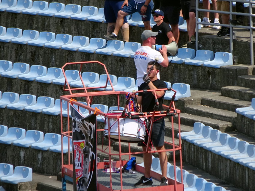 Eigentlich hatten wir reichlich Zeit und genau dieses sichere Gefühl hatte zur Folge, dass es am Ende knapper wurde, als nötig. Etwa 20 Minuten vor Spielbeginn standen wir vor dem Stadion, um dann feststellen zu dürfen, dass der Ticketverkauf nur online stattgefunden hatte. Corona-Vorsichtsmaßnahmen! Kontaktreduzierung! In Polen! Als wir noch rätselten, wie wir reinkommen, ging plötzlich ein Tor auf und da die kleine Ordnerin, die das Tor geöffnet hatte, völlig neben der Spur war, konnten wir unbehelligt einmarschieren… ähm sorry… rein marschieren… kleiner Scherz. Man muss auch mal Glück haben. Auf dem engen Platz hinter der Haupttribüne wurden dann munter ohne Abstand und Masken Getränke und Kielbasa verkauft. Soviel zu den Vorsichtsmaßnahmen. Nicht ganz 1.000 Zuschauer hatten sich eingefunden. Odra hatte noch eine kleine Chance auf einen Platz in der Aufstiegsrelegation. Die Gäste aus Tychy schmiedeten das heißere Eisen und waren fett im Geschäft um einen direkten Aufstiegsplatz. Eine Busladung Gäste-Kibice durfte auch anreisen und sich dann einfach im Heimbereich mit Getränken eindecken, um dann den Weg an das andere Ende der Tribüne anzutreten. Der Sektor Goscie blieb verschlossen. Auch wenn es keine Feindschaft zwischen Odra und Tychy gibt, so gibt es eben auch keine Freundschaft. Dennoch ließ die Odra-Szene dies alles ohne Widerstand gestehen. Das ist doch nicht Polen. Also man muss sich mal eine vergleichbare Situation in Deutschland vorstellen. Wenn z.B. in Kaiserslautern eine Busladung Regensburger durch den Heimbereich zu ihrem Platz latschen würde, gäb es auch ohne große Rivalität ordentlich Senge und das ohne Wenn und Aber. Der Odra-Capo konnte knapp 100 Leute um sich versammeln. Mehr als den zwischenzeitlichen Ausgleich konnten diese aber nicht herbeisupporten. Zu stark zeigten sich die Gäste, die am Ende aber zu hoch gewannen. Das Stadion wurde in den 30er Jahren für 25.000 Zuschauer erbaut. Wie die Haupttribüne sollte auch die Gegenseite mit einer neuen Tribüne versehen werden. Mittlerweile hat die Stadt aber beschlossen, komplett neu zu bauen. 2024 soll das neue Stadion fertig sein, aber man muss kein Prophet sein, um das für unwahrscheinlich zu halten.