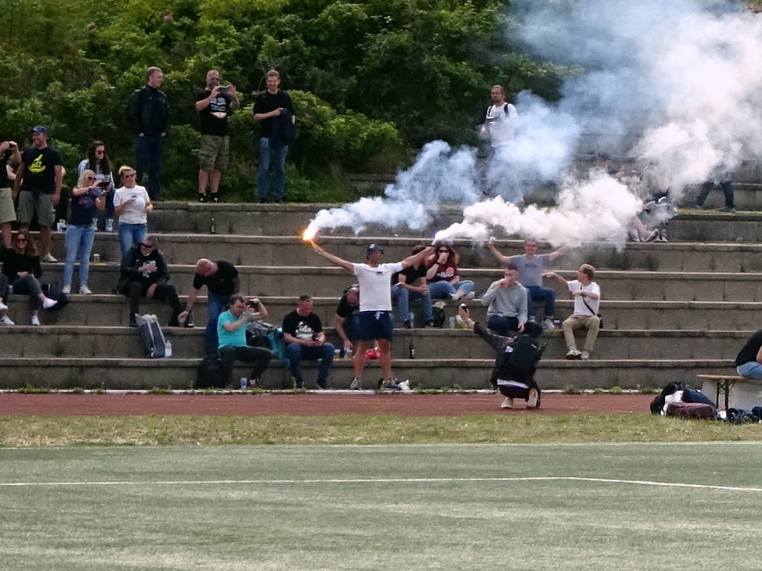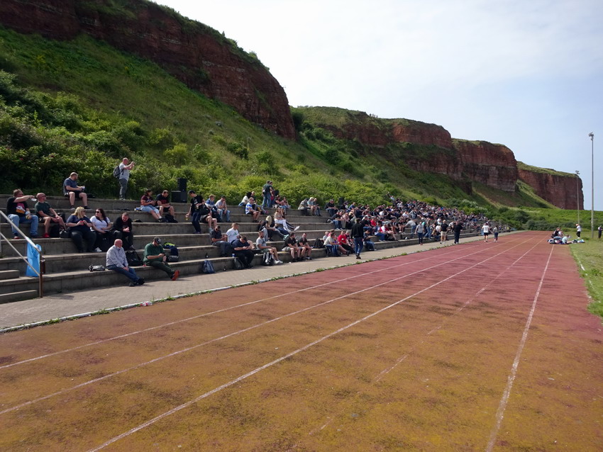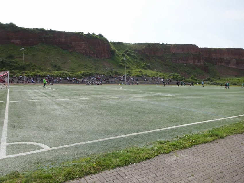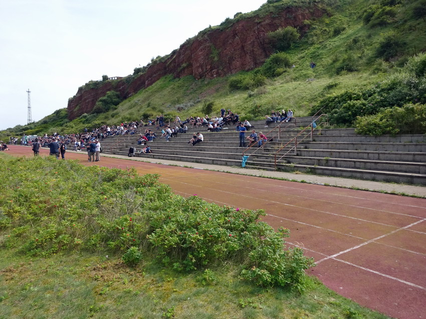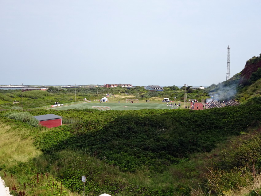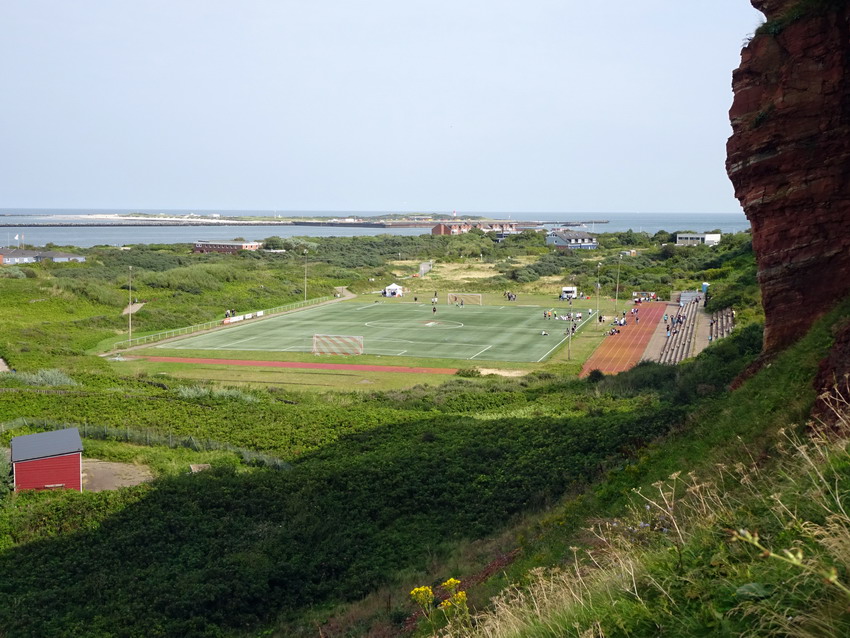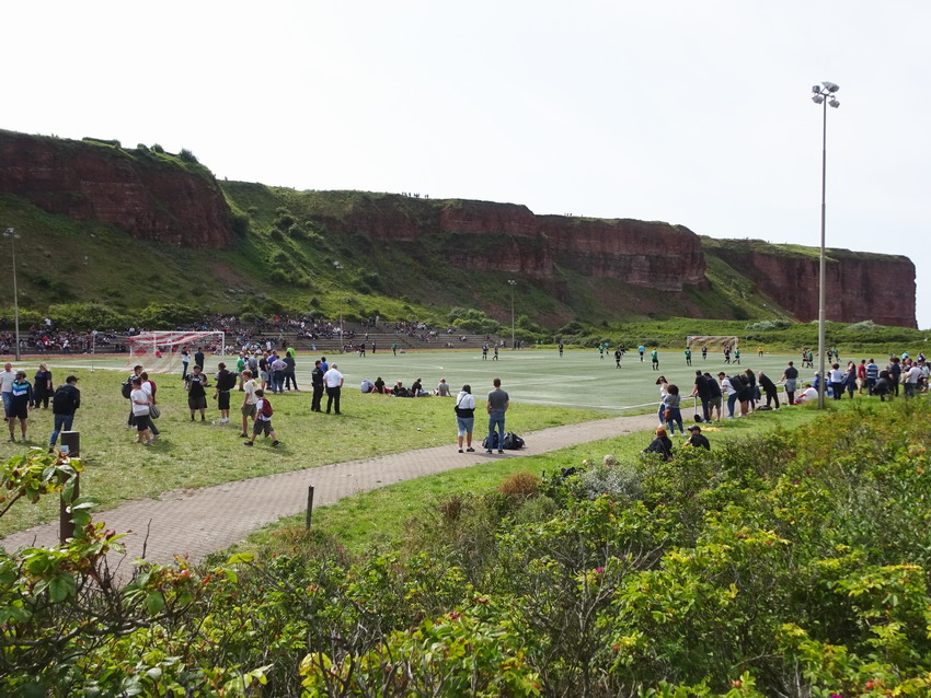 Ergo kam mir die heutige Veranstaltung ganz gelegen und so wurde wiederum die Dame eingepackt und ab ging es gen Norden nur dass es dieses Mal ein blutiger Tagesausflug war. Ein paar findige Jungs aus Braunschweig, der Bewegung selber nicht abgeneigt, hatten schon im letzten Jahr ein Spiel im für den Fußball nicht mehr genutzten Motodrom Halbemond organisiert und sich nun dem Sportplatz auf dem Nordostgelände verschrieben. Für dieses Spiel wurde für den Polizeisportverein aus der Löwenstadt ein Club aus der Gegend um Wilhelmshaven als Gegner begeistert. Helgoland geht sowieso mehr als ein Mal, das ist schon ein besonderer Flecken. Prinzipiell halte ich mich von derartigen Szene-Aufläufen ja fern, das ist nichts für ich, aber heuer freute ich mich irgendwie drauf, weil klar war, dass man neben Dutzenden Groundhoppingmistvögeln auch auf einige richtig gute Leute treffen würde, was entsprechenden Spaß versprach. So war es dann auch und das Spiel wurde bei (zu viel) Bier völlig verquatscht, so dass ich vom sportlichen Teil kaum Notiz nahm oder nehmen konnte. Es reichte aber um zu registrieren, dass die Norddeutschen den Polizisten deutlich überlegen waren und sechs Dinger verhafteten. Was eigentlich überraschte, da beide Teams in der 2.Kreisklasse zu Werke gehen. Aber für sämtliche Beteiligten war das Spiel selber ja auch nur zielführende Nebensache. Eigentlich unglaubliche 617 Zuschauer und wohl auch die Aktiven empfanden sicher die Location als eigentlichen Star des Nachmittags. Die Felswand hinter der mehrstufigen Tribüne bietet natürlich eine absolut geniale Kulisse. Nach dem Spiel reichte es noch für einen Spaziergang über die Insel und einen Snack, bevor die ‚Fair Lady‘ für die Rückfahrt als letzter Passagier (O-Ton des Matrosen: „Nu is aber auch höchste Oisenboohn“) betreten wurde.
