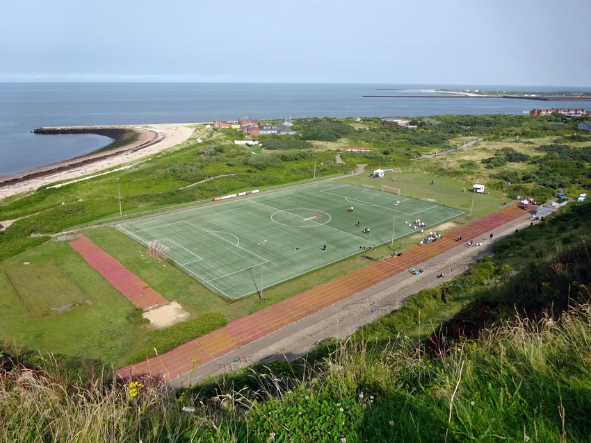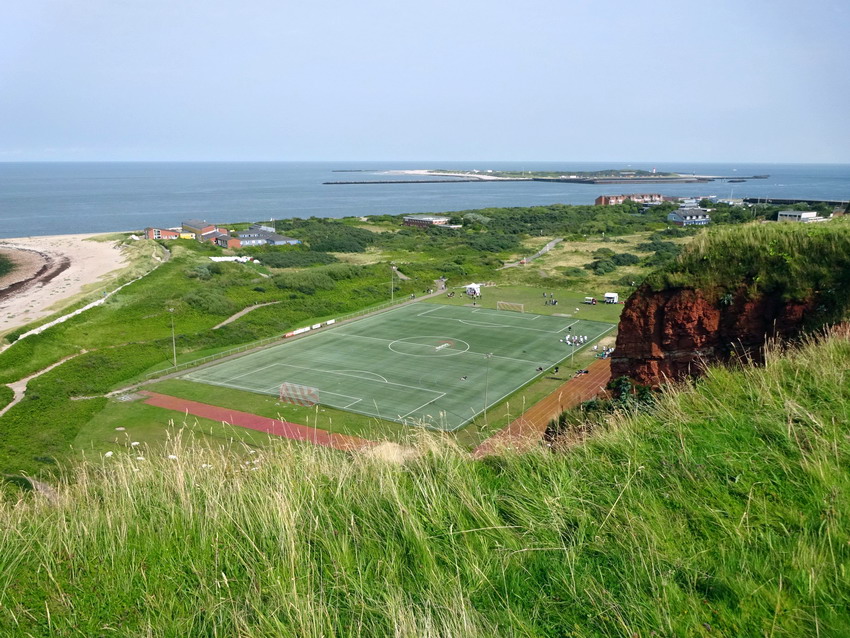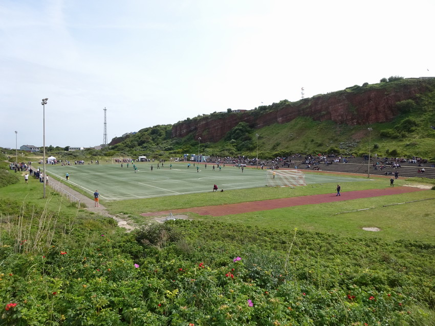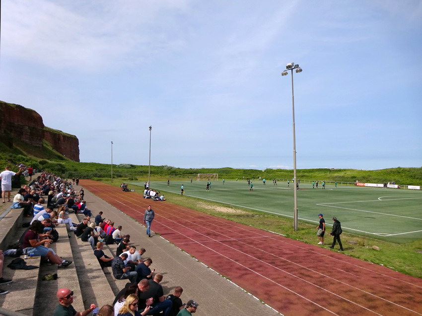 Vor sechs Jahren weilte ich bereits einmal auf Helgoland, um ein Spiel auf diesem Platz mit der traumhaften Kulisse zu sehen. Der lokale Verein VfL Fosite veranstaltete gegen ein Team aus dem Hamburger Raum eins seiner seltenen Freundschaftsspiele. Also schnappte ich meine Dame, buchte ein schickes Hotelzimmer und schipperte von Cuxhaven rüber auf die einzige deutsche Hochseeinsel. Infos waren vorab nur schwer zu bekommen, lediglich die Absicht das Spiel auszutragen wurde seitens des VfL per Email bestätigt. Eine Uhrzeit hingegen nicht. Man müsse erst warten bis die Krabbenfischer zurück seien, Zoll und Post Dienstschluss haben, der Flugloste von der Düne zurück sei undsoweiter. Also einfach mal zum Platz gehirschelt und da man mit diesem Hobby ja nie alleine ist, saß tatsächlich schon ein Angehöriger der Bewegung auf den Stufen dieser wunderbaren Anlage und wartete. Nach seiner Aussage war es sein dritter Versuch ein Spiel auf Helgoland zu sehen und er würde nicht weichen, damit der Anpfiff nicht verpasst wird. Passte mir gut, Handy-Nummern ausgetauscht – er würde sich melden, sobald sich was tut. Irgendwann gegen 17:00 wurde dann das Feuer eröffnet und neun gegen neun oder zehn gegen zehn kickten vor sich hin, genau kann ich mich nicht erinnern. Nach 70 Minuten wurde die Nummer beendet, da man entschied, nun besser Bier trinken zu können. Keine schlechte Entscheidung, aber unter dem Strich war das keine wirklich befriedigende Geschichte für einen aufrechten Fußballtouristen.