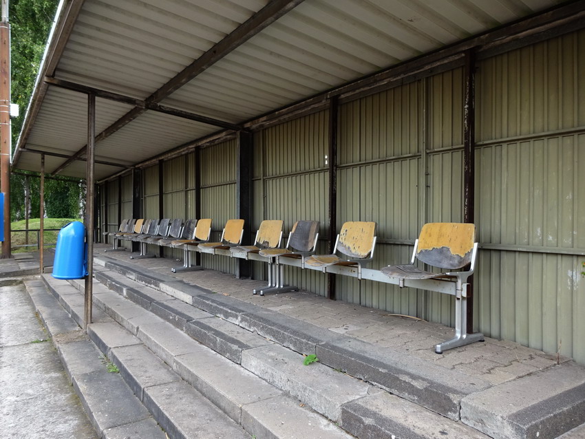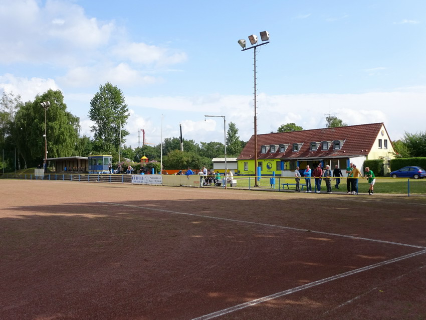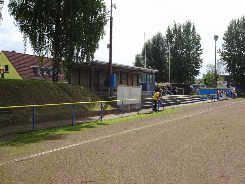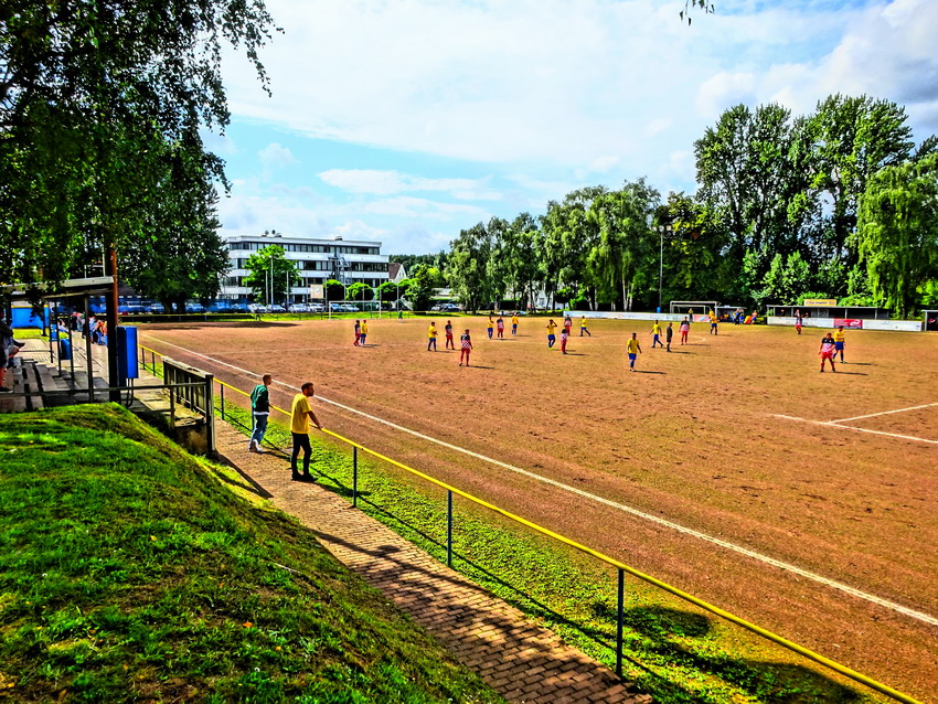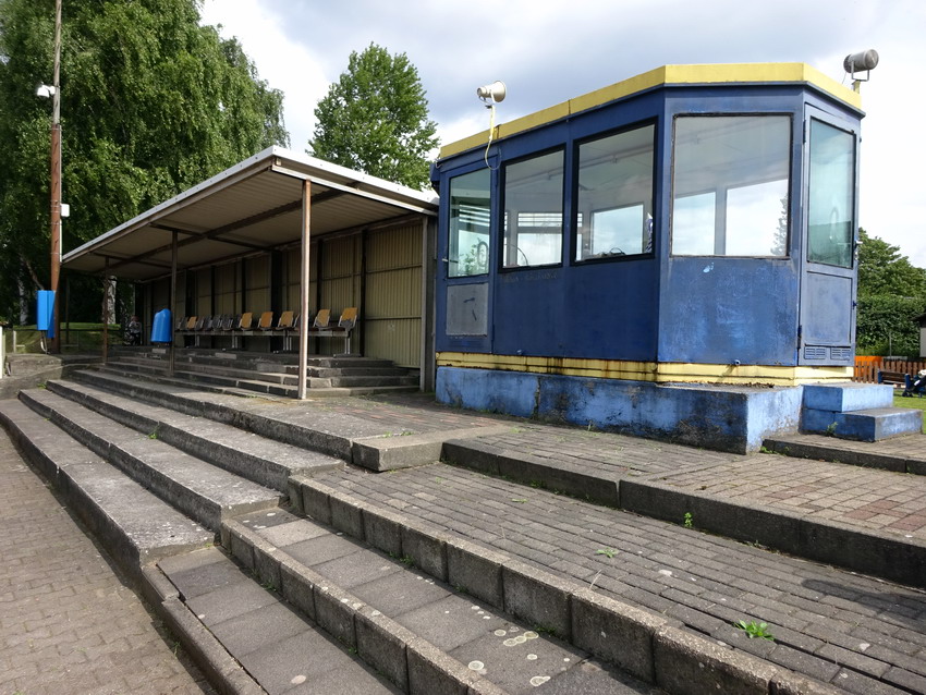 Als mich nach dem Aufstehen und dem Aufbrühen eines Kaffee die Nachricht des RWE-Genossen Marco erreichte, dass er und der Teamchef das Vormittags-Spiel der DJK Wacker besuchen würden, wog ich kurz Faulheit gegen Interesse ab und entschied mich dann für die kurze Anreise. Ein Spiel hatte ich auf dem irgendwie kultigen Sportplatz an der Cathostraße, gelegen im Schatten des RWE-Stadions, tatsächlich noch nicht gesehen, sondern den Platz nur im Laufe der glorreichen Kreisliga-Karriere selber einige Male beackert. Wacker hat nie höher gespielt als in der Bezirksliga. Mit Beginn des Jahrtausend begann dann der endgültige Abstieg. Einige Spielzeiten hielt sich der Club in der Kreisliga A, mittlerweile ist man seit Jahren Stammgast auf der untersten Ebene der Ligen-Pyramide. In den letzten Jahren lief dann auch der Nachwuchs nach und nach weg. Natürlich wollen die Kinder und Jugendlichen lieber auf brandneuen Kunstrasenfeldern spielen, als in der zudem nicht sehr schön gelegenen Asche-Kuhle im Essener Zonenrandgebiet. Keine einzige Jugendmannschaft und nur noch eine Seniorenmannschaft nimmt am Spielbetrieb teil. Trauriger Niedergang eines beinahe 100 Jahre alten Vereins. Dabei hat die Anlage durchaus Charme mit den zwei betagten Überdachungen. Dennoch ist der Patient natürlich klinisch tot und wird nur noch durch den Einsatz einiger unermüdlicher Mitglieder künstlich am Leben erhalten. Sportlich war die Veranstaltung natürlich auch kein Leckerbissen und das Highlight eigentlich die Szene, als der Referee das Spiel mittendrin unterbrach und einem Wackeraner mit der Frage „Wo sind denn Deine Schienbeinschoner“ den gelben Pappkarton unter die Nase hielt.