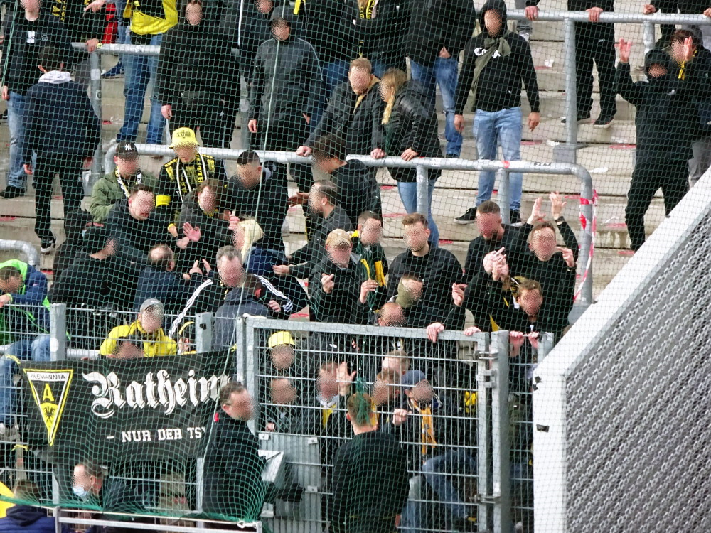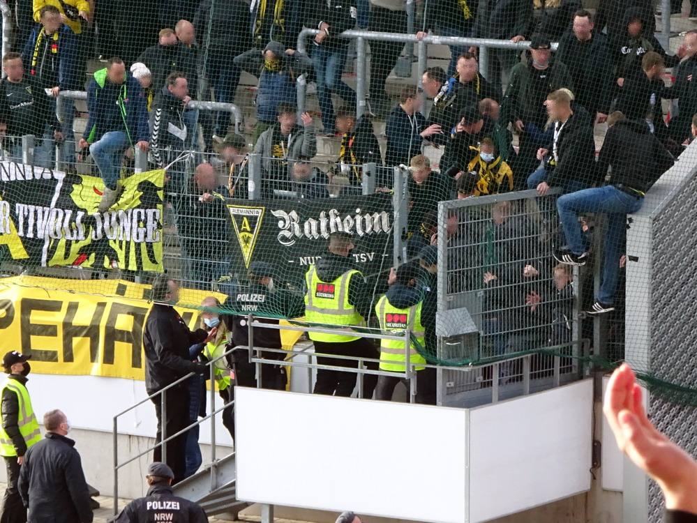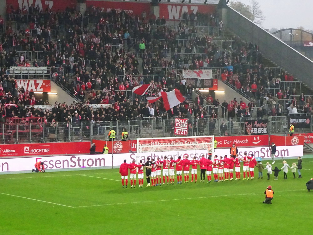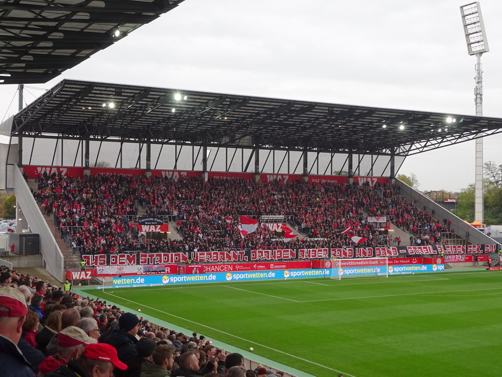 Der rot-weisse Tross begab sich in die Niederrheinische Grenzregion um einen Pflichtsieg einzufahren, aber mit diesen ist das ja so eine Sache. Knapp 800 Gäste wurden dann Zeuge von einer durchwachsenen Essener Vorstellung in Hälfte eins. Der RWE war zwar klar überlegen, aber zu einfallslos und mehr als ein Abseitstreffer von Engelmann sprang nicht heraus. In der Defensive reichte dann ein Ballverlust aus, um sich einen Gegentreffer zu fangen. Unhaltbar schlug ein 20-Meter-Strahl im Giebel ein. Nicht das erste Mal, dass der Versuch, sich spielerisch aus der Bedrängnis zu befreien, in einem Gegentor mündet. Nach dem Seitenwechsel zeigten sich die Roten zielstrebiger aber irgendwie trotzdem zu umständlich. Für den Ausgleich reichte es zwar, aber das ist im Titelkampf beim Siebzehnten der Tabelle zu wenig, zumal die Konkurrenten momentan stabil punkten. Engelmann ließ den Tausendprozenter zum Sieg kurz vor Ende liegen und dann war die Partie mit einem eher unerwarteten Remis zu Ende, was die etwa zwanzigköpfige Gruppe hinter dem Tor, die ich größtenteils dem Gladbach-Lager zuordnete, zu Hohn und Häme animierte. Dumm, wenn sich dann das Verbindungstor plötzlich öffnet und man sich von ein paar heranstürmenden Rot-Weissen ein paar ordentliche Backpfeifen fängt. Manchmal hält man einfach besser mal den Schnabel.