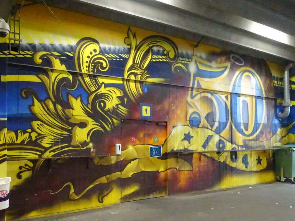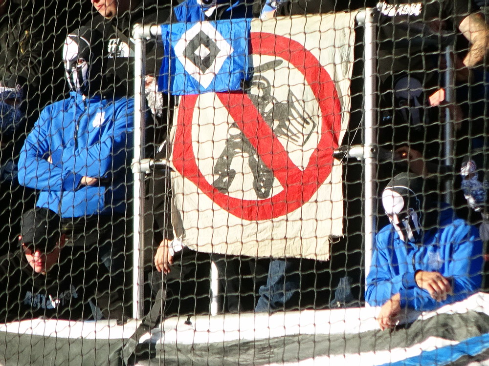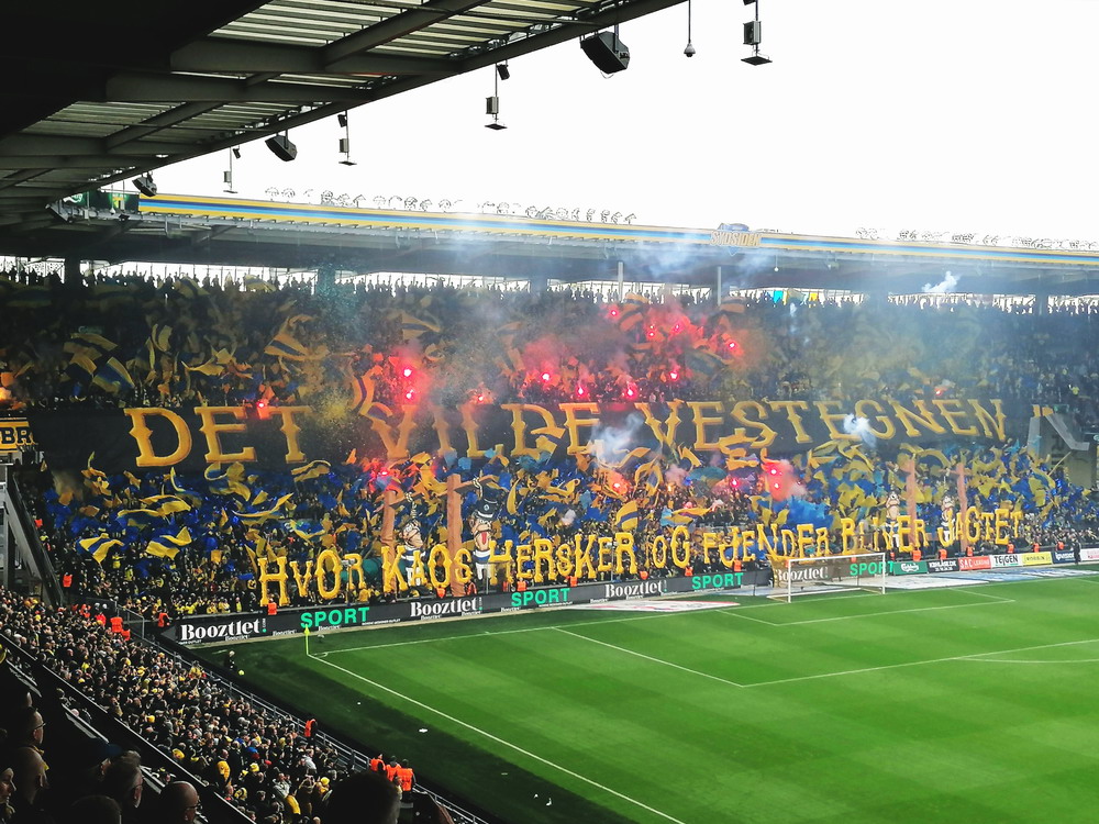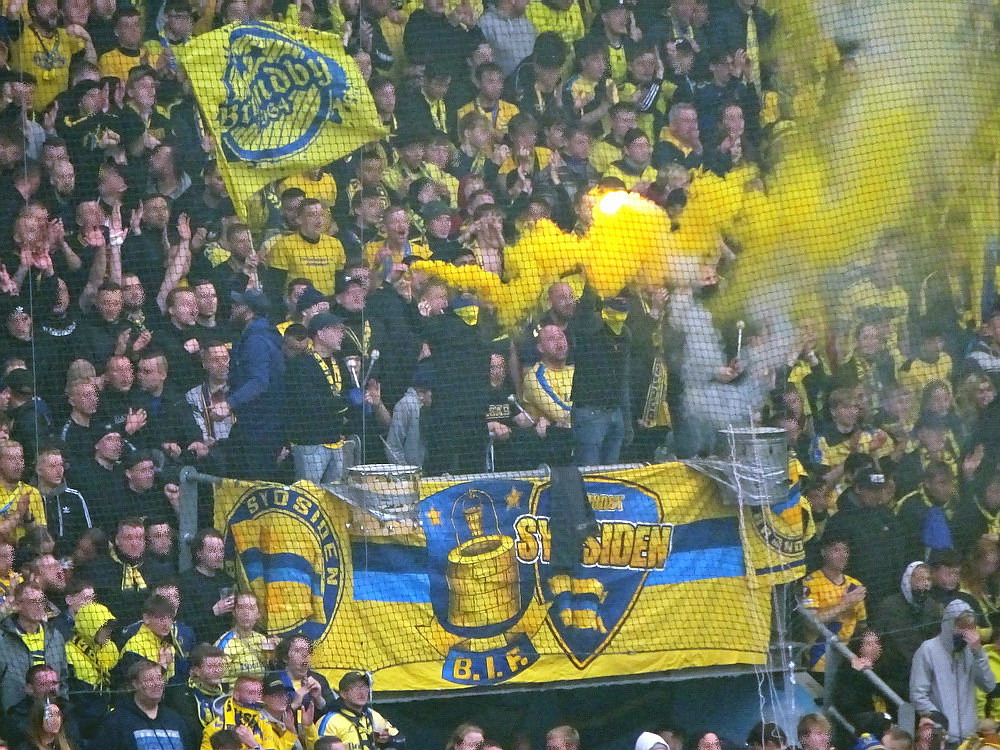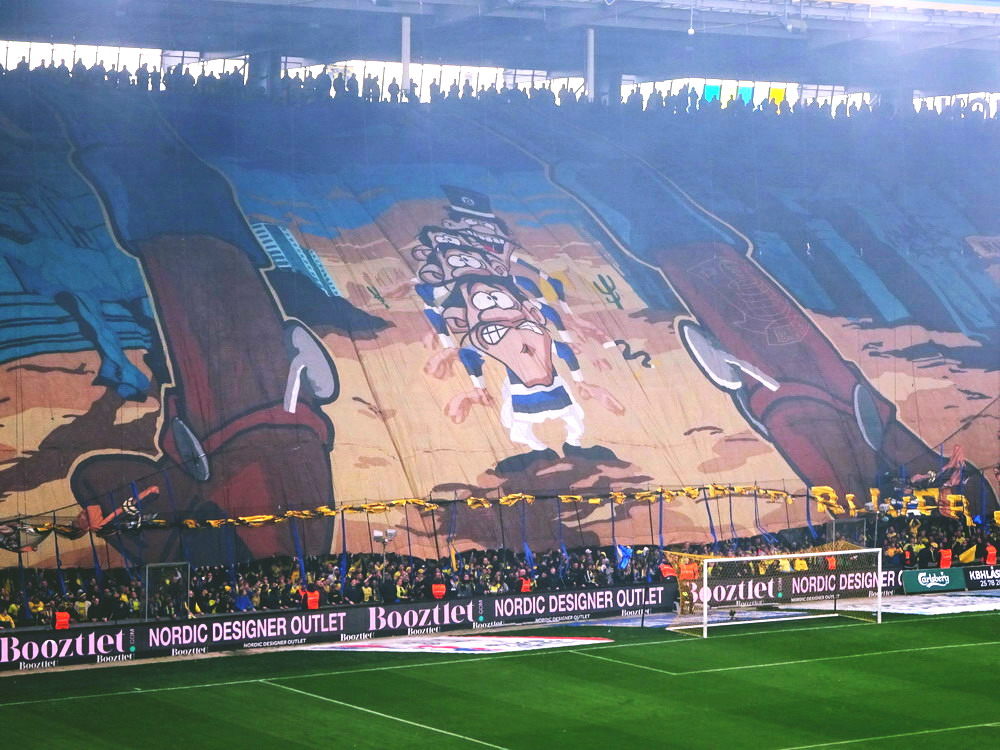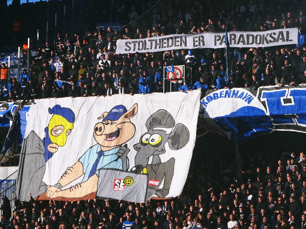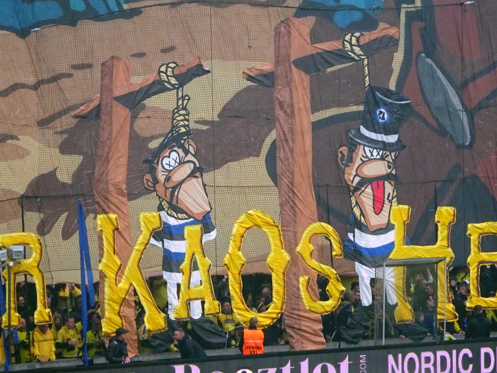 Die Sydsiden startete mit einer Kurvenbedeckenden Tuch-Choreo im Lucky Luke-Stil, die es in dieser Art allerdings bereits mal im französischen Rennes zu sehen gab, auch wenn die hiesige Show um einige Details ergänzt wurde. Auch wenn natürlich ein Copyright-Vergehen nicht gänzlich von der Hand zu weisen war, war die Choreo auf jeden Fall gelungen. Zunächst war die Kurve komplett mit schwarzen Zetteln bedeckt und auf einem über die ganze Breite der Tribüne gespannten Banner stand „Der Wilde Westen“ – das Stadtgebiet von Brøndby schließt sich westlich an Kopenhagen an. Daraufhin wurde das Tuch herunter gelassen auf dem man durch die gespreizten Beine von Lucky Luke die zitternden Daltons in den blau-weißen Trikots der Gäste erblickte. Schließlich wurde am Zaun ein Spruchband hochgezogen auf dem stand „Wo Chaos herrscht und Feinde gejagt werden“. Dahinter sah man die Daltons am Galgen baumeln. Darauf erstrahlte die ganze Kurve im Lichtschein roter Bengalos in einem blau-gelben Fahnenmeer und blau-gelbe Rauchfackeln wurden gezündet. Schönes Bild. Vor dem Spiel gab es hinter der Sydsiden übrigens eine wunderbare Aktion zu beobachten, wie das Zeug rein kommt in die Bude, als ein Dutzend schwarz gekleideter Vermummter auf den Zaun zustürmte, einen Haufen Rucksäcke über diesen warf und danach spurlos verschwand. Ebenso wie die Rucksäcke, die auf der anderen Seite des Zaunes natürlich entsprechende Abnehmer fanden.