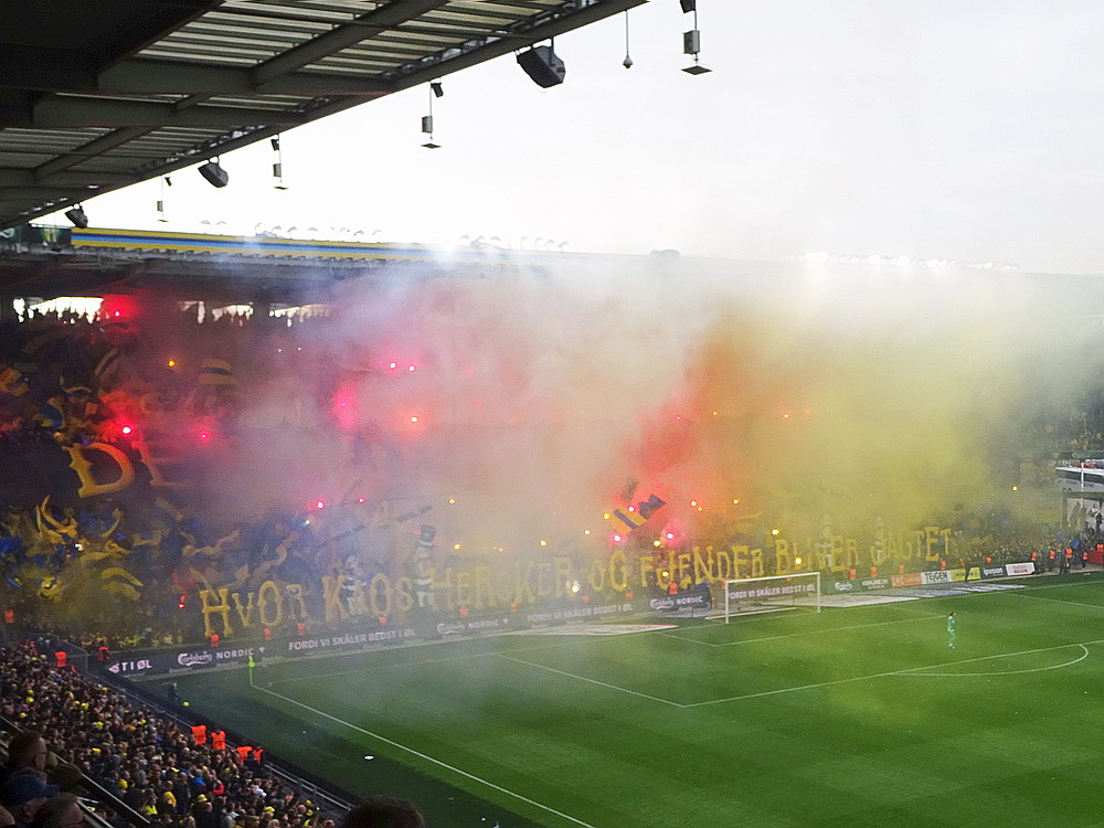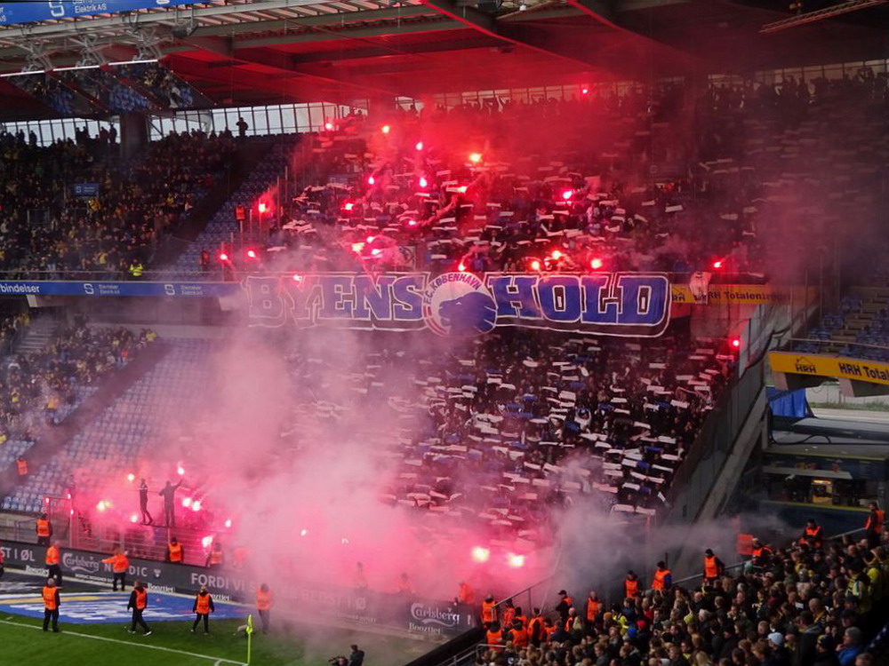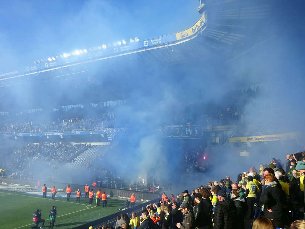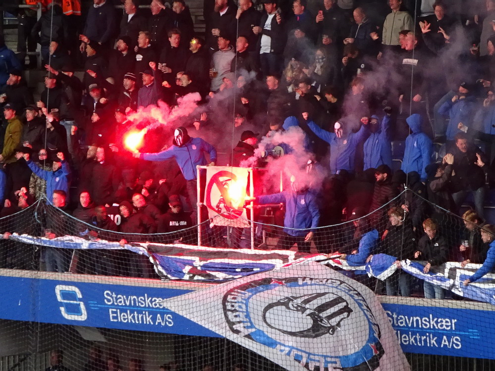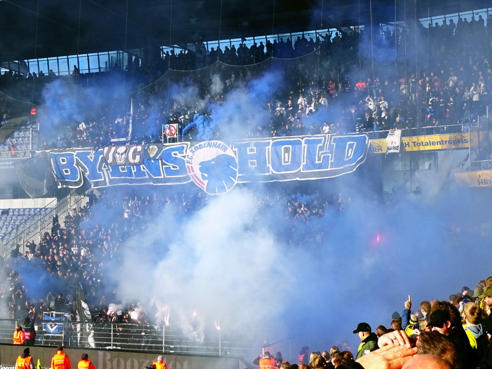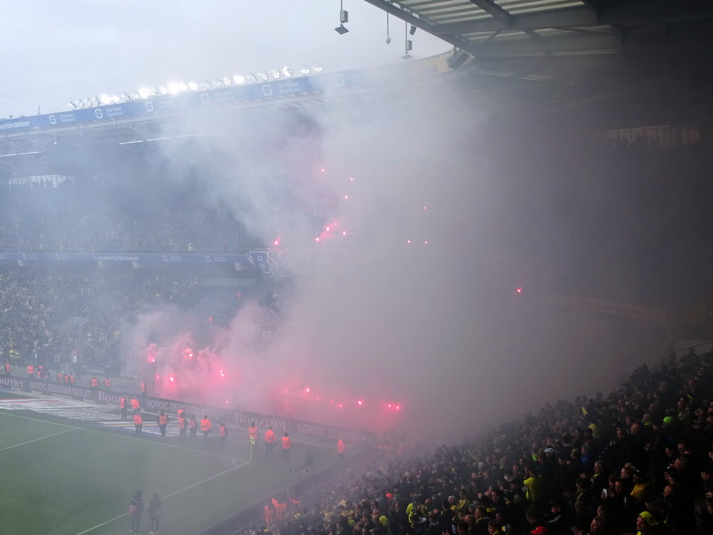 Der Gäste-Anhang beschränkte sich zum Intro auf ordentliche Zündelei. Gute dreißig Fackeln leuchteten den Away-Bereich aus. Es fackelte sowieso immer mal wieder hier und da auf beiden Seiten. Vor allem ein Gäste-Protagonist mit Horrorclown-Maske war kaum vom Zaun des Unterranges runterzubekommen. Der Junge hatte am Folgetag bestimmt Muskelkater vom Bengalo-Schwenken. Wegen der starken Rauchentwicklung fing die Nummer dann zehn Minuten später an. Brøndby wusste, was die Stunde geschlagen hatte und gab ordentlich Gas – auf dem Rasen wie auf den Rängen. Nach 20 Minuten fiel der verdiente Führungstreffer und so ging es auch in die Pause. Zu Beginn der zweiten Halbzeit tauchte der FCK-Anhang den Block in blauen und weißen Rauch und das schien das Team zu beflügeln, denn kurz nach Wiederanpfiff glichen die Gäste aus. Die Kurve feierte und fackelte, bis der Schiri den Treffer nach drei Minuten wieder aberkannte.