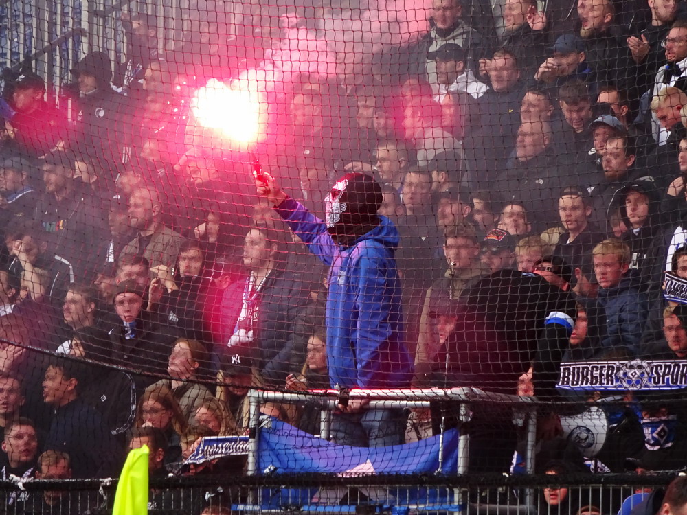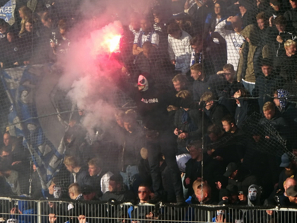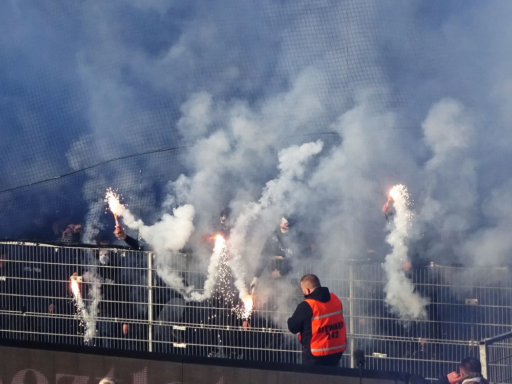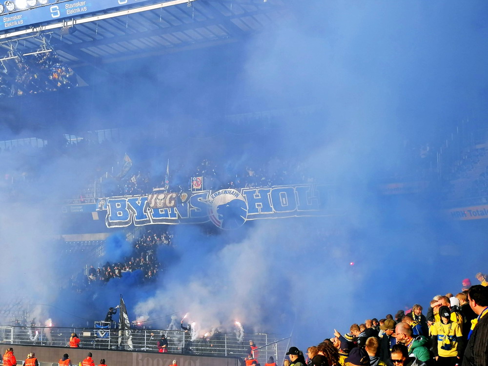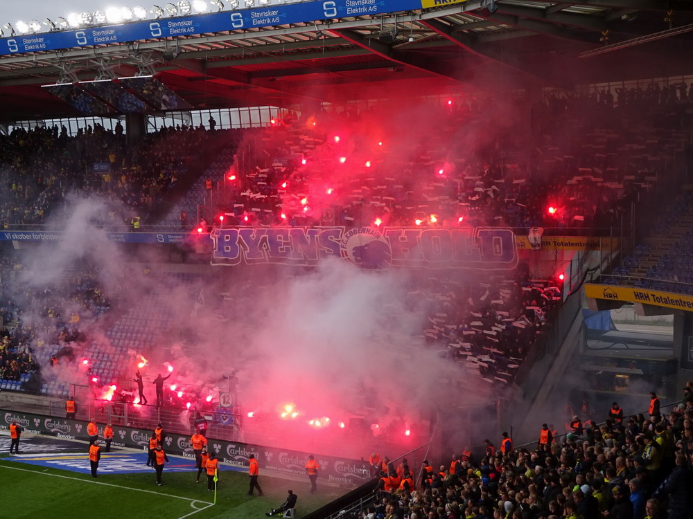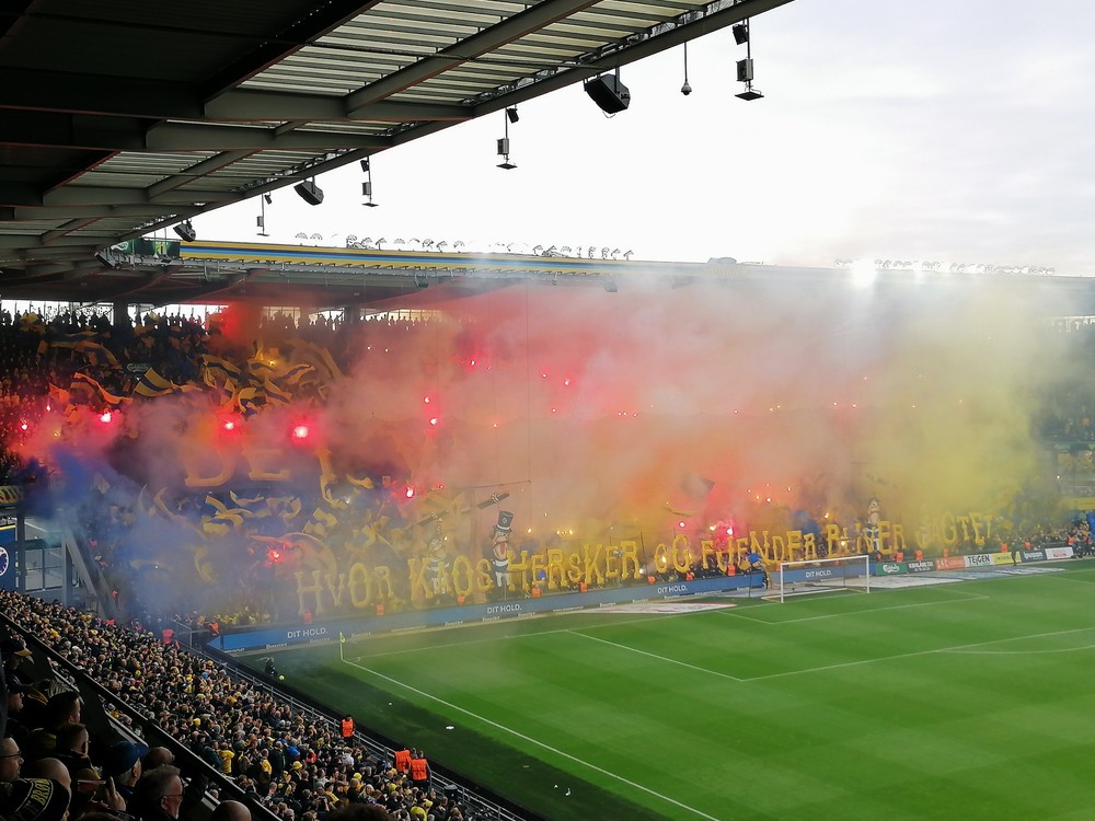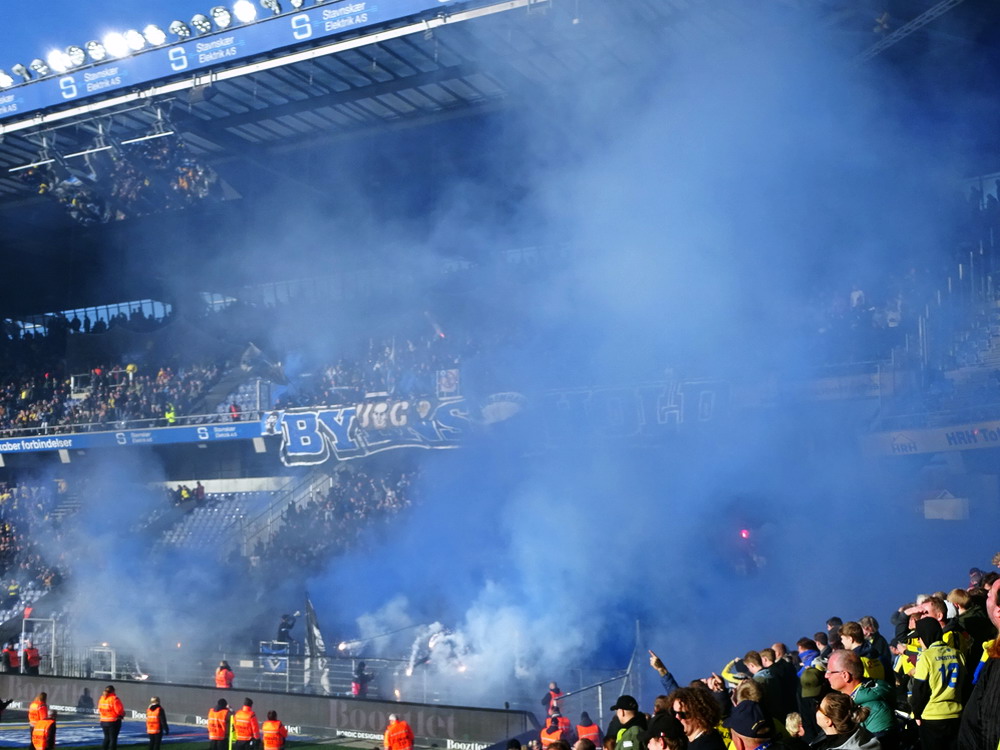 Der Gäste-Anhang beschränkte sich zum Intro auf ordentliche Zündelei. Gute dreißig Fackeln leuchteten den Away-Bereich aus. Es fackelte sowieso immer mal wieder hier und da auf beiden Seiten. Vor allem ein Gäste-Protagonist mit Horrorclown-Maske war kaum vom Zaun des Unterranges runterzubekommen. Der Junge hatte am Folgetag bestimmt Muskelkater vom Bengalo-Schwenken. Wegen der starken Rauchentwicklung fing die Nummer dann zehn Minuten später an. Brøndby wusste, was die Stunde geschlagen hatte und gab ordentlich Gas – auf dem Rasen wie auf den Rängen. Nach 20 Minuten fiel der verdiente Führungstreffer und so ging es auch in die Pause. Zu Beginn der zweiten Halbzeit tauchte der FCK-Anhang den Block in blauen und weißen Rauch und das schien das Team zu beflügeln, denn kurz nach Wiederanpfiff glichen die Gäste aus. Die Kurve feierte und fackelte, bis der Schiri den Treffer nach drei Minuten wieder aberkannte.
