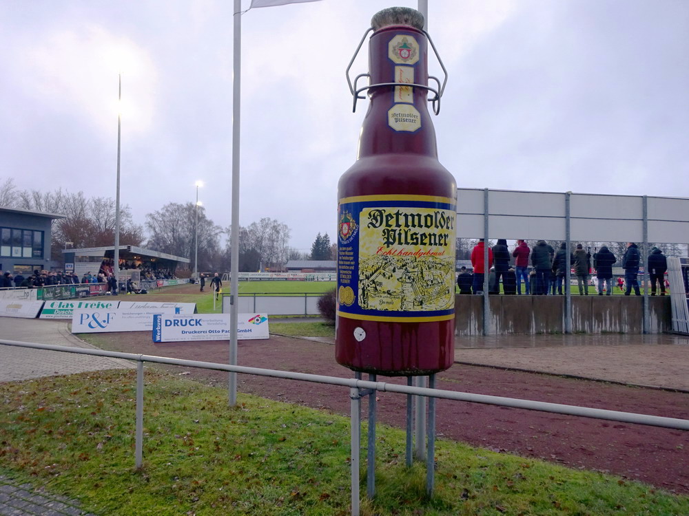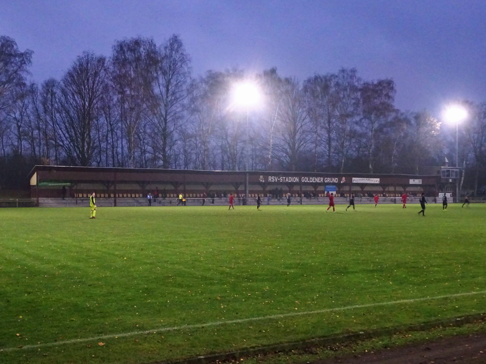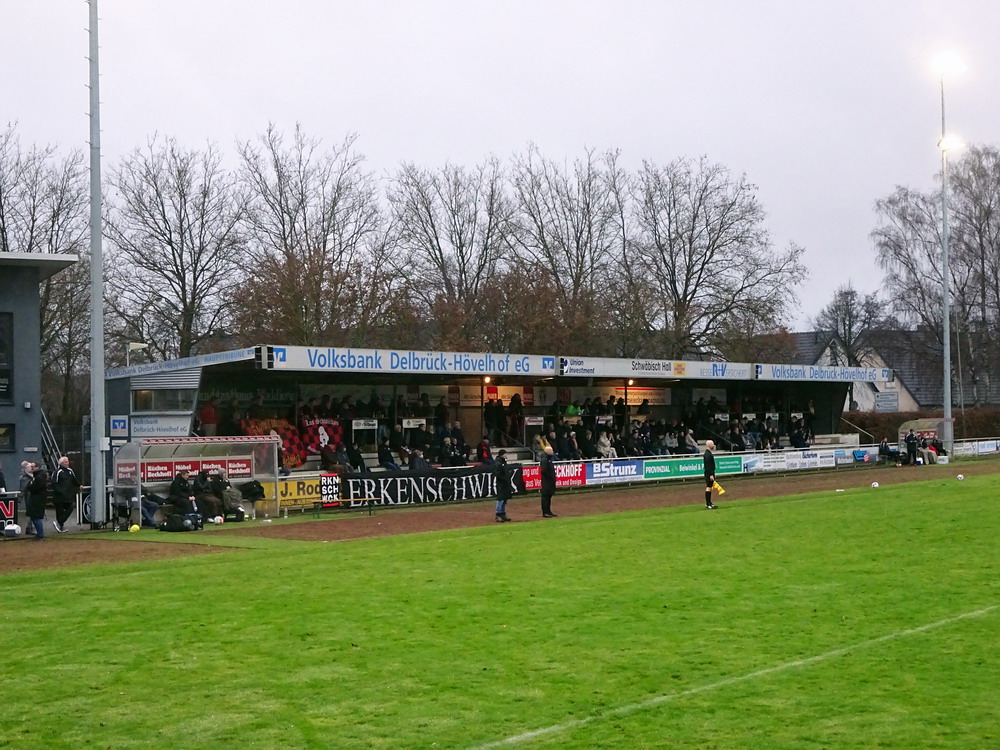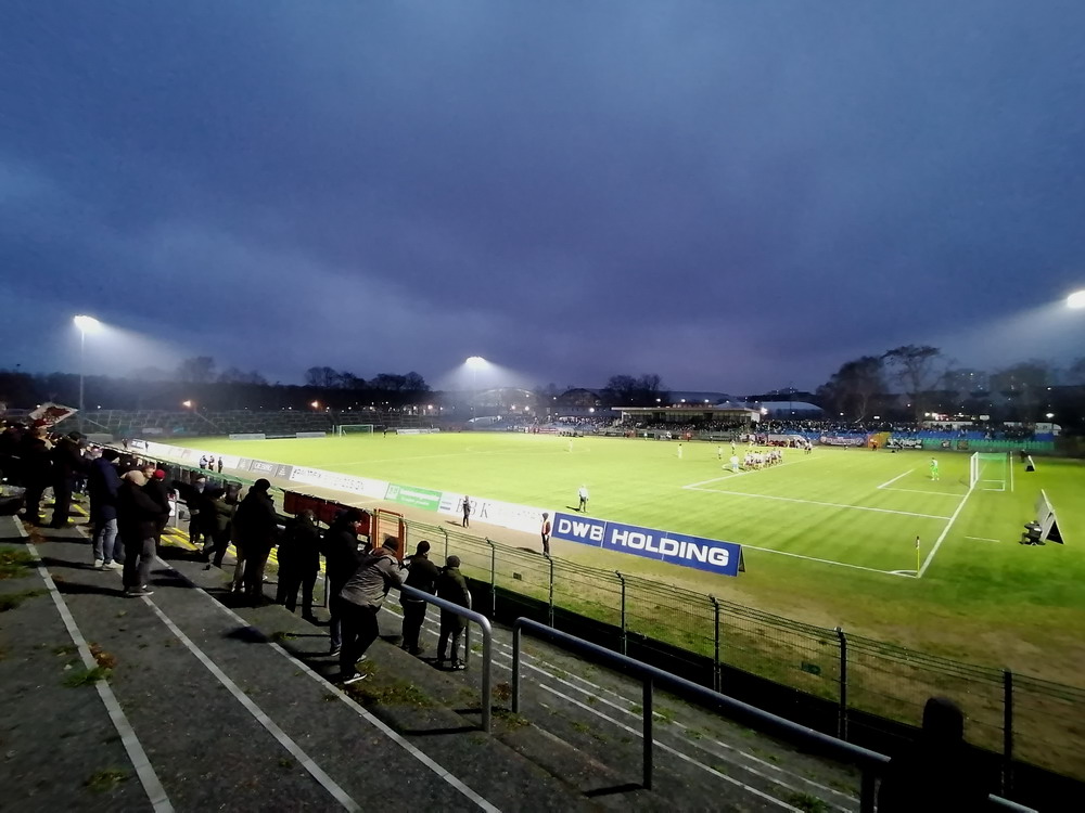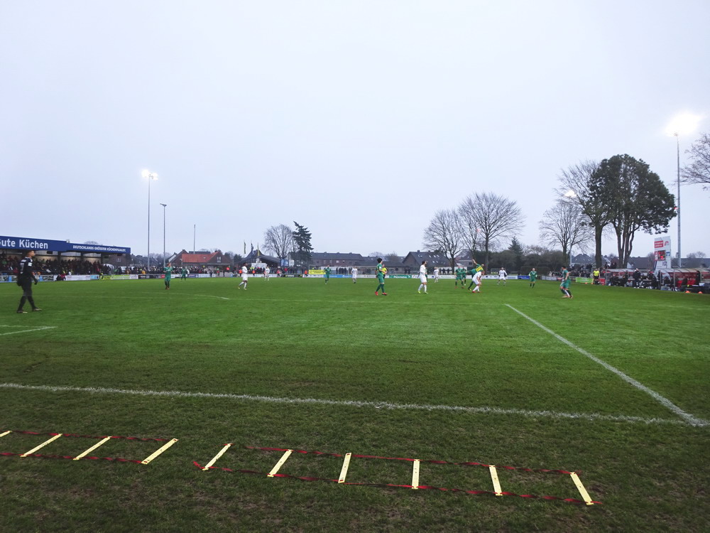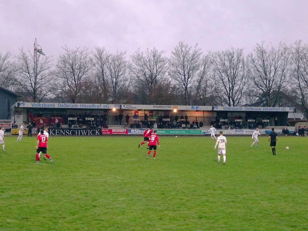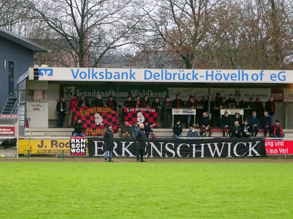 Mit der holden Gattin trat ich die Reise nach Ostwestfalen an. Frecherweise war die Dame nach dem Besuch des Clasico in Kopenhagen nicht mehr beim Fußball, da wurde es aber gehörig Zeit, sonst wird das nix mit der Groundhopping- Fußballtouristen-Karriere. Das Stadion Laumeskamp des Delbrücker SC ist für sechstklassige Verhältnisse wirklich nicht übel und besteht aus einer überdachten Sitztribüne und kleinen Stehtraversen hinter einem Tor und auf der Gegenseite. Vierter gegen Sechster hieß dieses Duell und vor allem die Gäste aus Erkenschwick benötigten dringend einen Sieg um die Aufstiegschance am Leben zu halten. Gut 30 Leute begleiteten die Gäste, von denen ein gutes Dutzend unter Trommelbegleitung Stimmung machte. Finde ich sehr positiv, dass die sportlich ja doch überschaubare Entwicklung die kleine Szene der Schwicker nicht komplett zermürbt hat und sich einige unermüdliche immer noch aufraffen. Die Mannschaft dankte es ihnen jedoch heute nicht. Mit einem indiskutablen ersten Durchgang, in dem alle drei Tore für die Gastgeber fielen, beraubte man sich den Möglichkeiten, hier etwas mitzunehmen. Die zweite Hälfte sah besser aus, aber der Treffer durch Routinier Stefan Oerterer eine Viertelstunde vor Schluss war zu wenig und kam vor allem zu spät. Der DSC igelte sich mit dem Sieg hingegen in der Spitzengruppe ein.