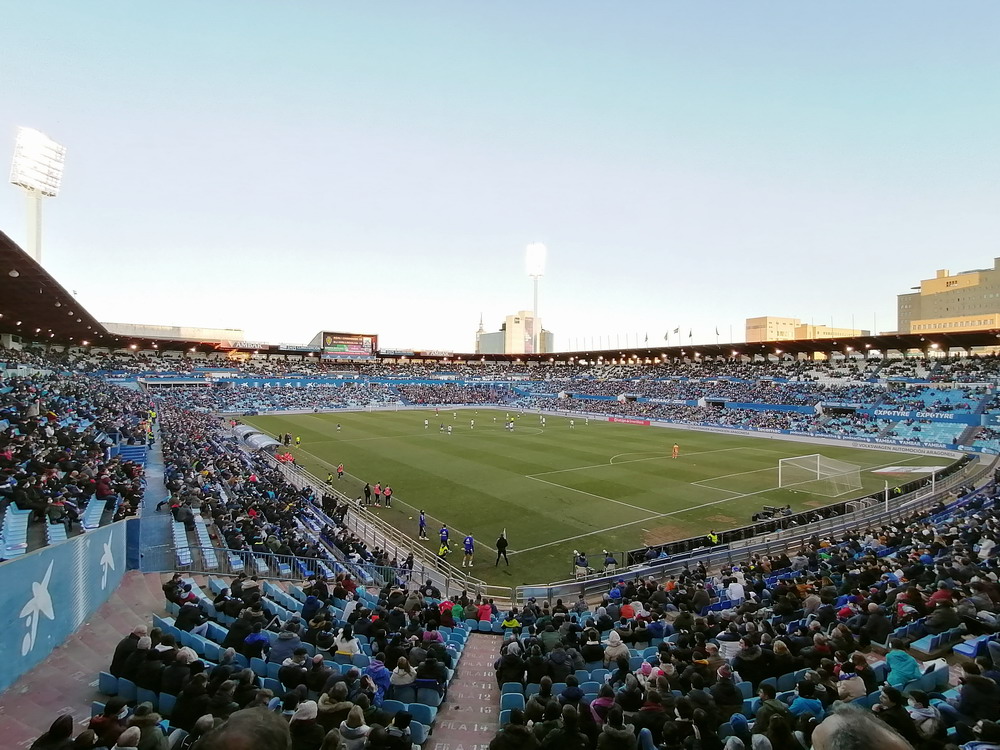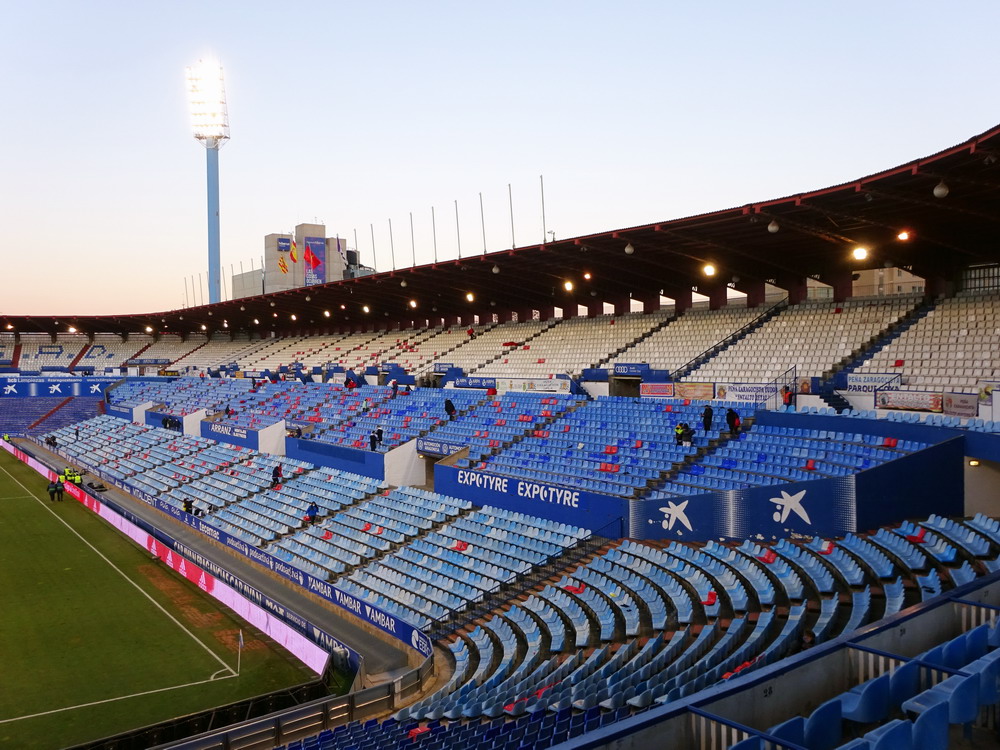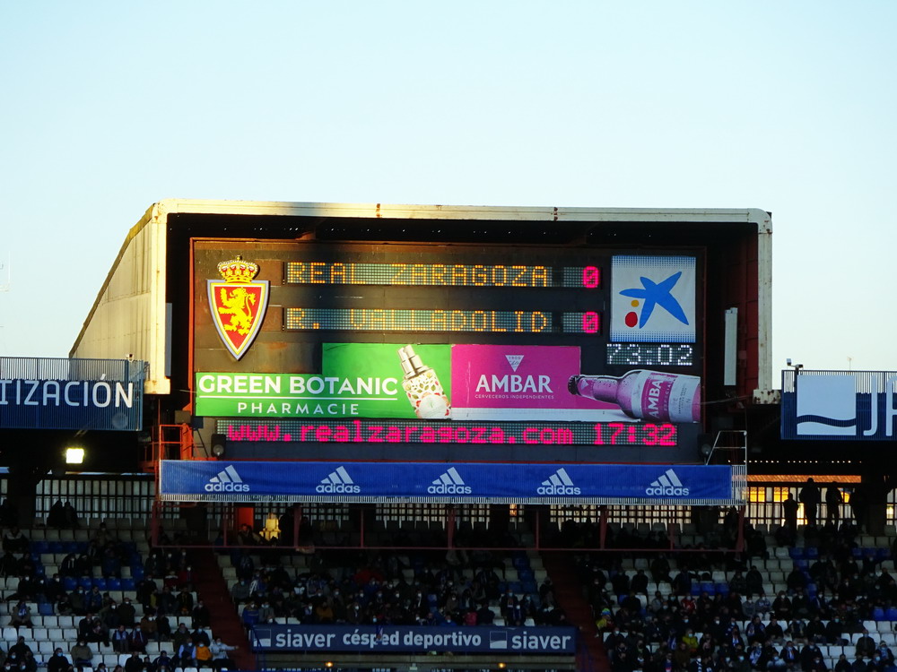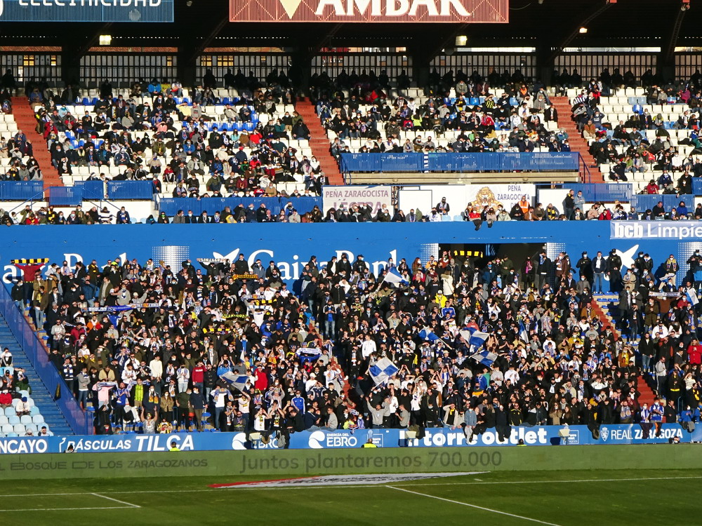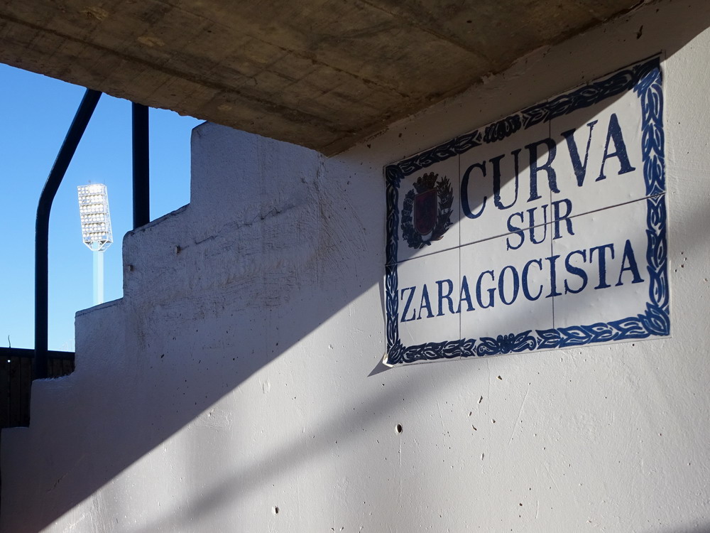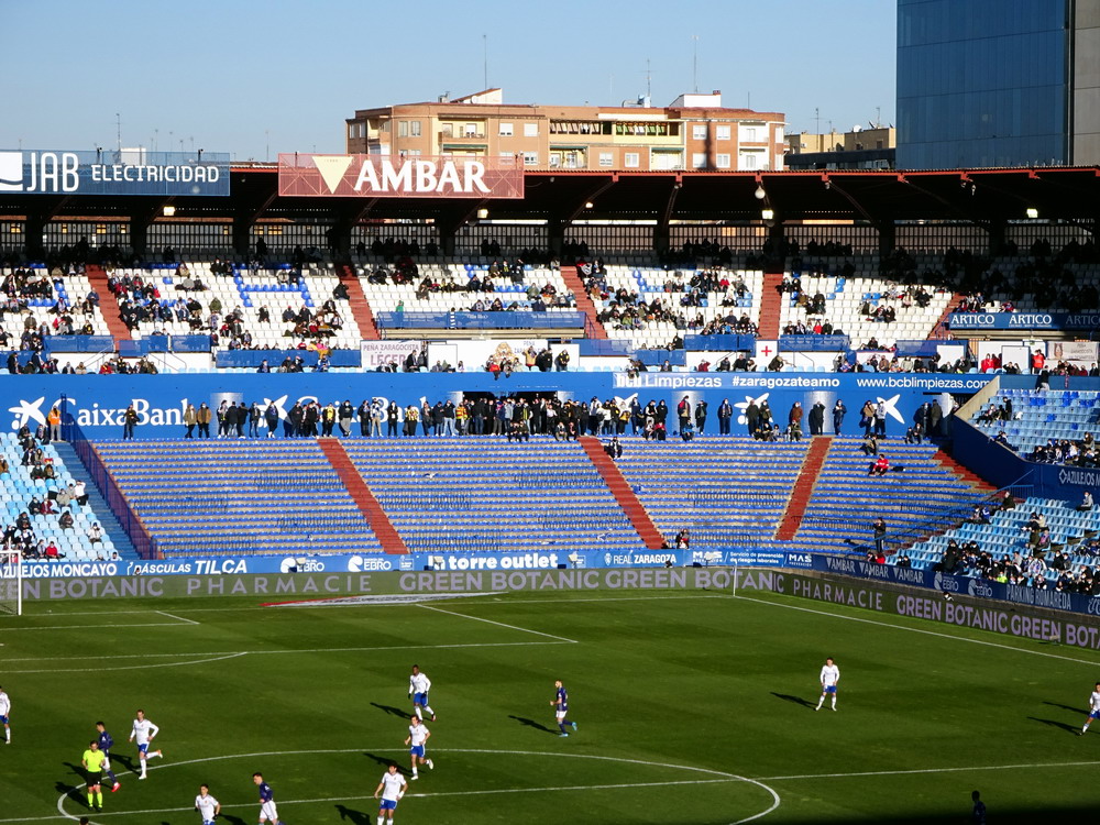 Es wäre heute auch der Doppler Levante und Atletico in Liga eins machbar gewesen, aber das hätte viel Aufwand und Zeitdruck bedeutet und aus dem Alter für viel Aufwand und Zeitdruck bin ich halt irgendwie raus und nur noch selten dazu bereit. Es hätte mich auch jeder Möglichkeit beraubt, abseits des Fußballs etwas aufzusaugen, wie zum Beispiel den Palacio de la Aljaferia oder die sehenswerte Basílica de Nuestra Senora del Pilar, die größte Barockkirche Spaniens. Daher vermied ich die blutige Hopping-Nummer und stieg am Vormittag in den Hochgeschwindigkeitszug AVE und kurz nach Mittag, nach nur etwas mehr als einer Stunde und zwanzig Minuten Fahrzeit 300 Kilometer weiter, wieder aus. Bei zwar kühlen Temperaturen aber sonnigem Wetter konnte ich mir die Stadt dann etwas ansehen bis der Grund der Anreise seine Aufmerksamkeit erforderte. Das La Romareda ist ein schöner betagter Brocken. Alles wirkt etwas angenagt und die Patina der vorherigen Fußball-Epoche liegt wie ein sanfter Schleier über diesem Stadion. Als ich vor dem Spiel eine Runde um das Stadion drehte, geriet ich in den Protest der Hinchada der Gastgeber, die sich hinter der Haupttribüne sammelte und ihren Unmut über den nun schon Jahre schwelenden sportlichen Stillstand des stolzen ehemaligen Europapokalsiegers und mehrfachen spanischen Pokalsiegers, der seit beinahe zehn Jahren in Liga Zwei rumdümpelt, äußerte. Das missfällt dem treuen Anhang, der Taten vom Präsidium fordert. So blieb der Block dann auch die ersten fünfzehn Minuten leer, ehe die Anhänger diesen stürmten und das Team unterstützten. Aus Valladolid warten etwa 140-150 Leute gekommen. Der Verein hat gute Chancen den Abstieg der vergangenen Saison zu korrigieren. Beide Teams neutralisierten sich ziemlich und das Spiel bekam sein gerechtes Ergebnis, denn gute Torchancen waren Mangelware. Der AVE brachte mich dann in Spaniens Hauptstadt, wo am nächsten Morgen der Rückflug anstand.