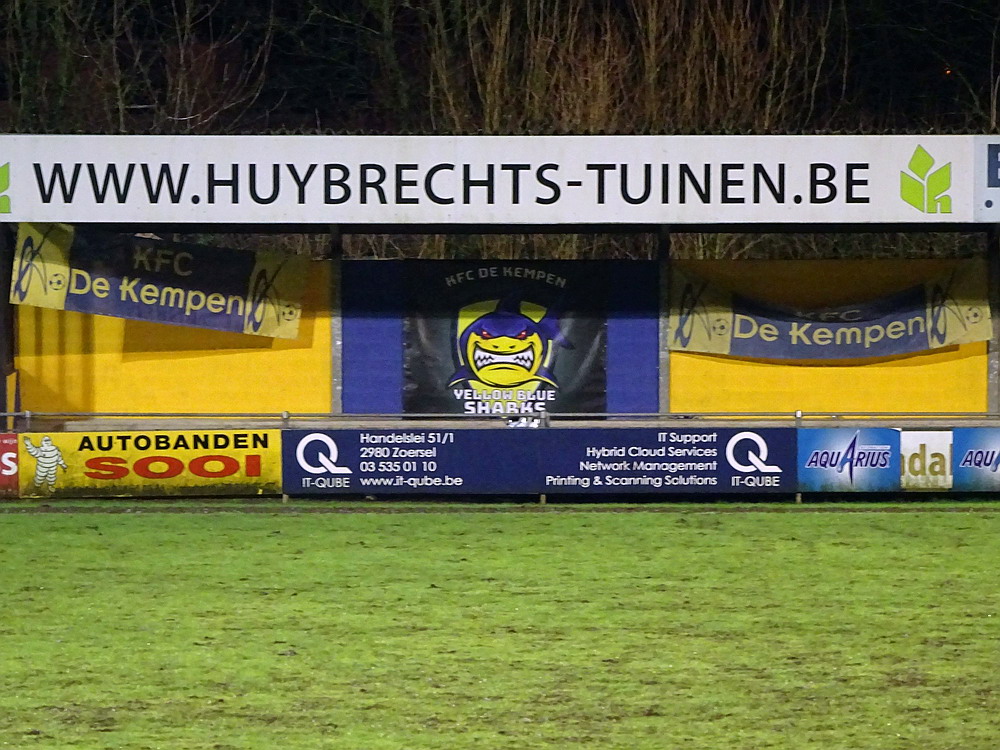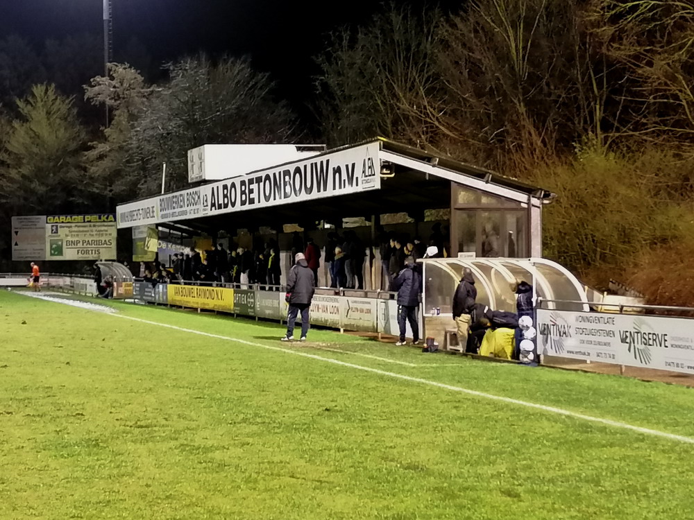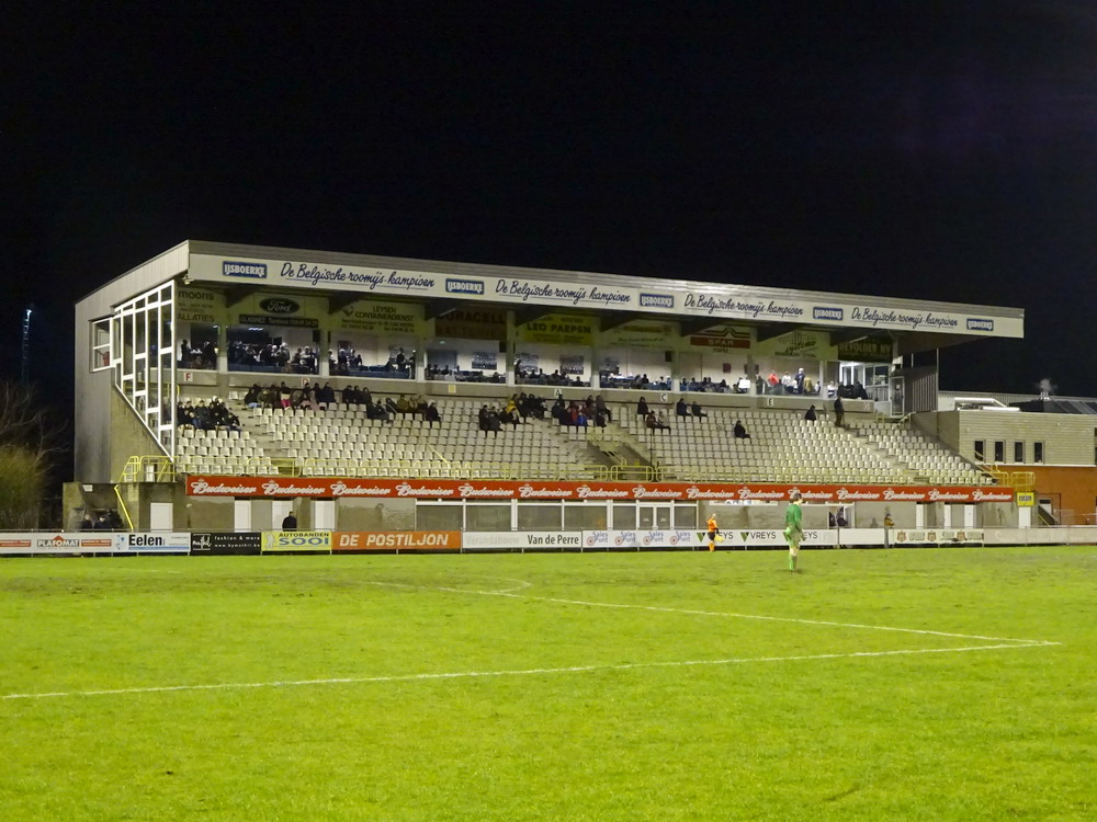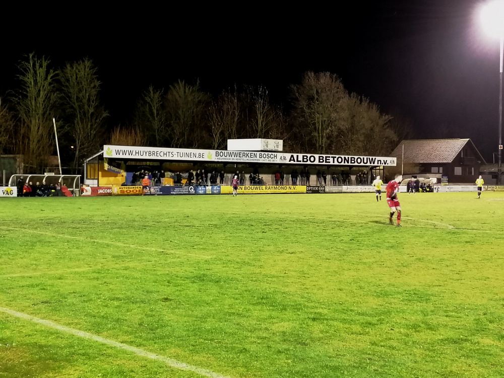 Weiter ging es über die Grenze nach Flandern. Nach dem kulinarischen Stop in der Stamm-Frituur in Turnhout – zweifellos der wichtigste Teil des Ausfluges – wurde in Tielen trotz widriger Bedingungen auf schwierigem wie schmierigem Boden Fußball gespielt. Und das trotz fieser Sturmböen und teils starken Regens gar nicht mal so übel, da habe ich in der fünften Spielklasse Belgiens schon miesere Spiele gesehen. Die Gastgeber stecken tief im Abstiegsstrudel, während die Gäste noch auf die Aufstiegsrelegationsplätze schielen. Es entwickelte sich eine lebhafte Partie mit wechselnder Führung und dem besseren Ende für die Jungs aus dem Kempischen. Zur Freude der kleinen Supporter-Gruppe, von den allerdings der Großteil noch auf den ersten Bartwuchs wartet. Aber die Jungs hatten Spaß und unterstützten ihr Team über 90 Minuten. Freude wird dagegen der Platzwart beim Anblick seines Arbeitsplatzes kaum empfunden haben. Das Spielfeld sah aus wie frisch umgegraben und einer der Linienrichter bewegte sich nur noch im Schlamm voran. Hätte mich nicht überrascht, wenn er irgendwann im Morast versunken wäre. Staunen konnte man wieder mal über das Stadion. Wie an anderen Orten in Belgien auch steht hier eine für einen Provinzverein völlig überdimensionierte Spielstätte. Zwar spielte einer der Vorgänger-Clubs in der zweiten Hälfte der 90er für kurze Zeit zweitklassig, aber das kann der Grund für diesen fetten Tribünenbau eigentlich nicht gewesen sein. Egal, den Stadionenthusiasten freut es. Kurz nach Spielende hörte es dann auch endlich zu regnen auf, so dass die Heimfahrt nicht zu anstrengend wurde.