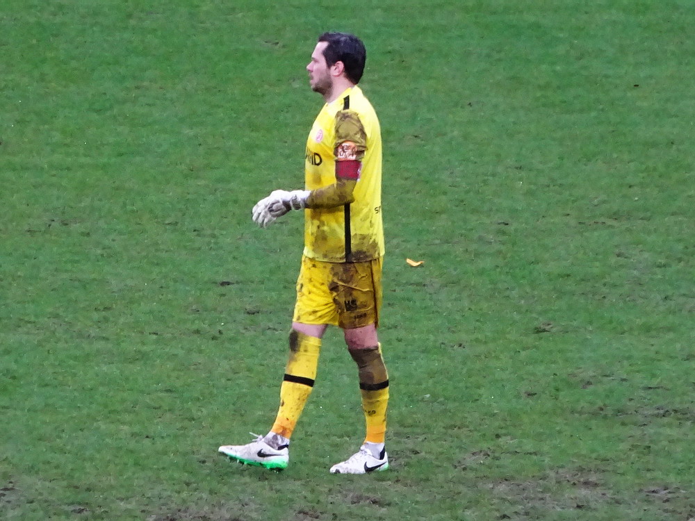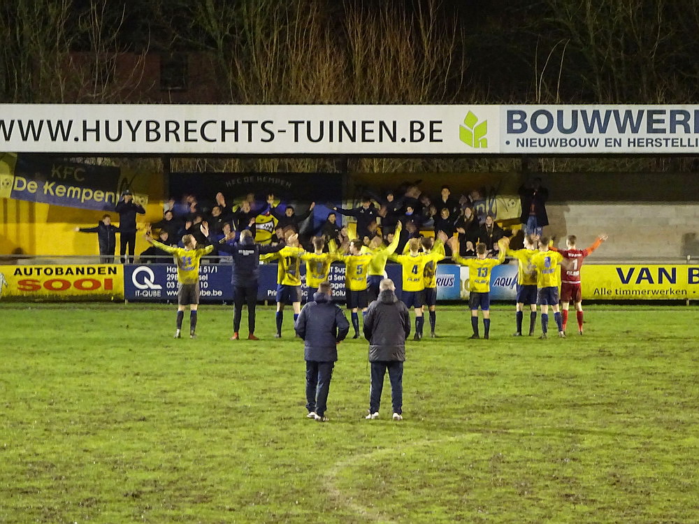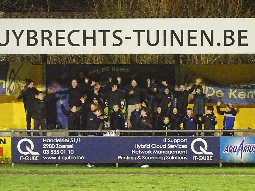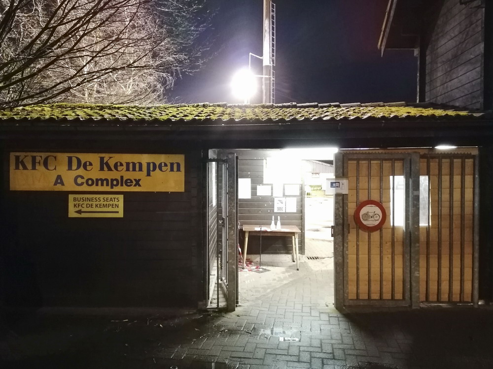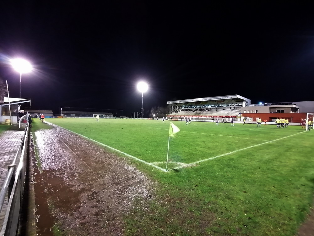Weiter ging es über die Grenze nach Flandern. Nach dem kulinarischen Stop in der Stamm-Frituur in Turnhout – zweifellos der wichtigste Teil des Ausfluges – wurde in Tielen trotz widriger Bedingungen auf schwierigem wie schmierigem Boden Fußball gespielt. Und das trotz fieser Sturmböen und teils starken Regens gar nicht mal so übel, da habe ich in der fünften Spielklasse Belgiens schon miesere Spiele gesehen. Die Gastgeber stecken tief im Abstiegsstrudel, während die Gäste noch auf die Aufstiegsrelegationsplätze schielen. Es entwickelte sich eine lebhafte Partie mit wechselnder Führung und dem besseren Ende für die Jungs aus dem Kempischen. Zur Freude der kleinen Supporter-Gruppe, von den allerdings der Großteil noch auf den ersten Bartwuchs wartet. Aber die Jungs hatten Spaß und unterstützten ihr Team über 90 Minuten. Freude wird dagegen der Platzwart beim Anblick seines Arbeitsplatzes kaum empfunden haben. Das Spielfeld sah aus wie frisch umgegraben und einer der Linienrichter bewegte sich nur noch im Schlamm voran. Hätte mich nicht überrascht, wenn er irgendwann im Morast versunken wäre. Staunen konnte man wieder mal über das Stadion. Wie an anderen Orten in Belgien auch steht hier eine für einen Provinzverein völlig überdimensionierte Spielstätte. Zwar spielte einer der Vorgänger-Clubs in der zweiten Hälfte der 90er für kurze Zeit zweitklassig, aber das kann der Grund für diesen fetten Tribünenbau eigentlich nicht gewesen sein. Egal, den Stadionenthusiasten freut es. Kurz nach Spielende hörte es dann auch endlich zu regnen auf, so dass die Heimfahrt nicht zu anstrengend wurde.