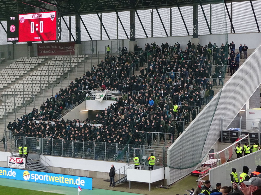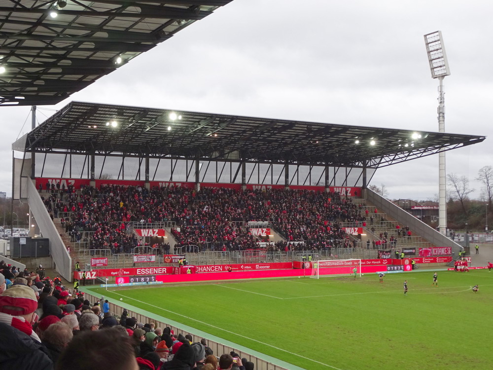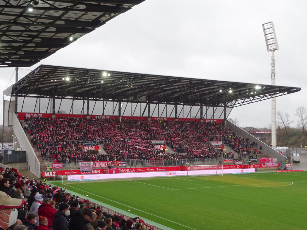 RWE empfing die Preußen, den aktuell direkten Verfolger in einer durch viele noch ausstehende Nachholspiele schiefen Tabelle. 10.000 Zuschauer durften ins Stadion und diese waren bei widrigen Bedingungen auch anwesend, davon 800 aus der Stadt ohne Richtschwert. Passend zur Schweigeminute für den vor wenigen Tagen verstorbenen ehemaligen Rot-Weissen Hermann Erlhoff, war der Gäste-Anhang beinahe komplett schwarz gekleidet – das nenne ich mal Empathie. Vor der Pandemie wäre das ein absoluter Stimmungskracher geworden, doch aktuell ist ja alles anders. Die aktiven Gruppen treten ja momentan nicht organisiert auf, anwesend sind die Gruppenmitglieder aber dennoch. Trotzdem blieb Stimmung wieder überschaubar, als ob die fehlenden Gruppenbanner die Stimmbänder lähmen. Dieses Problem wurde auch im Gästeblock offenkundig. Zwar wurde es immer mal wieder für ein paar Minuten laut, aber die Ruhephasen dazwischen waren nicht zu ‚überhören‘. Ich bin gespannt, inwiefern die Pandemie den Fußball in Deutschland letztlich für immer verändern wird. Das Spiel kam nur schwer in Gang, beide Teams neutralisierten sich ziemlich, in den Strafräumen passierte nicht viel. Die Gäste legten eine recht dreckige Spielweise an den Tag, genau richtig für ein solches Spiel, das ging den Roten etwas ab, beeindrucken ließen sie sich aber vom Münsteraner Auftreten auch nicht. Kurz vor der Pause wurde Isi Young im Sechzehner gelegt und Neuzugang Eisfeld verwandelte den fälligen Strafstoß sicher.