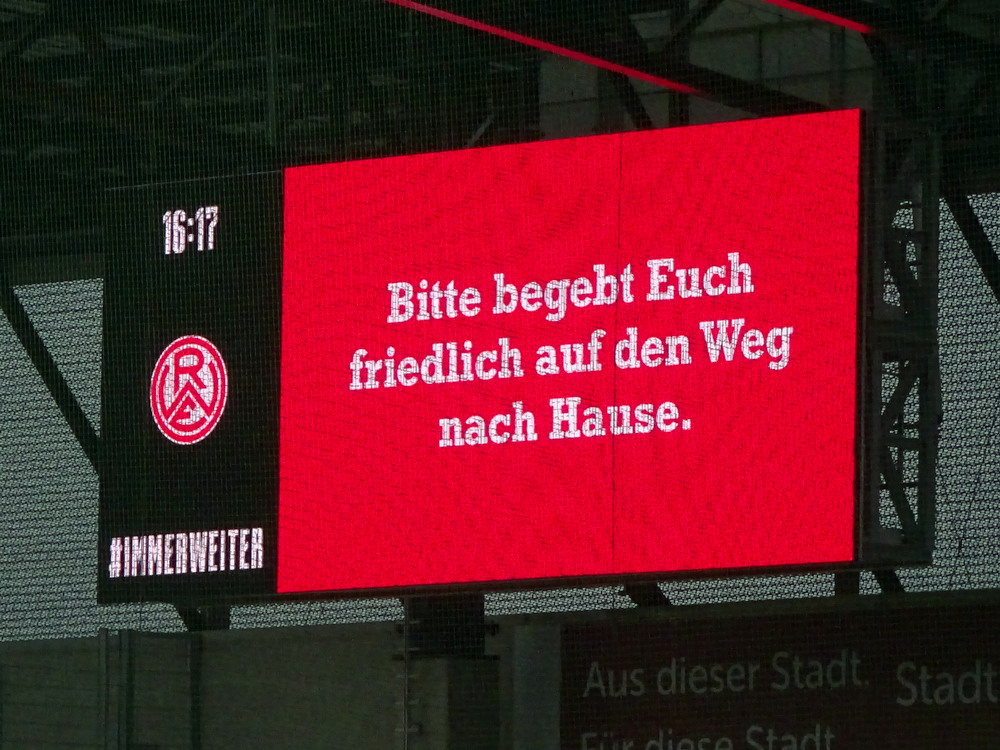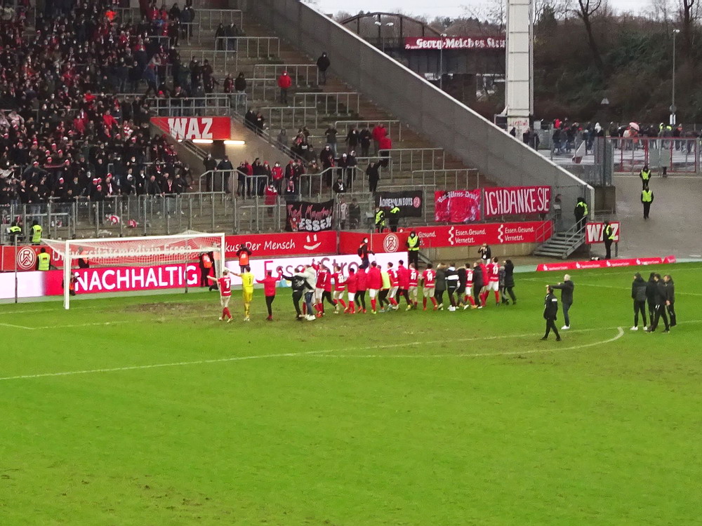 Der Preußen-Anhang feierte die Bekanntgabe wie den Aufstieg. Bei allem Verständnis für spontane Schadenfreude finde ich das beinahe genauso hirnverbrannt wie den Böllerwurf, denn diese Aktion kennt eigentlich nur Verlierer. Selbst wenn die Preußen die Punkte zugesprochen bekommen – so eng kann der Blickwinkel doch gar nicht sein, so einen Mist derart abzufeiern. Auf dem Heimweg machte sich Ernüchterung breit, denn so ein Scheißdreck droht mir völlig die Freude an meinem Hobby zu rauben. So ähnlich wird es vielen ergangen sein. Die Leute gingen vermutlich annähernd alle stinksauer, wütend, enttäuscht, desillusioniert ihres Weges. Die kommenden Wochen werden zeigen, welche Konsequenzen die Tat eines Einzelnen für den Verein Rot-Weiss Essen bedeutet. Aufgeben ist keine Option, denn damit würde man sich diesem geistig Benachteiligten ergeben. Die Geschichte wird aufgearbeitet werden und nun gilt es sich zu schütteln, die Krone zu richten und den Fokus auf den Sport zu legen.