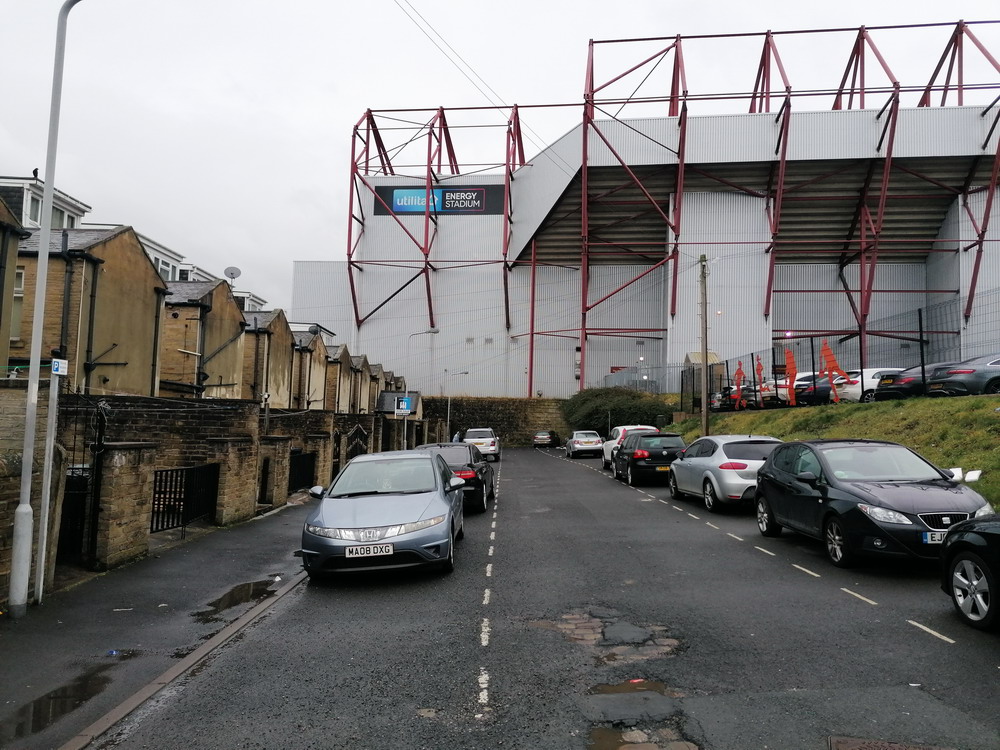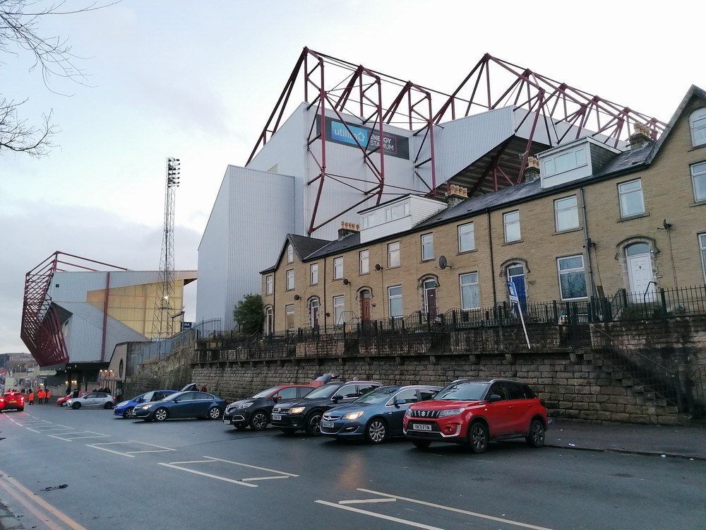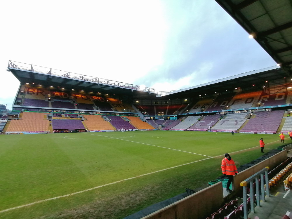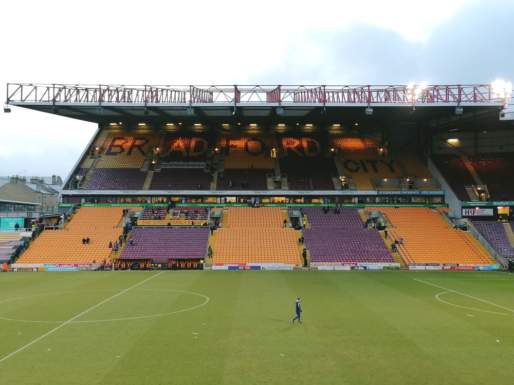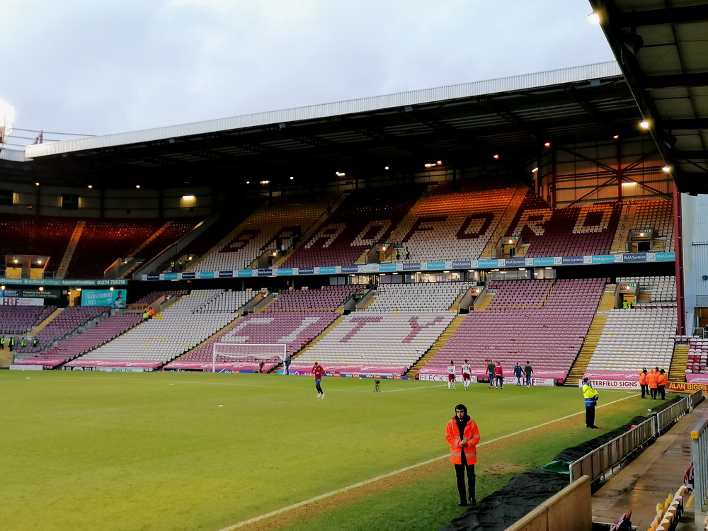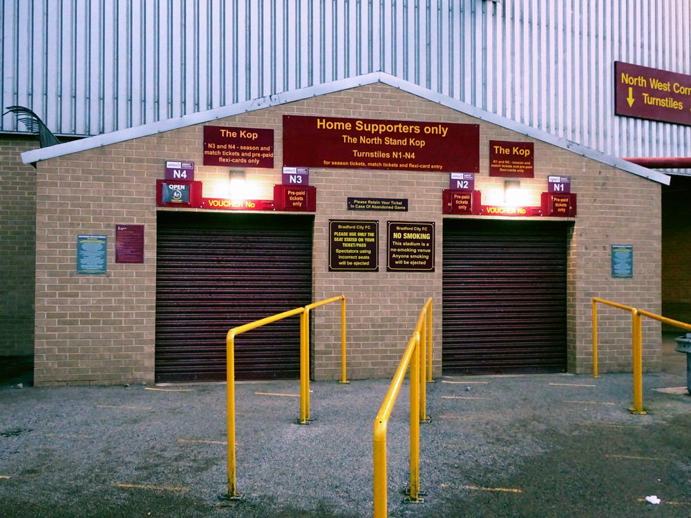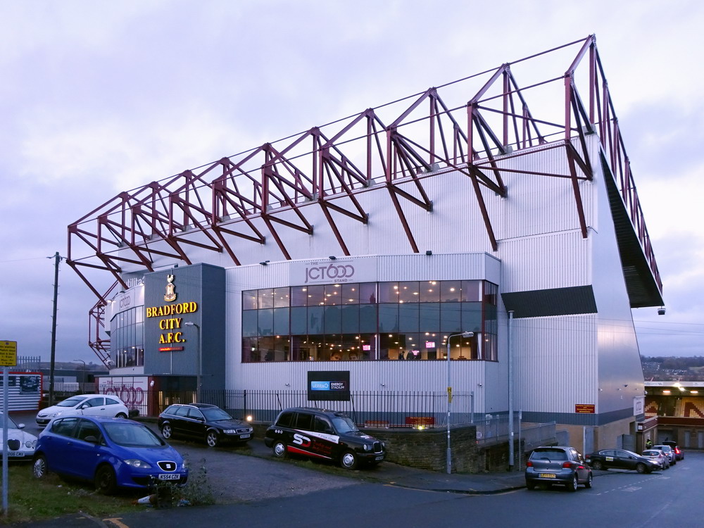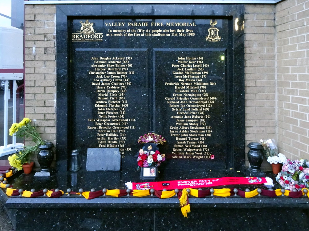 Marc hatte einen Uber-Fahrer vorbestellt. Leider verloren wir ein paar Minuten dabei, diesen zu finden. Weitere kostbare Zeit ging im Abfahrtsstau drauf, sodass wir erst mit dem Anstoß am Valley Parade Stadium ankamen. Die Ticketabholung ging schnell und reibungslos und so betraten wir in Spielminute sieben das Stadion. Mir ziemlich egal, war ja eh mein zweiter Besuch hier, und die anderen werden es auch überleben. Seit 1903 wird an dieser Stelle Fußball gespielt. Sport getrieben wird sogar schon seit 1886, als das Spielfeld für Rugby genutzt wurde. Durch räumliche Zwänge und diverse Umbauarbeiten im Laufe der Jahre sieht die Hütte ja schön zusammengeschustert, aber dennoch beeindruckend aus. Wenn man auf die Geschichte des Valley Parade eingeht, kommt man einer der größten Tragödien im Fußball nicht vorbei. Im Mai 1985 starben 56 Menschen als der hölzerne Main Stand des Stadions in Flammen aufging. 256 weitere Menschen wurden teils schwer verletzt. City stand bereits als Aufsteiger fest und das letzte Heimspiel sollte vor ausverkaufter Kulisse einfach nur den krönenden Saisonabschluss bilden. Die bewegten Bilder zu diesem Unglück kann man sich im Internet ansehen und wenn man nur einen Hauch von Empathie in sich trägt, macht sich Fassungslosigkeit breit. Ein harmlos aussehendes kleines Feuer entwickelte sich in kürzester Zeit zum Inferno. In nicht einmal vier Minuten stand die Tribüne komplett in Flammen. Viele der Opfer waren in den Bauch der Tribüne geflüchtet, um auf die Straße zu gelangen. Da die Tore jedoch verschlossen worden waren, um eine Überfüllung des Stadions zu verhindern, gerieten Sie in eine Todesfalle.