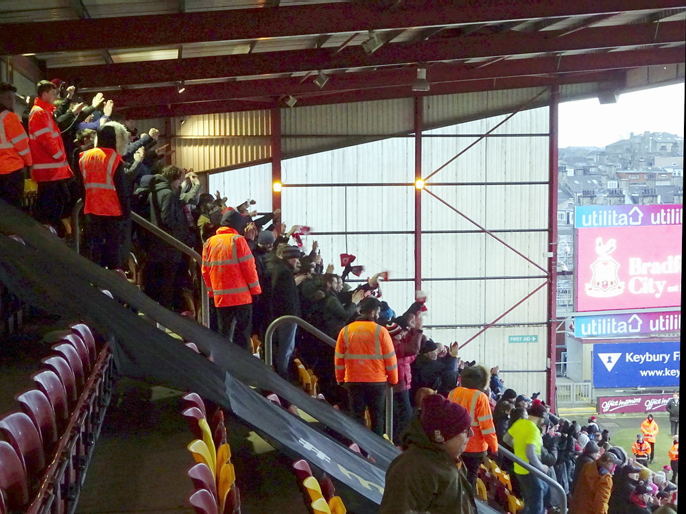 An der Erfolglosigkeit des Clubs hat sich seitdem nicht viel verändert. Das entwickelt natürlich eine Nähe zum glorreichen RWE – der Verein vor Tradition triefend, fettes Stadion und dabei maximal erfolglos. Ein Unterschied besteht darin, dass sich der BCFC um die Jahrtausendwende ein paar erfolgreichere Jahre erlaubte, die ihn sogar bis in die Premier League spülten, aber das regulierte sich ja schnell wieder. Wie bei meinem ersten Mal brachte ich en Bantams auch heute kein Glück und erneut unterlag das Team mit bescheidener Leistung torlos. Einen Sieger hatte das Gerödel eigentlich nicht verdient, aber die Jungs aus Devon schafften es irgendwie die Kirsche kurz vor dem Seitenwechsel in die Maschen zu befördern. Bezeichnend, dass ich den einzigen Treffer des Wochenendes verpasste, da ich schon mal zum Bierverkauf aufgebrochen war. Lichtblick des Tages war, der etwa 250 Mann und Frau starke Anhang der Gäste, der 93minütigem Dauersupport raushaute. Fand ich gar nicht so übel und ist auf der Insel ja beinahe wie Weihnachten und Ostern zusammen. Im Nieselregen strebten wir dann der Bleibe für die Nacht entgegen und wollten noch eine Stunde ruhen. Wäre theoretisch auch möglich gewesen, wenn Rezeptionistin Anne nicht völlig damit überfordert gewesen wäre, dass zwei Zimmer durch dieselbe Person gebucht worden waren und gefühlte Stunden benötigte, uns einzuchecken. Auch diese Hürde war aber irgendwann gemeistert und nach dem Essen beim Syrer (merke: die syrische halbe ist eine europäische volle Stunde) zogen wir noch durch ein paar mehr oder weniger zweifelhafte Pubs, um ein paar dünne englische Biere zu verköstigen. Der Heimweg am nächsten Tage klappte bis auf leichte Flugverspätung reibungslos.