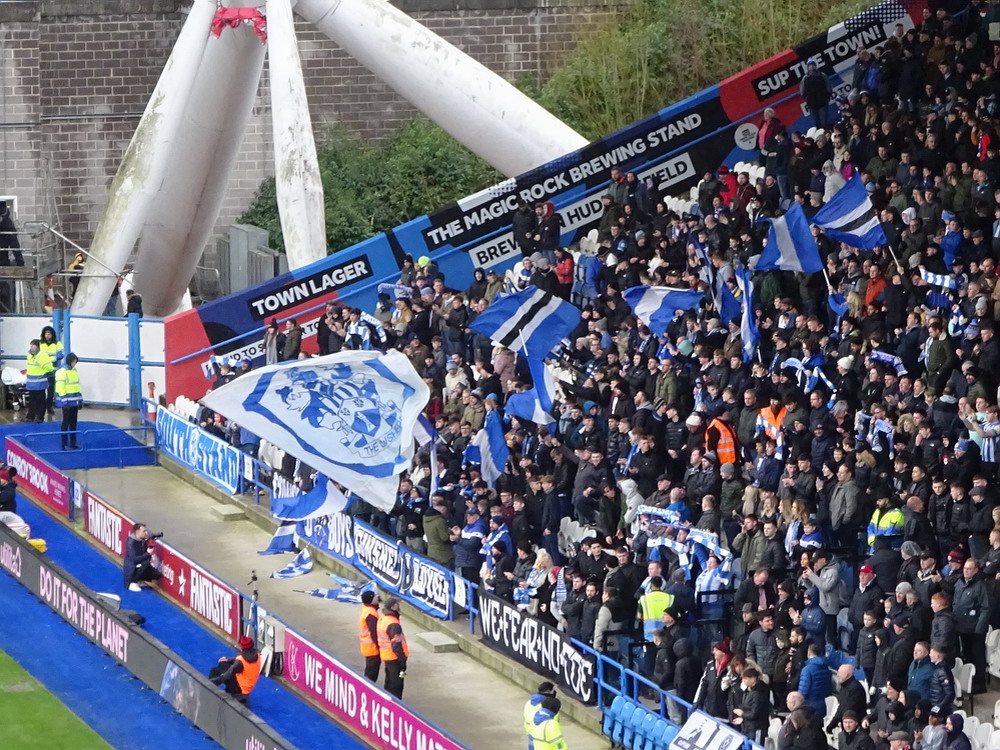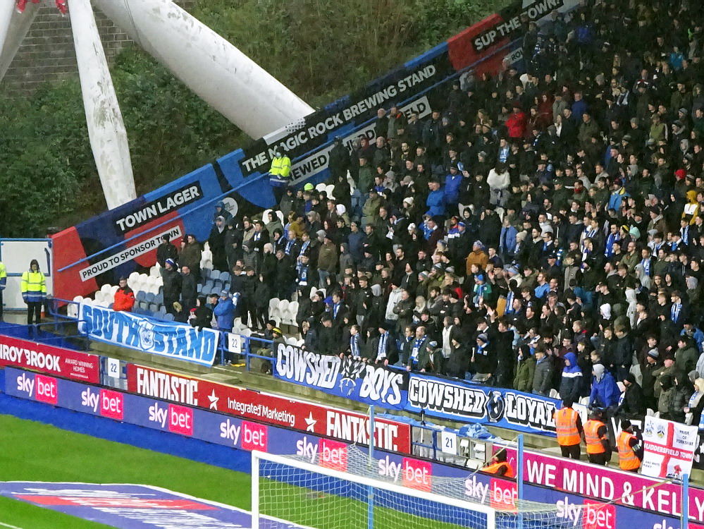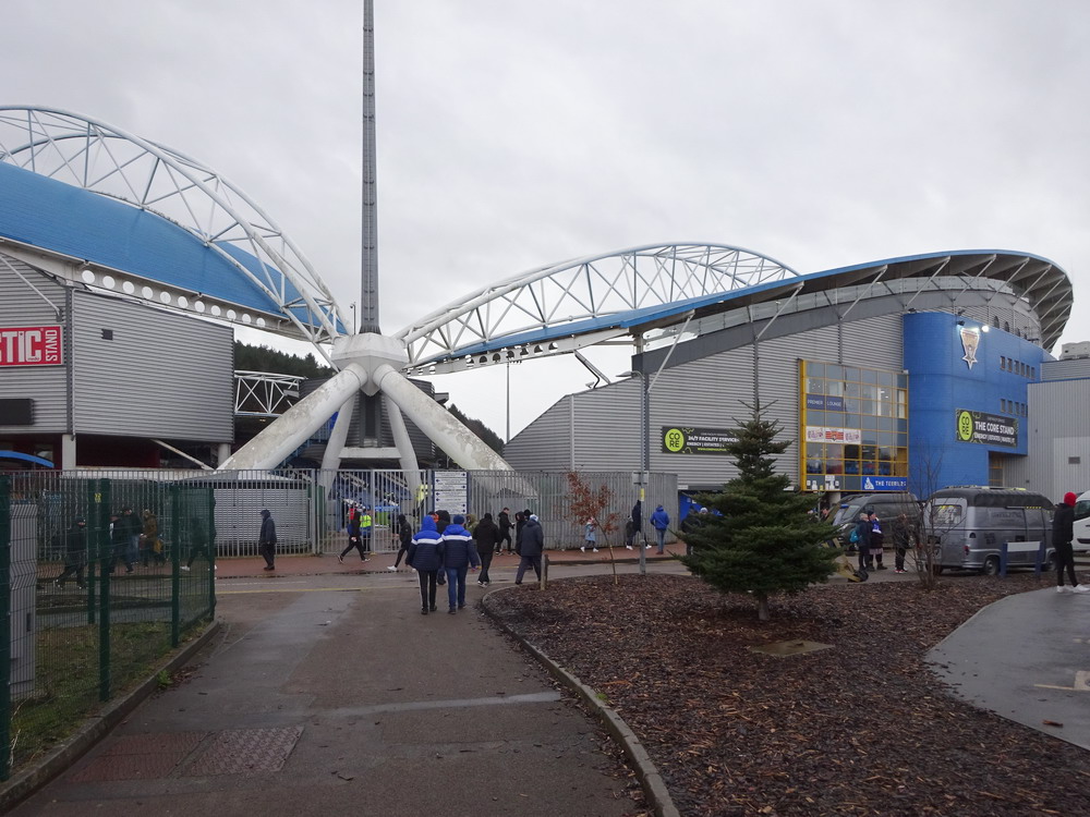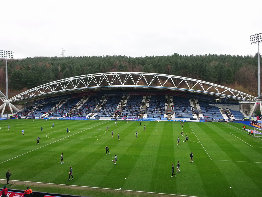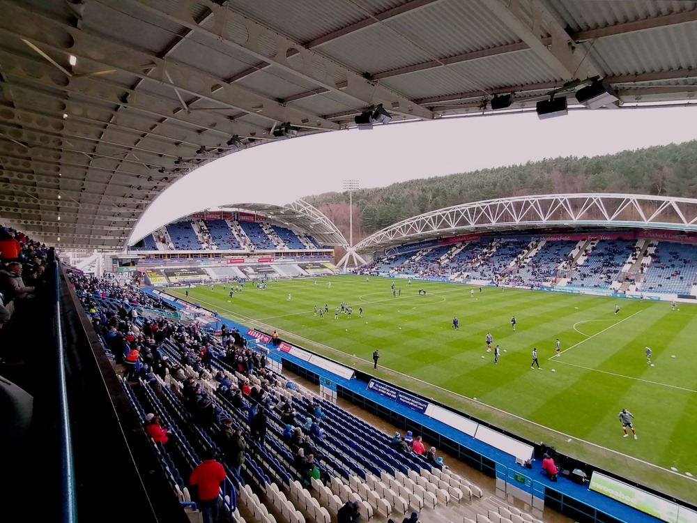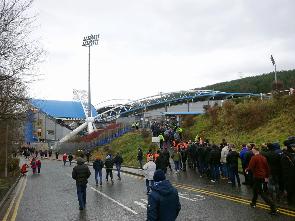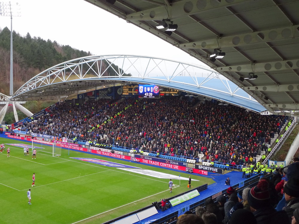 Ich mag mein Hobby ja echt, wenn nur nicht so oft dieses frühe Aufstehen nötig wäre. Am Gate traf ich noch die Kölner Genossen Tobi und Alex – die Fußballwelt bleibt halt überschaubar groß, auch wenn sich die Ziele nicht vollständig glichen. In Huddersfield reichte es noch für ein English Breakfast und zwei Pint Guinness. Der Huddersfield Town FC ist mir nicht sonderlich sympathisch ohne dass ich das wirklich begründen kann. United sah ich heute schon das vierte Mal. Neben dem Derby daheim und bei Wednesday hatte ich seinerzeit in Wembley das Playoff-Finale um den Aufstieg in die zweite Liga besucht. Gegner war… Huddersfield Town, das nach torlosen 120 Minuten in einem typisch englischen erbärmlichen Elfmeterschießen nach 22 Schüssen letztlich gewann. Vielleicht mag ich die Terrier auch deshalb nicht besonders. Das Kirklees Stadium weicht auch mal völlig vom typischen Stil – auch neuerer – britischer Stadien ab. Grundsätzlich sieht die Bude mit den gewölbten Dächern zwar ganz interessant und individuell aus, passt aber einfach nicht in die hiesige Stadionlandschaft. Der Away-Sektor war komplett gefüllt, etwa 2500 Blades dürften den Weg hergefunden haben. Dass wir dann das einzige torlose Spiel der Liga-Runde sahen, war mal beinahe erwartbar. Die Qualität der Partie war aber für ein zweitklassiges Spiel auch einigermaßen besorgniserregend. Ich kann mir auch diesen eklatanten Niveauabfall unterhalb der Premier League nicht recht erklären. Den Blades wäre kurz vor Ende beinahe noch der Lucky Punch gelungen, verdient wäre es nicht gewesen. Stimmung natürlich auch erwartungsgemäß verheerend. Die kleine Ecke mit den aktiven Town-Supportern, unverständlicherweise auf derselben Tribüne beheimatet wie der Gästeblock, brachte nicht viel zustande und der United-Anhang enttäuschte ebenfalls auf ganzer Linie. Mittlerweile bewahrheitete sich die Wettervorhersage und ein englischer Schnürregen begleitete uns hinaus.