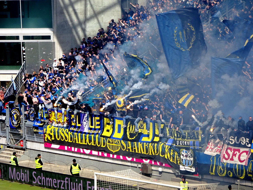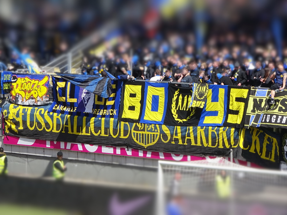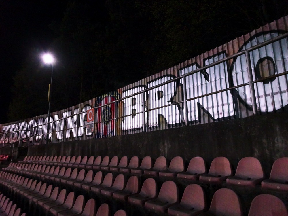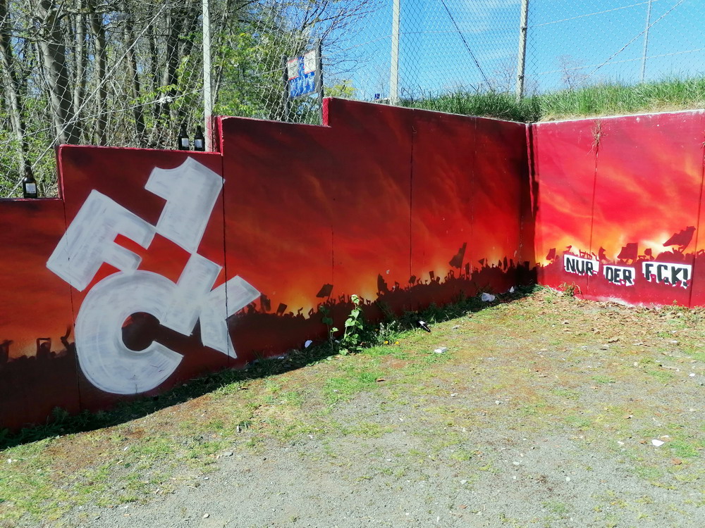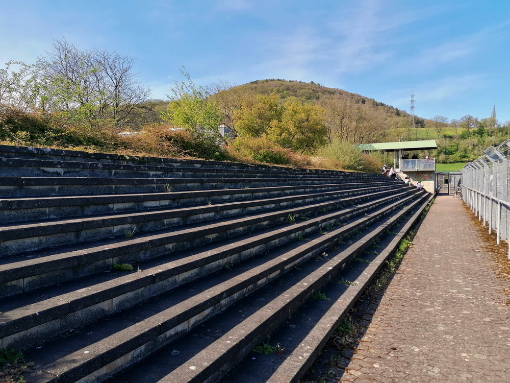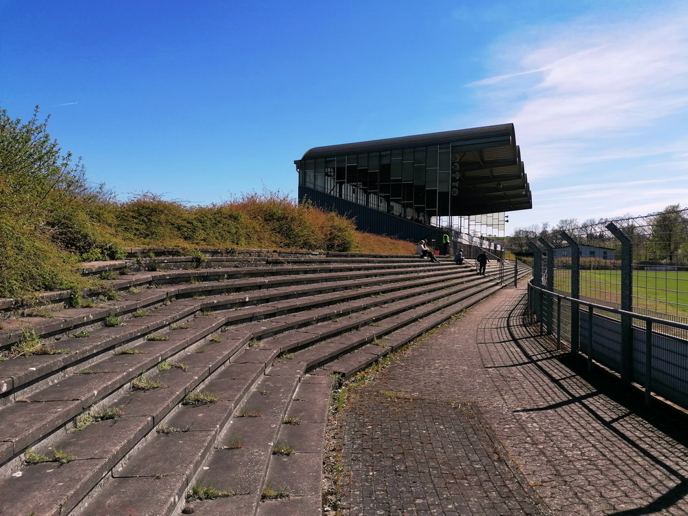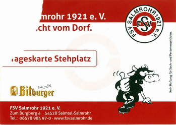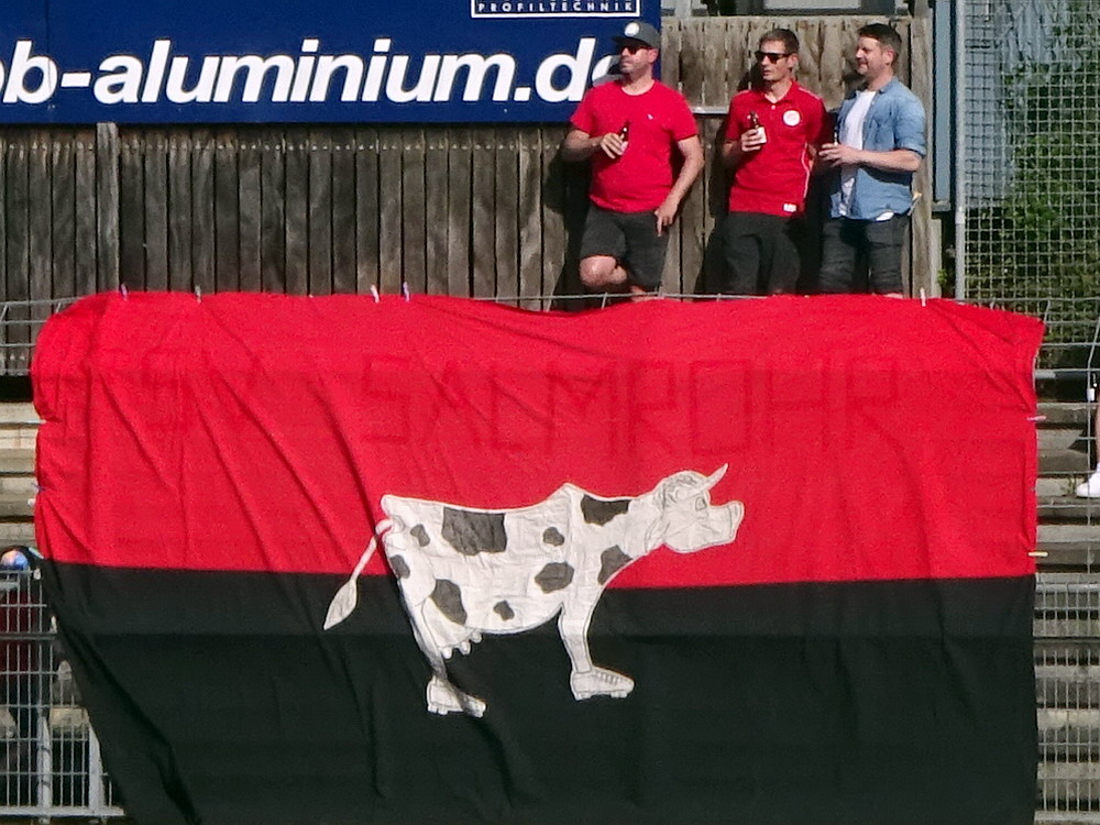 Nach 25 Jahren mal wieder zu Gast im Salmtal. Nicht weil ich es unbedingt wollte, aber so konnte ich Daniel ein Stück mitnehmen, der am Abend von Luxemburg gen Spanien flog und es passte zum Heimweg. Und schließlich ist es ja ein sehenswertes kleines Stadion auf dem Dorf. Fünfmal so viele Einwohner wie der kleine Ort hat, passen in das Rund hinein. Seine beste Phase hatte der Verein Mitte der 80er Jahre, als der Club es sogar für ein Jahr in die zweite Liga schaffte. Das war auch der Grund, warum die überdachte Haupttribüne errichtet wurde. Dumm nur, dass kurz nach Fertigstellung der direkte Wiederabstieg folgte und der FSV nie wieder so hochklassig spielen sollte. Bis zur Jahrtausendwende hielt sich der Verein auf drittklassigem Niveau, danach ging es weiter abwärts, heute wird immerhin noch in der fünftklassigen Oberliga gespielt. Dass es dazu kam, war auch der Vernunft geschuldet, denn in den 90ern setzte man sich mit der Trierer Eintracht zwecks Kooperation an einen Tisch, da diese strukturschwache Region nur einen höherklassigen Verein vertragen konnte und wohl auch heute noch kann. Natürlich konnte der Standort für gebündelte Kräfte nur Trier lauten und der FSV Salmrohr geriet ab da zur zweiten Kraft in der Moselregion. Das erkennt auch die ausgebaute der beiden Kurven neidlos an und gibt sich nach und nach wieder der Natur frei. In der Platzierungsrunde mussten dringend Punkte gegen den Abstieg gesammelt werden, was mit einem verdienten 2:0-Sieg gegen den FC Speyer auch gelang. Eine Handvoll biertrinkende Leute versammelte sich hinter einer großen Fahne mit einer Kuh und genoss den Erfolg schweigend. Ein besseres Symbolbild hätte hier auch nicht gewählt werden können.