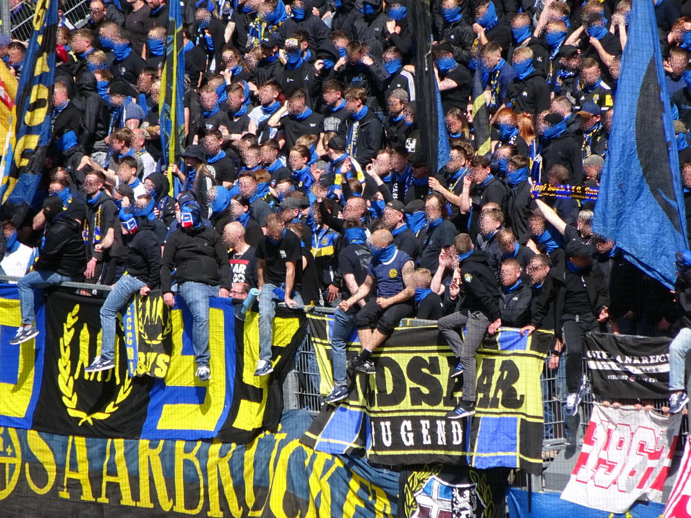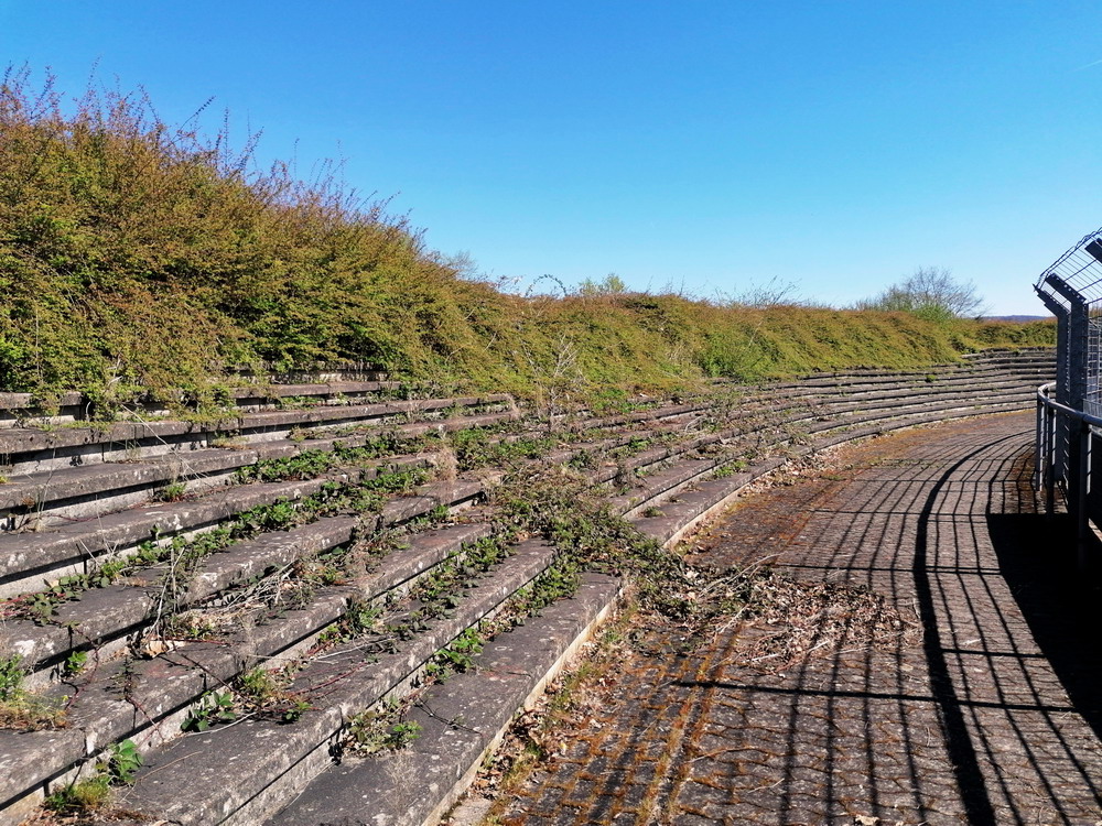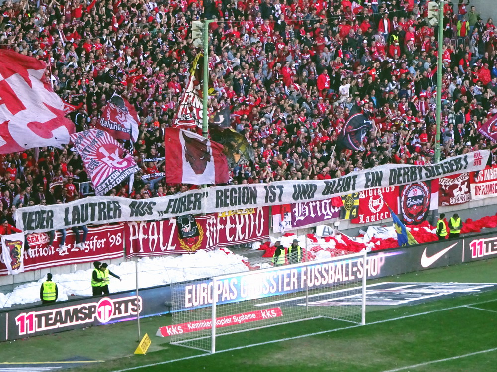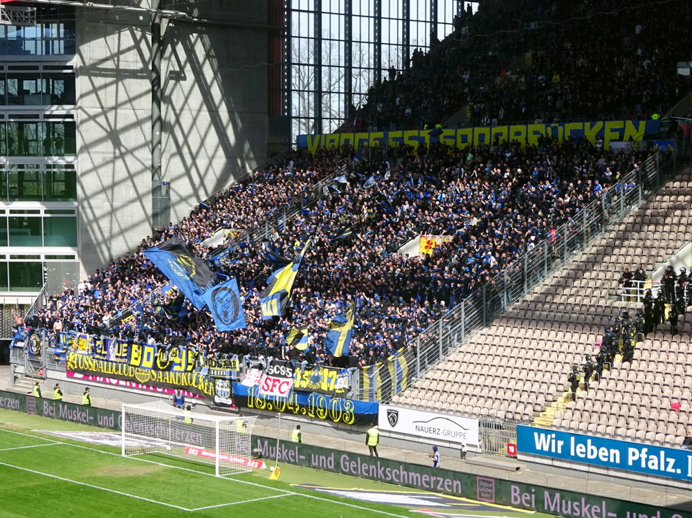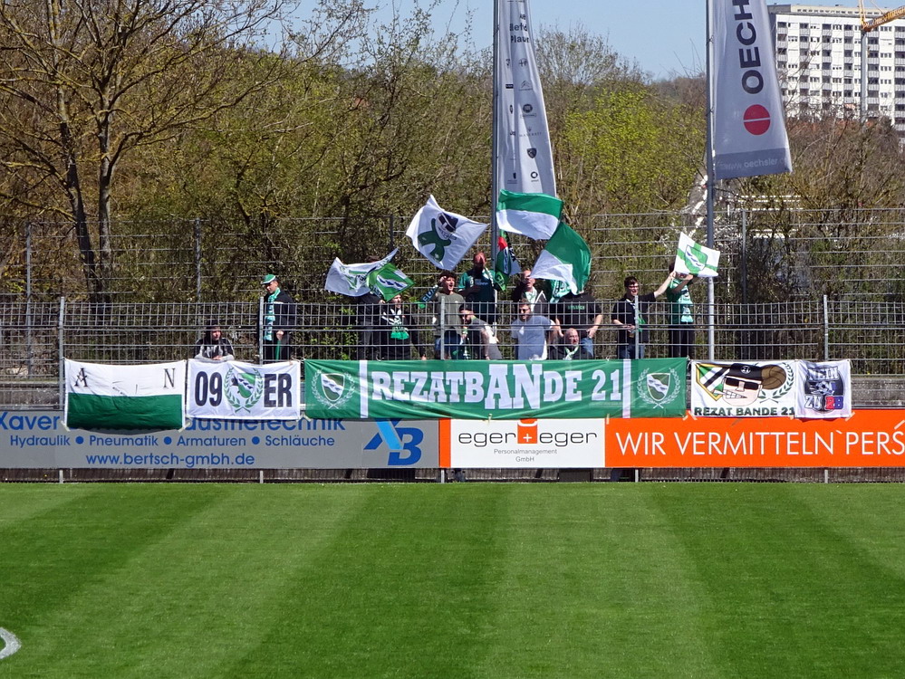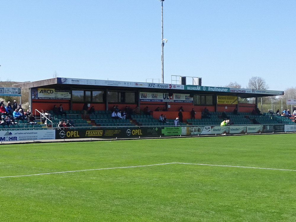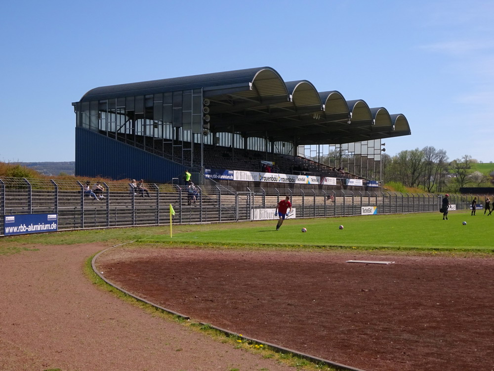 Nach 25 Jahren mal wieder zu Gast im Salmtal. Nicht weil ich es unbedingt wollte, aber so konnte ich Daniel ein Stück mitnehmen, der am Abend von Luxemburg gen Spanien flog und es passte zum Heimweg. Und schließlich ist es ja ein sehenswertes kleines Stadion auf dem Dorf. Fünfmal so viele Einwohner wie der kleine Ort hat, passen in das Rund hinein. Seine beste Phase hatte der Verein Mitte der 80er Jahre, als der Club es sogar für ein Jahr in die zweite Liga schaffte. Das war auch der Grund, warum die überdachte Haupttribüne errichtet wurde. Dumm nur, dass kurz nach Fertigstellung der direkte Wiederabstieg folgte und der FSV nie wieder so hochklassig spielen sollte. Bis zur Jahrtausendwende hielt sich der Verein auf drittklassigem Niveau, danach ging es weiter abwärts, heute wird immerhin noch in der fünftklassigen Oberliga gespielt. Dass es dazu kam, war auch der Vernunft geschuldet, denn in den 90ern setzte man sich mit der Trierer Eintracht zwecks Kooperation an einen Tisch, da diese strukturschwache Region nur einen höherklassigen Verein vertragen konnte und wohl auch heute noch kann. Natürlich konnte der Standort für gebündelte Kräfte nur Trier lauten und der FSV Salmrohr geriet ab da zur zweiten Kraft in der Moselregion. Das erkennt auch die ausgebaute der beiden Kurven neidlos an und gibt sich nach und nach wieder der Natur frei. In der Platzierungsrunde mussten dringend Punkte gegen den Abstieg gesammelt werden, was mit einem verdienten 2:0-Sieg gegen den FC Speyer auch gelang. Eine Handvoll biertrinkende Leute versammelte sich hinter einer großen Fahne mit einer Kuh und genoss den Erfolg schweigend. Ein besseres Symbolbild hätte hier auch nicht gewählt werden können.