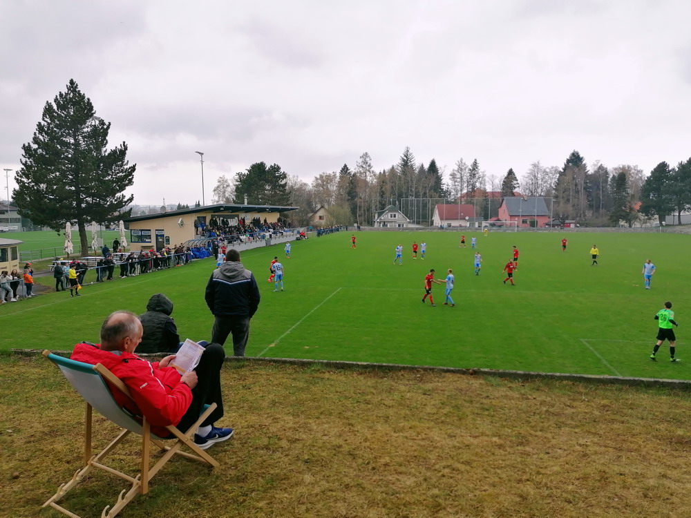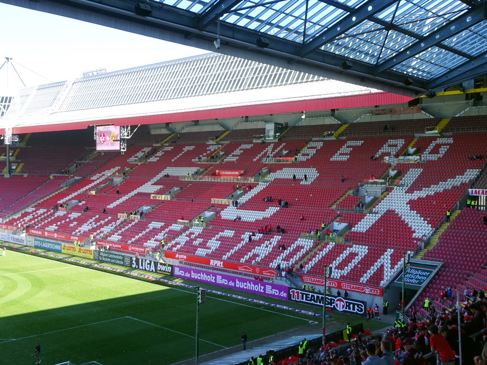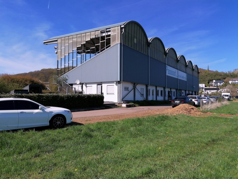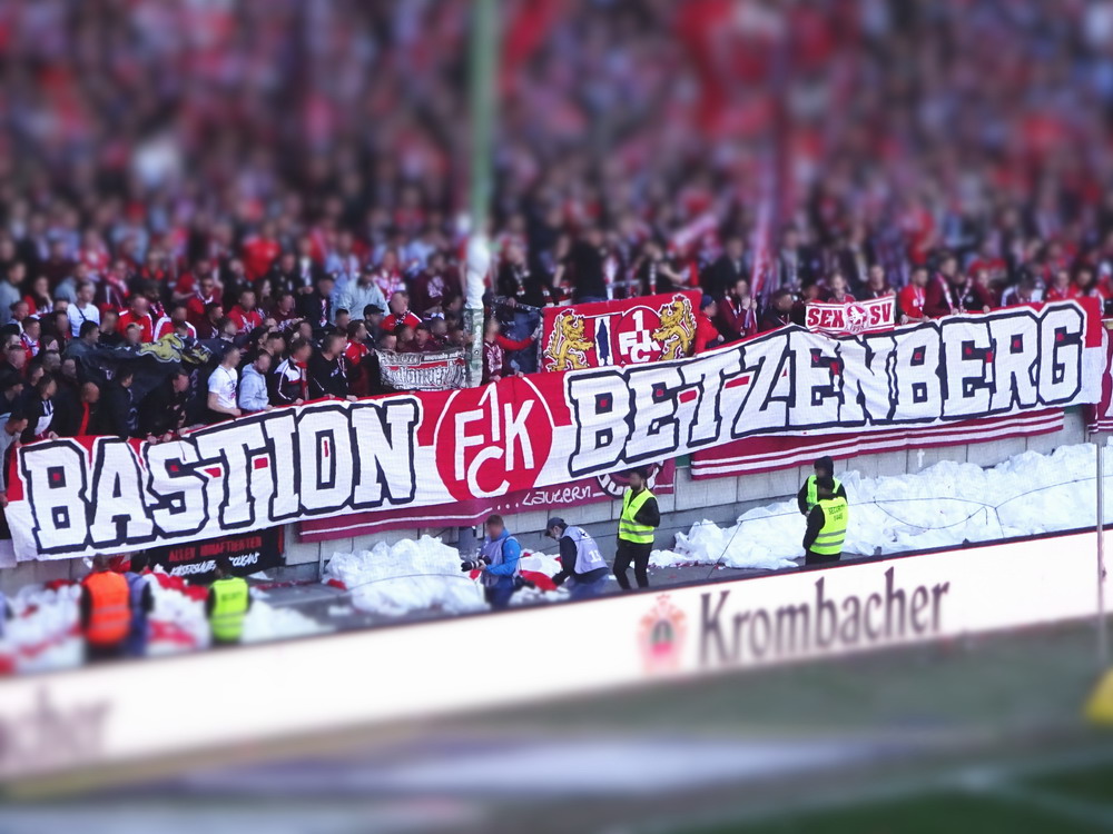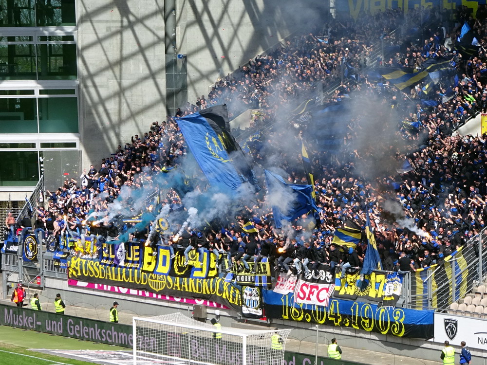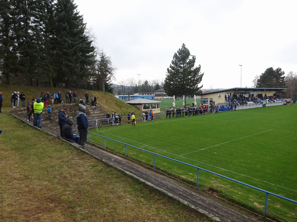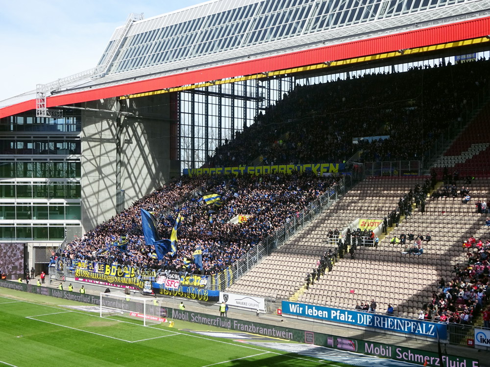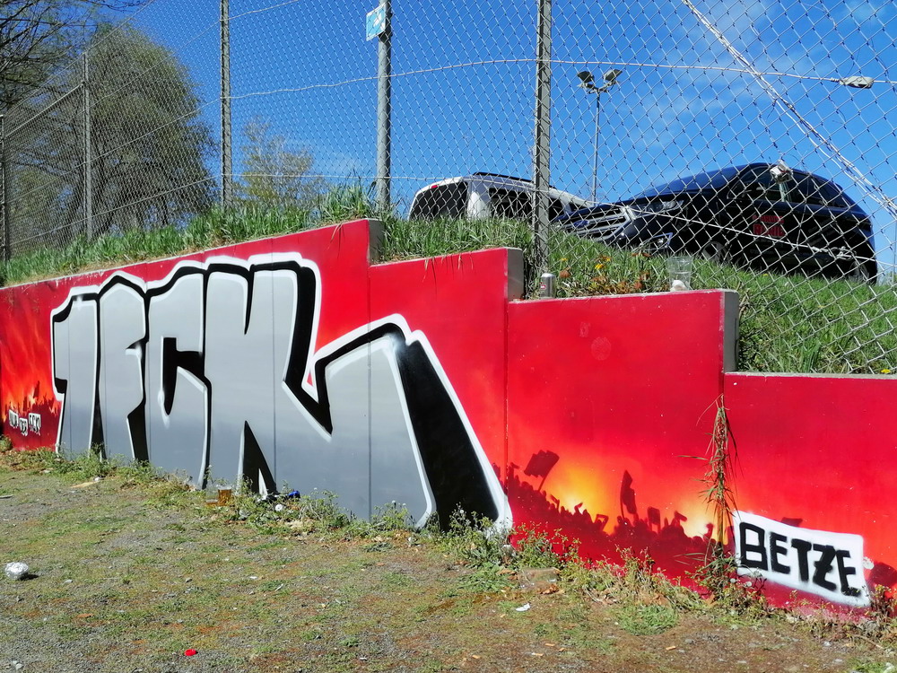 Nach 25 Jahren mal wieder zu Gast im Salmtal. Nicht weil ich es unbedingt wollte, aber so konnte ich Daniel ein Stück mitnehmen, der am Abend von Luxemburg gen Spanien flog und es passte zum Heimweg. Und schließlich ist es ja ein sehenswertes kleines Stadion auf dem Dorf. Fünfmal so viele Einwohner wie der kleine Ort hat, passen in das Rund hinein. Seine beste Phase hatte der Verein Mitte der 80er Jahre, als der Club es sogar für ein Jahr in die zweite Liga schaffte. Das war auch der Grund, warum die überdachte Haupttribüne errichtet wurde. Dumm nur, dass kurz nach Fertigstellung der direkte Wiederabstieg folgte und der FSV nie wieder so hochklassig spielen sollte. Bis zur Jahrtausendwende hielt sich der Verein auf drittklassigem Niveau, danach ging es weiter abwärts, heute wird immerhin noch in der fünftklassigen Oberliga gespielt. Dass es dazu kam, war auch der Vernunft geschuldet, denn in den 90ern setzte man sich mit der Trierer Eintracht zwecks Kooperation an einen Tisch, da diese strukturschwache Region nur einen höherklassigen Verein vertragen konnte und wohl auch heute noch kann. Natürlich konnte der Standort für gebündelte Kräfte nur Trier lauten und der FSV Salmrohr geriet ab da zur zweiten Kraft in der Moselregion. Das erkennt auch die ausgebaute der beiden Kurven neidlos an und gibt sich nach und nach wieder der Natur frei. In der Platzierungsrunde mussten dringend Punkte gegen den Abstieg gesammelt werden, was mit einem verdienten 2:0-Sieg gegen den FC Speyer auch gelang. Eine Handvoll biertrinkende Leute versammelte sich hinter einer großen Fahne mit einer Kuh und genoss den Erfolg schweigend. Ein besseres Symbolbild hätte hier auch nicht gewählt werden können.