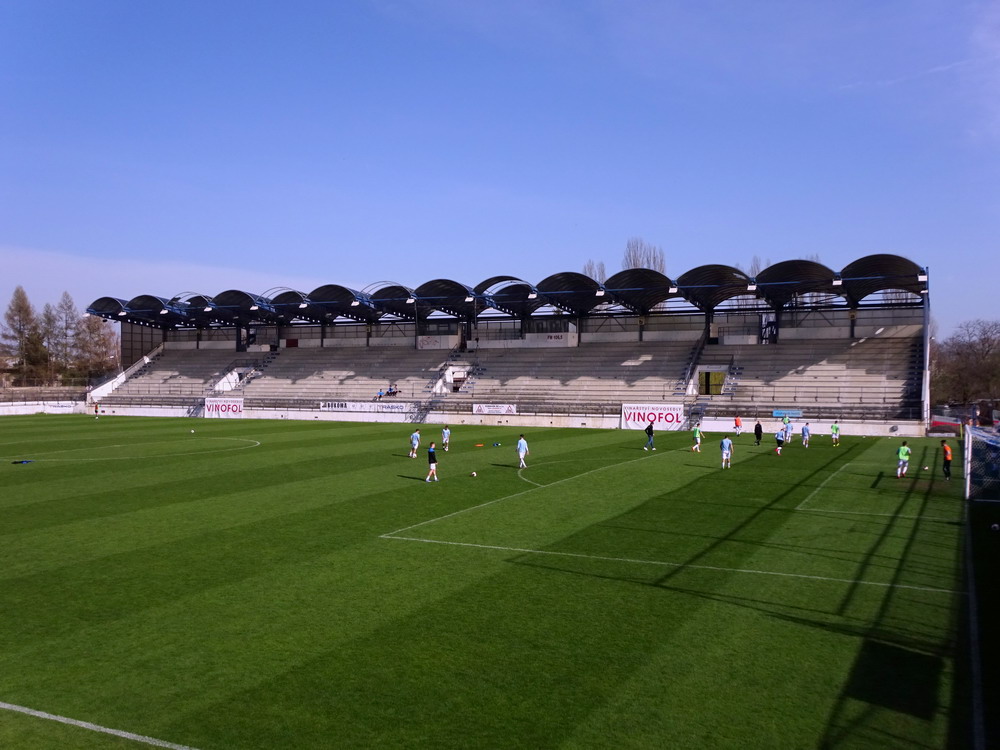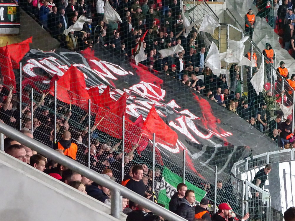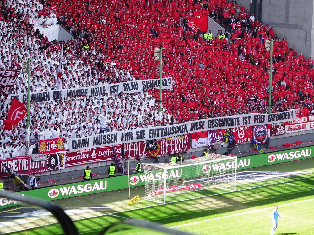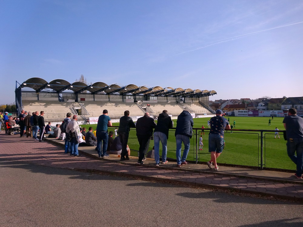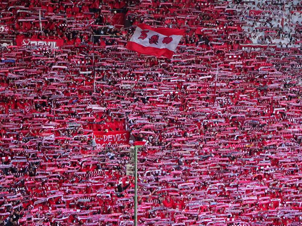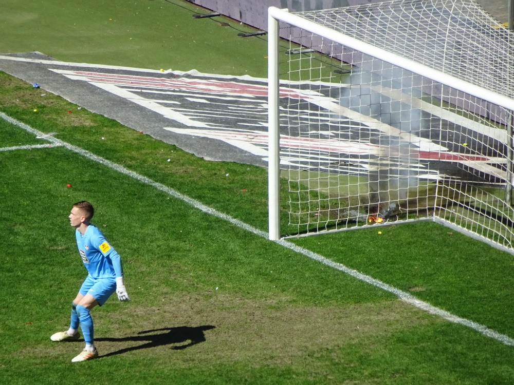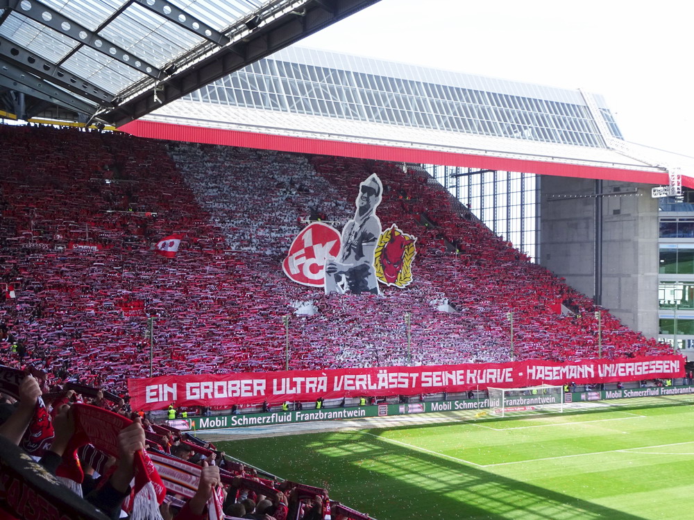 Nach 25 Jahren mal wieder zu Gast im Salmtal. Nicht weil ich es unbedingt wollte, aber so konnte ich Daniel ein Stück mitnehmen, der am Abend von Luxemburg gen Spanien flog und es passte zum Heimweg. Und schließlich ist es ja ein sehenswertes kleines Stadion auf dem Dorf. Fünfmal so viele Einwohner wie der kleine Ort hat, passen in das Rund hinein. Seine beste Phase hatte der Verein Mitte der 80er Jahre, als der Club es sogar für ein Jahr in die zweite Liga schaffte. Das war auch der Grund, warum die überdachte Haupttribüne errichtet wurde. Dumm nur, dass kurz nach Fertigstellung der direkte Wiederabstieg folgte und der FSV nie wieder so hochklassig spielen sollte. Bis zur Jahrtausendwende hielt sich der Verein auf drittklassigem Niveau, danach ging es weiter abwärts, heute wird immerhin noch in der fünftklassigen Oberliga gespielt. Dass es dazu kam, war auch der Vernunft geschuldet, denn in den 90ern setzte man sich mit der Trierer Eintracht zwecks Kooperation an einen Tisch, da diese strukturschwache Region nur einen höherklassigen Verein vertragen konnte und wohl auch heute noch kann. Natürlich konnte der Standort für gebündelte Kräfte nur Trier lauten und der FSV Salmrohr geriet ab da zur zweiten Kraft in der Moselregion. Das erkennt auch die ausgebaute der beiden Kurven neidlos an und gibt sich nach und nach wieder der Natur frei. In der Platzierungsrunde mussten dringend Punkte gegen den Abstieg gesammelt werden, was mit einem verdienten 2:0-Sieg gegen den FC Speyer auch gelang. Eine Handvoll biertrinkende Leute versammelte sich hinter einer großen Fahne mit einer Kuh und genoss den Erfolg schweigend. Ein besseres Symbolbild hätte hier auch nicht gewählt werden können.