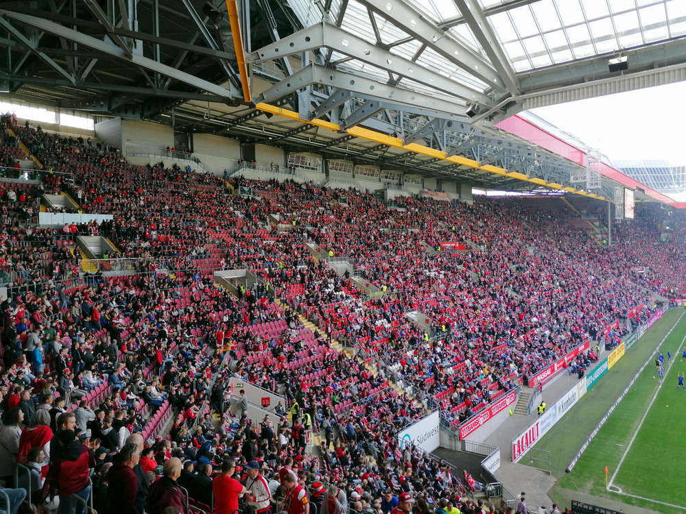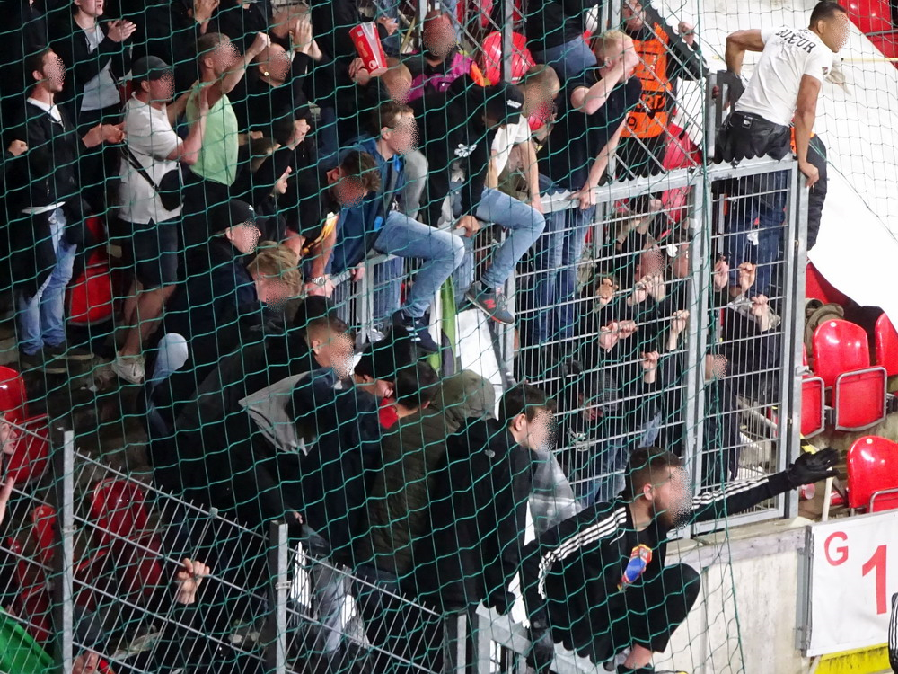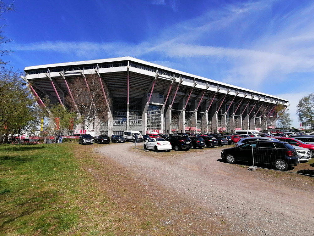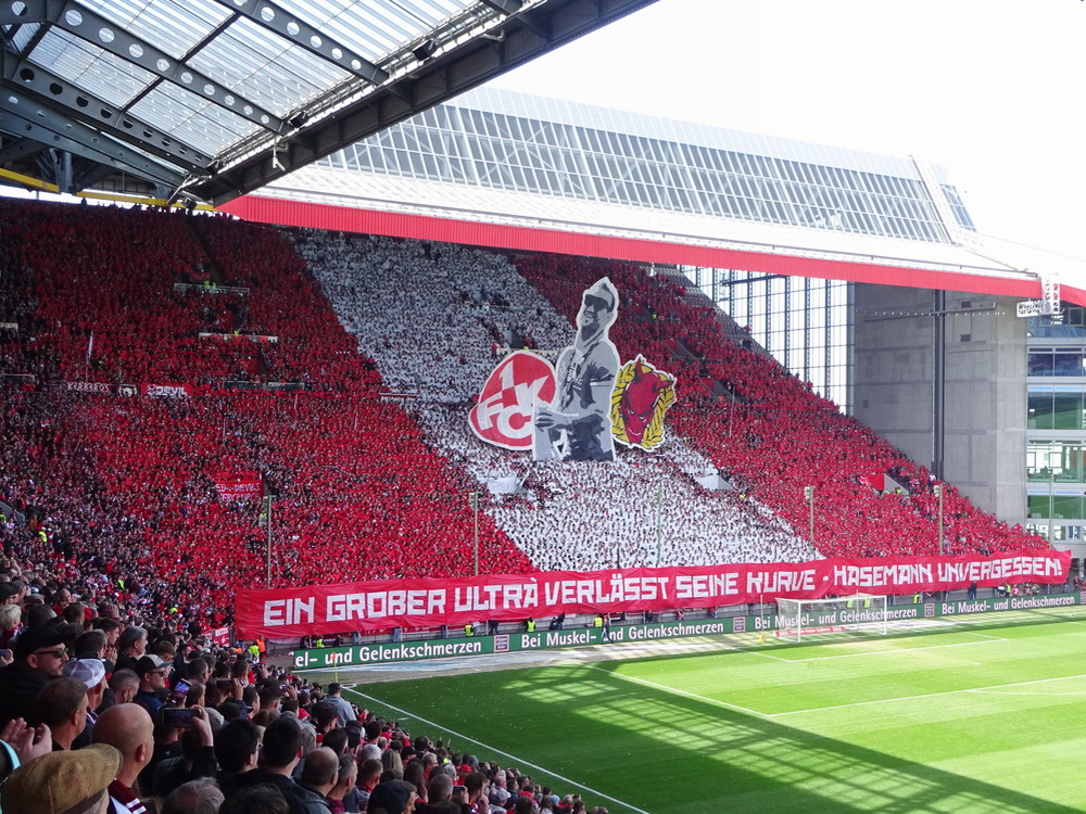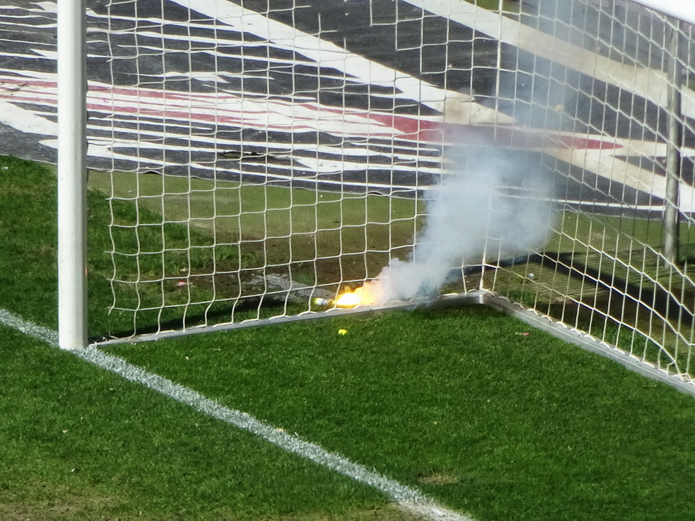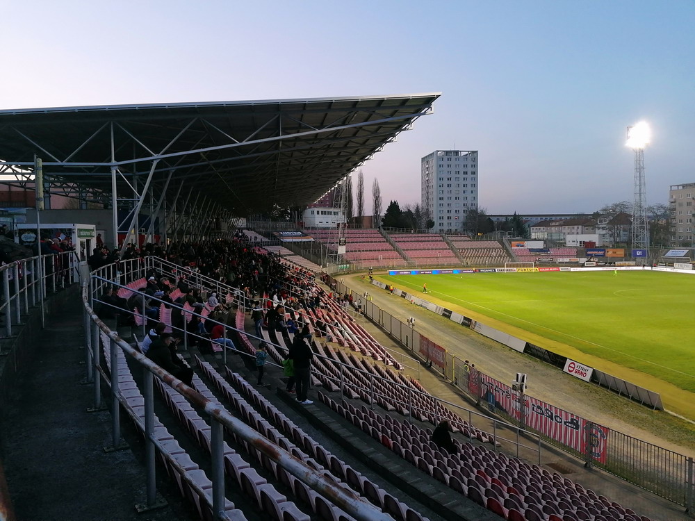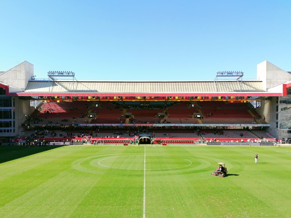 Nach 25 Jahren mal wieder zu Gast im Salmtal. Nicht weil ich es unbedingt wollte, aber so konnte ich Daniel ein Stück mitnehmen, der am Abend von Luxemburg gen Spanien flog und es passte zum Heimweg. Und schließlich ist es ja ein sehenswertes kleines Stadion auf dem Dorf. Fünfmal so viele Einwohner wie der kleine Ort hat, passen in das Rund hinein. Seine beste Phase hatte der Verein Mitte der 80er Jahre, als der Club es sogar für ein Jahr in die zweite Liga schaffte. Das war auch der Grund, warum die überdachte Haupttribüne errichtet wurde. Dumm nur, dass kurz nach Fertigstellung der direkte Wiederabstieg folgte und der FSV nie wieder so hochklassig spielen sollte. Bis zur Jahrtausendwende hielt sich der Verein auf drittklassigem Niveau, danach ging es weiter abwärts, heute wird immerhin noch in der fünftklassigen Oberliga gespielt. Dass es dazu kam, war auch der Vernunft geschuldet, denn in den 90ern setzte man sich mit der Trierer Eintracht zwecks Kooperation an einen Tisch, da diese strukturschwache Region nur einen höherklassigen Verein vertragen konnte und wohl auch heute noch kann. Natürlich konnte der Standort für gebündelte Kräfte nur Trier lauten und der FSV Salmrohr geriet ab da zur zweiten Kraft in der Moselregion. Das erkennt auch die ausgebaute der beiden Kurven neidlos an und gibt sich nach und nach wieder der Natur frei. In der Platzierungsrunde mussten dringend Punkte gegen den Abstieg gesammelt werden, was mit einem verdienten 2:0-Sieg gegen den FC Speyer auch gelang. Eine Handvoll biertrinkende Leute versammelte sich hinter einer großen Fahne mit einer Kuh und genoss den Erfolg schweigend. Ein besseres Symbolbild hätte hier auch nicht gewählt werden können.