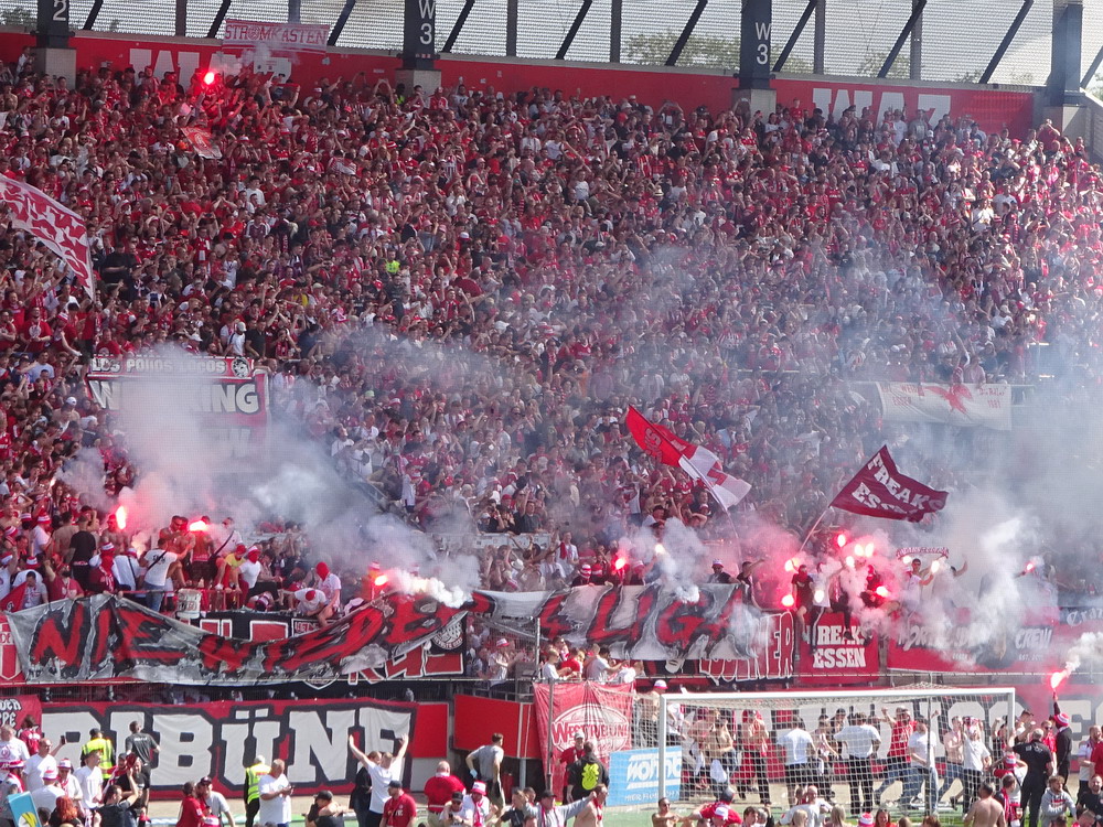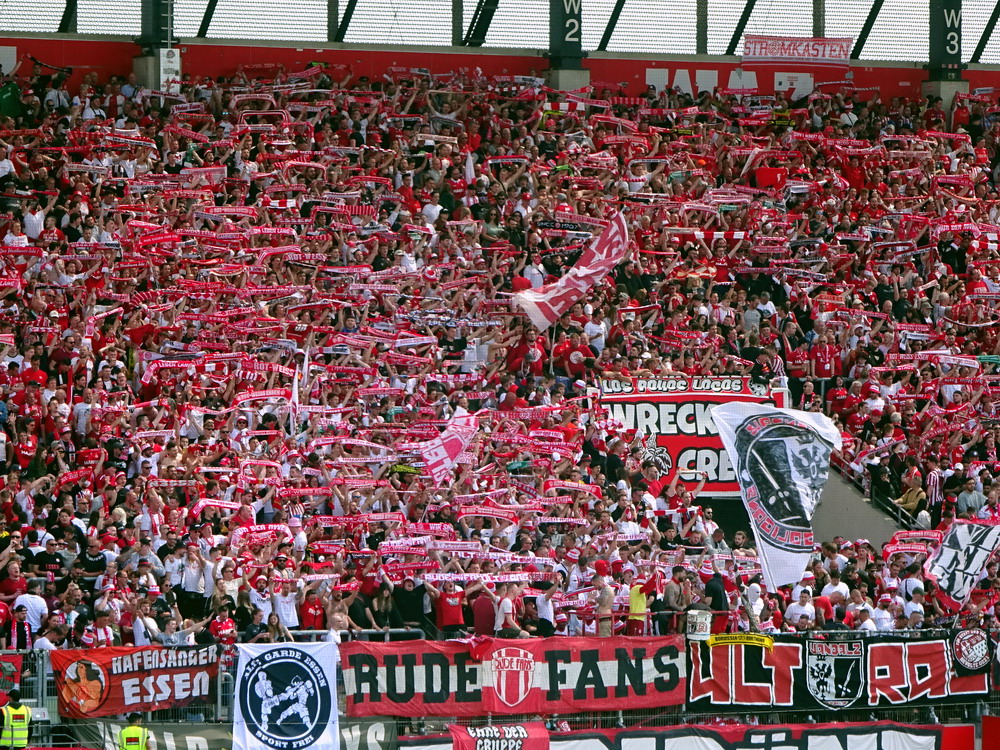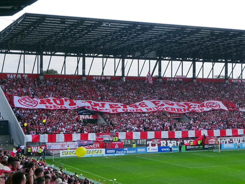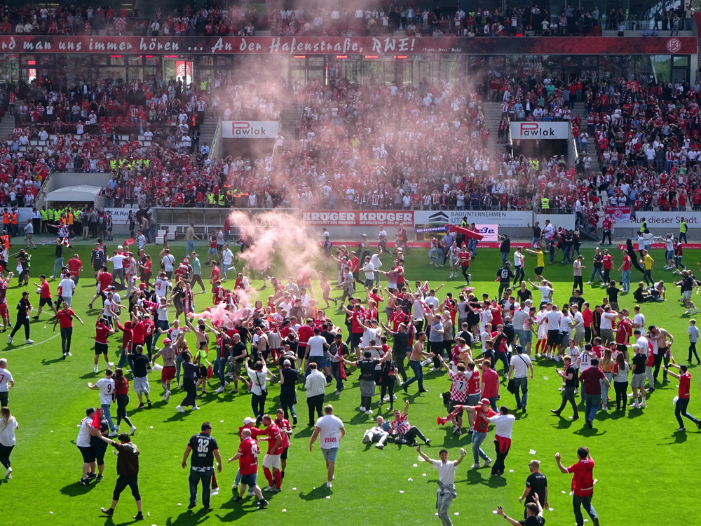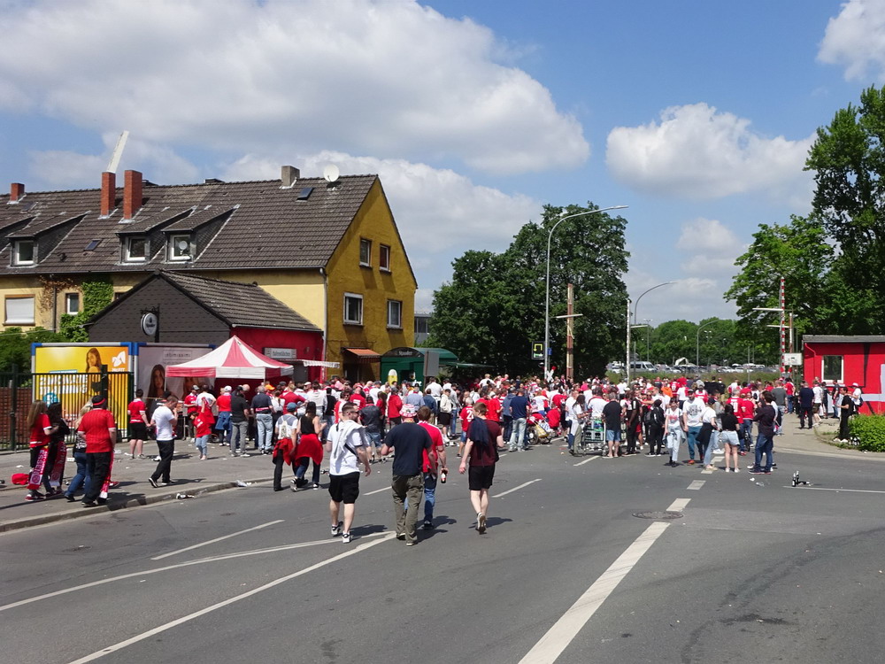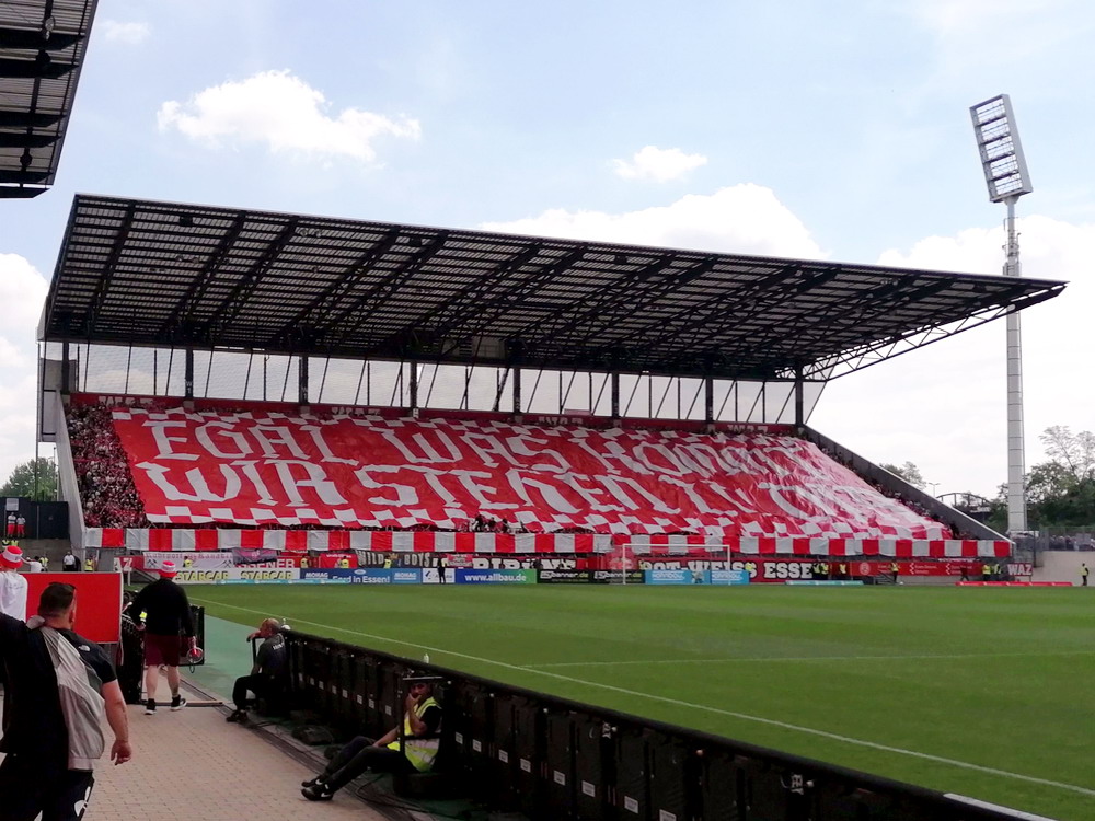 Was für ein Wahnsinns-Tag! Und was haben wir uns diesen Tag Jahr für Jahr herbeigesehnt! 14 Jahre war es her, dass der glorreiche RWE nach einem skandalträchtigen Spiel die Qualifikation für die eingleisige Dritte Liga verpasste. Und wirklich niemand hätte damals erwartet, dass es bis zum heutigen Tage dauern würde, bis der Deutsche Meister von 1955 wieder mindestens drittklassig spielen würde. Als ich morgens aufstand, verspürte ich keinerlei Nervosität. Eigentlich ungewöhnlich, da mich mein Verein in den letzten Jahren zum Pessimisten umgeschult hat. Aber es war ganz klar – wenn die Truppe mit der Einstellung aus der Vorwoche auf den Platz geht, brauchte man vor nichts und niemandem Angst haben. Mit der Gattin fuhr ich mit dem Bus zu Kumpel Malo. Ich kann mich gar nicht erinnern, wann ich es das letzte Mal erlebt habe, dass an jeder, aber wirklich jeder Haltestelle irgendwer im RWE-Trikot zustieg. Mit nem Stauder in der Hand näherten wir uns zu Fuß der Hafenstraße und das erinnerte an alte Zeiten. Schon geil, was da los war. Die berühmte Kreuzung war belebt wie lange nicht, das Hafenstübchen total belagert, aus dem Stadion drangen schon eine Stunde vor dem Spiel lautstarke Gesänge. Gänsehaut bei 24 Grad, das machte Bock auf mehr!