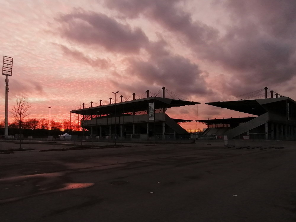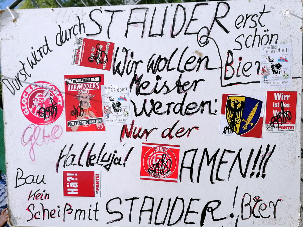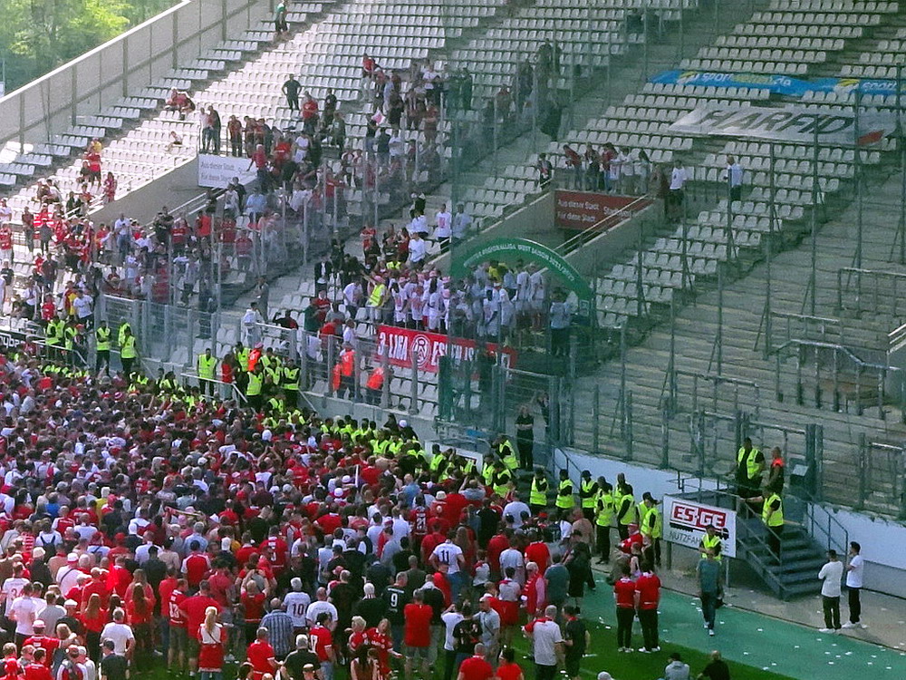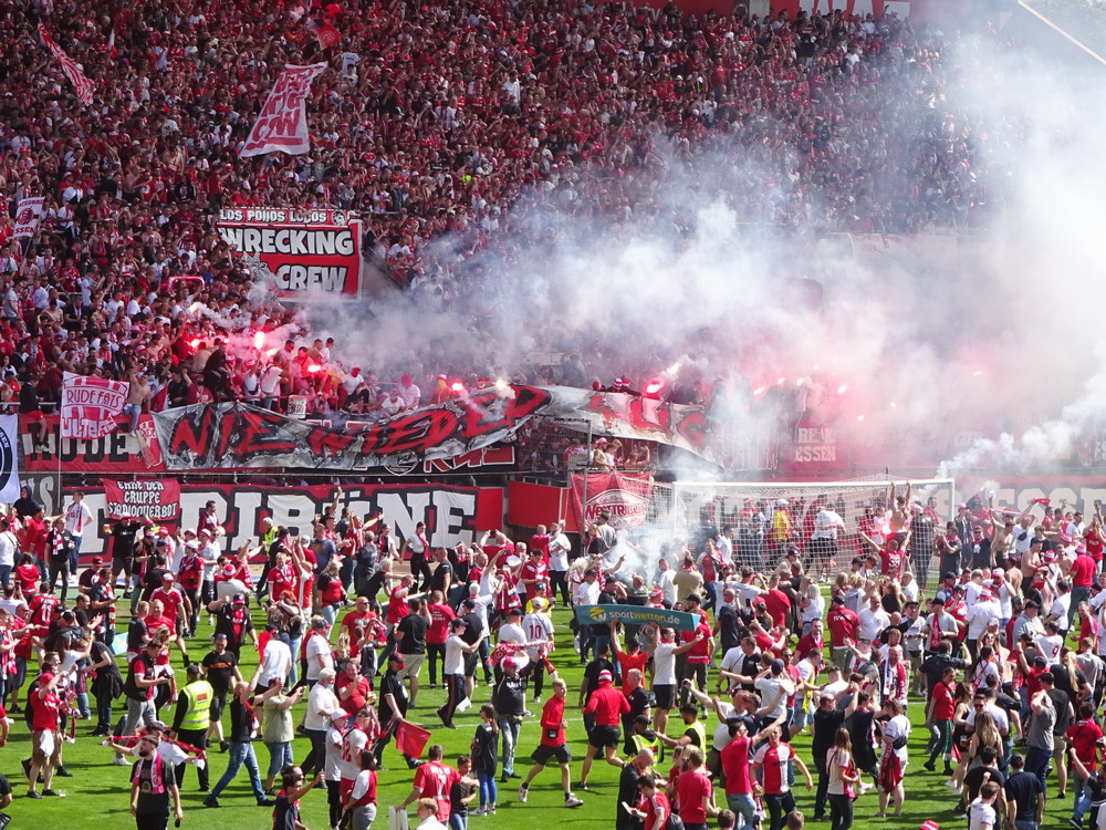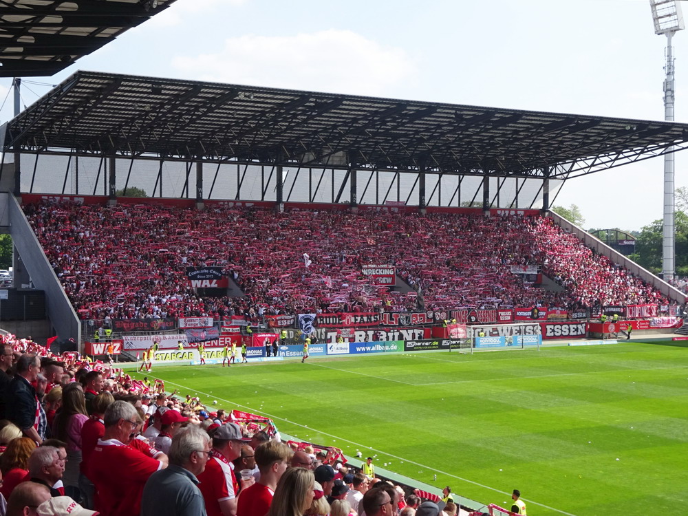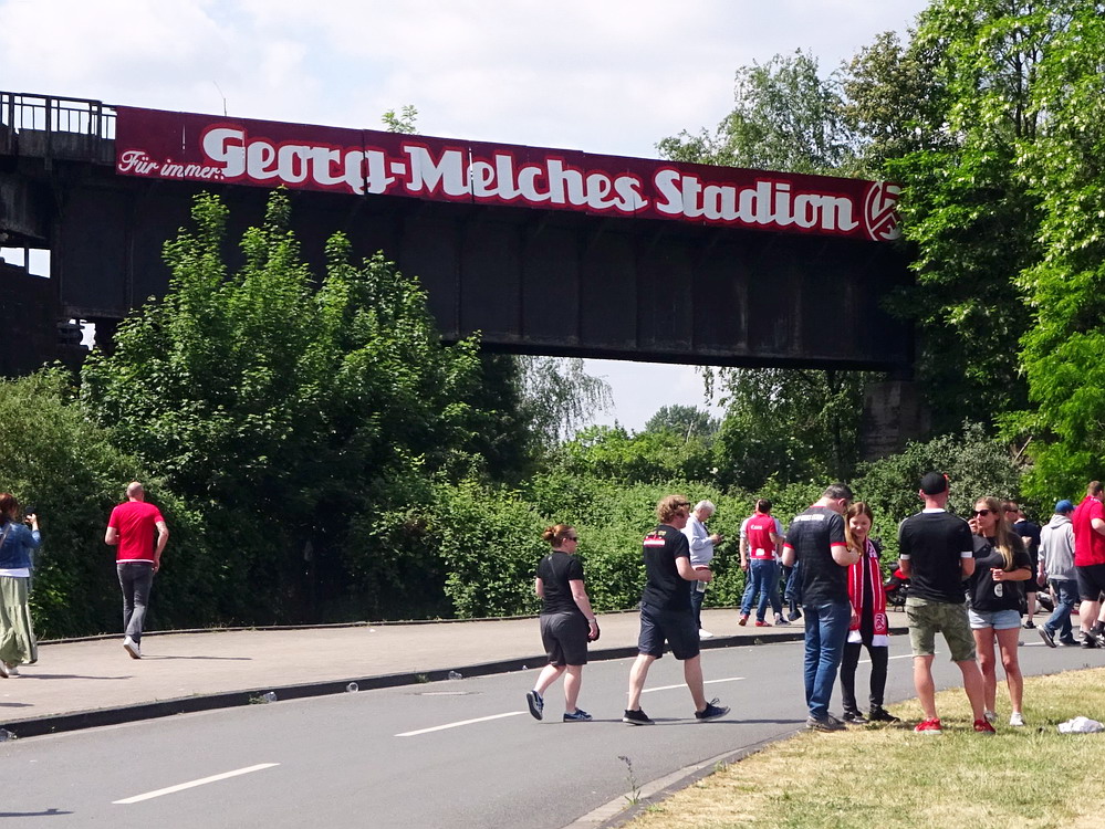 Was für ein Wahnsinns-Tag! Und was haben wir uns diesen Tag Jahr für Jahr herbeigesehnt! 14 Jahre war es her, dass der glorreiche RWE nach einem skandalträchtigen Spiel die Qualifikation für die eingleisige Dritte Liga verpasste. Und wirklich niemand hätte damals erwartet, dass es bis zum heutigen Tage dauern würde, bis der Deutsche Meister von 1955 wieder mindestens drittklassig spielen würde. Als ich morgens aufstand, verspürte ich keinerlei Nervosität. Eigentlich ungewöhnlich, da mich mein Verein in den letzten Jahren zum Pessimisten umgeschult hat. Aber es war ganz klar – wenn die Truppe mit der Einstellung aus der Vorwoche auf den Platz geht, brauchte man vor nichts und niemandem Angst haben. Mit der Gattin fuhr ich mit dem Bus zu Kumpel Malo. Ich kann mich gar nicht erinnern, wann ich es das letzte Mal erlebt habe, dass an jeder, aber wirklich jeder Haltestelle irgendwer im RWE-Trikot zustieg. Mit nem Stauder in der Hand näherten wir uns zu Fuß der Hafenstraße und das erinnerte an alte Zeiten. Schon geil, was da los war. Die berühmte Kreuzung war belebt wie lange nicht, das Hafenstübchen total belagert, aus dem Stadion drangen schon eine Stunde vor dem Spiel lautstarke Gesänge. Gänsehaut bei 24 Grad, das machte Bock auf mehr!