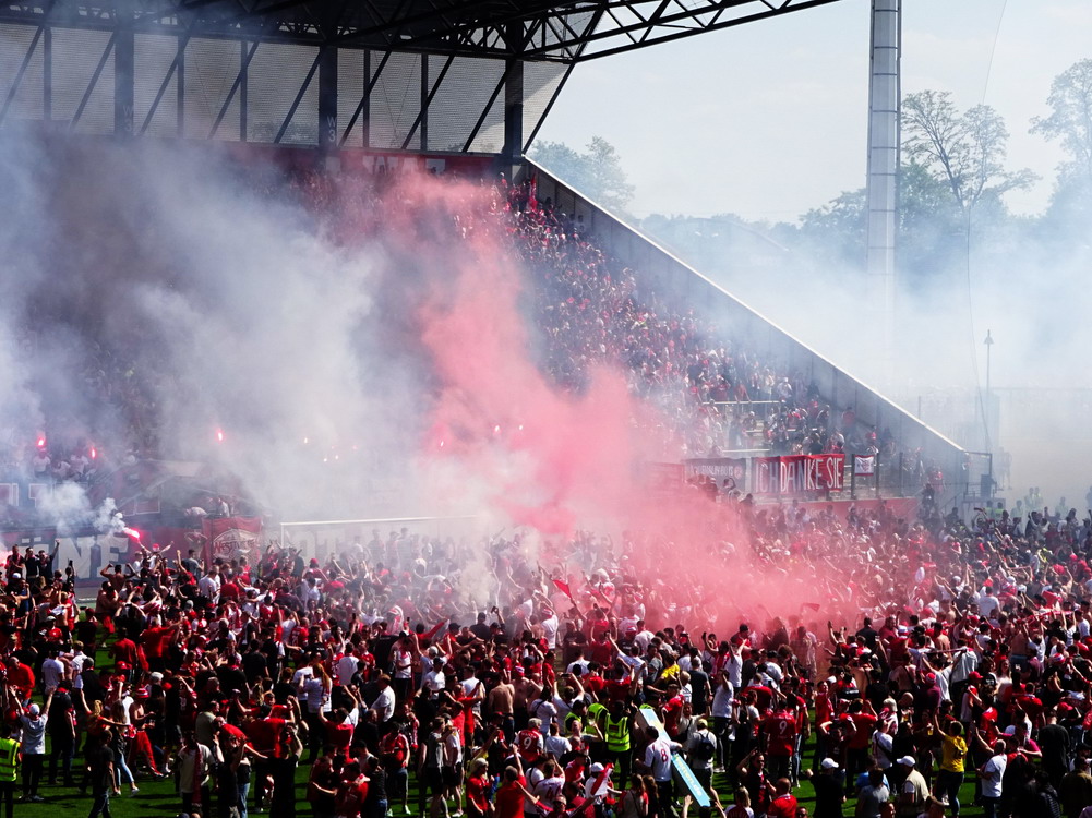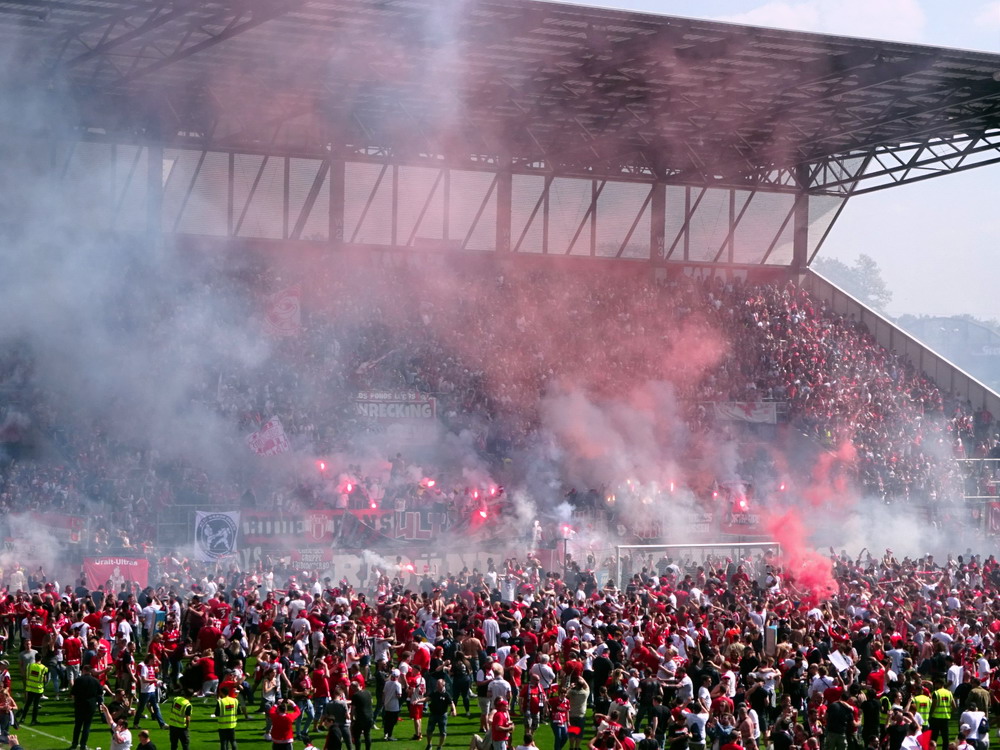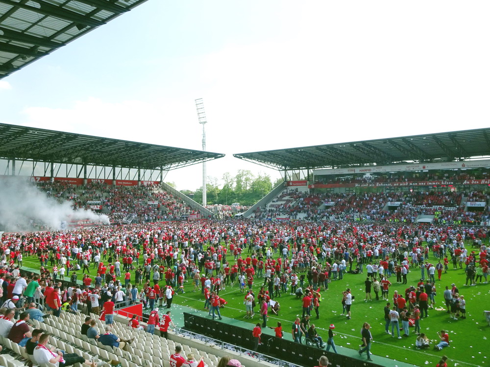 Die Bedingungen waren klar. Von einem Sieg ausgehend, durfte Preußen Münster sein Spiel maximal zwei Tore höher gewinnen, dann wären die Roten dennoch aufgestiegen. Von Sekunde eins an herrschte dann exzellente Stimmung. Es war laut, es war brachial, es war euphorisch. Die 100 Mann aus Ahlen waren nur eine Randnotiz, wurden nie gehört. Die Roten brauchten zehn Minuten, um ins Spiel zu kommen. Der Beginn war sehr nervös, aber die Kulisse gab dem Team spürbar Sicherheit und dann nahm das rot-weisse Schiff den richtigen Kurs auf. Es ging nur noch in Richtung Gäste-Tor und nach einer knappen halben Stunde war es dann soweit, Harenbrock nickte eine Flanke von Kefkir zur Führung ins Tor. Ausrasten, Ekstase, Ausnahmezustand, die Hafenstraße kochte! Als dann kurz vor dem Seitenwechsel durchsickerte, dass die Preußen zurückliegen, gab dieses einen zusätzliche Schub. Ich kann zum weiteren Spielverlauf gar nicht mehr viel schreiben, befand mich ein wenig wie in einem Tunnel, natürlich hatte auch das gute Zeug von Jacob Stauder seinen Anteil daran. Tormaschine Engelmann köpfte nach einer Stunde zur 2:0-Führung ein und danach gab es noch mindestens ein halbes Dutzend weiterer guter Chancen, während die Gäste nicht einen Hauch von Torgefahr ausstrahlten. Der Schlusspfiff kam für mich irgendwie aus dem Nichts und der RWE hatte das große Ziel erreicht – dass die Preußen ihr Spiel noch in einen Sieg gedreht hatten, fiel nicht mehr ins Gewicht.
