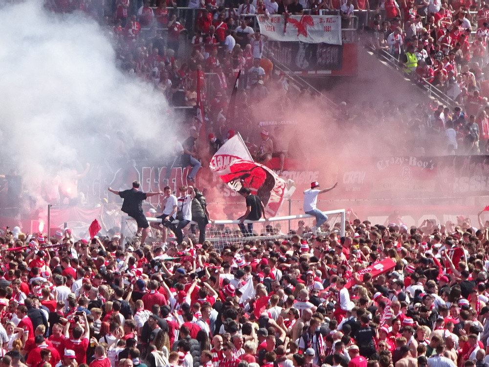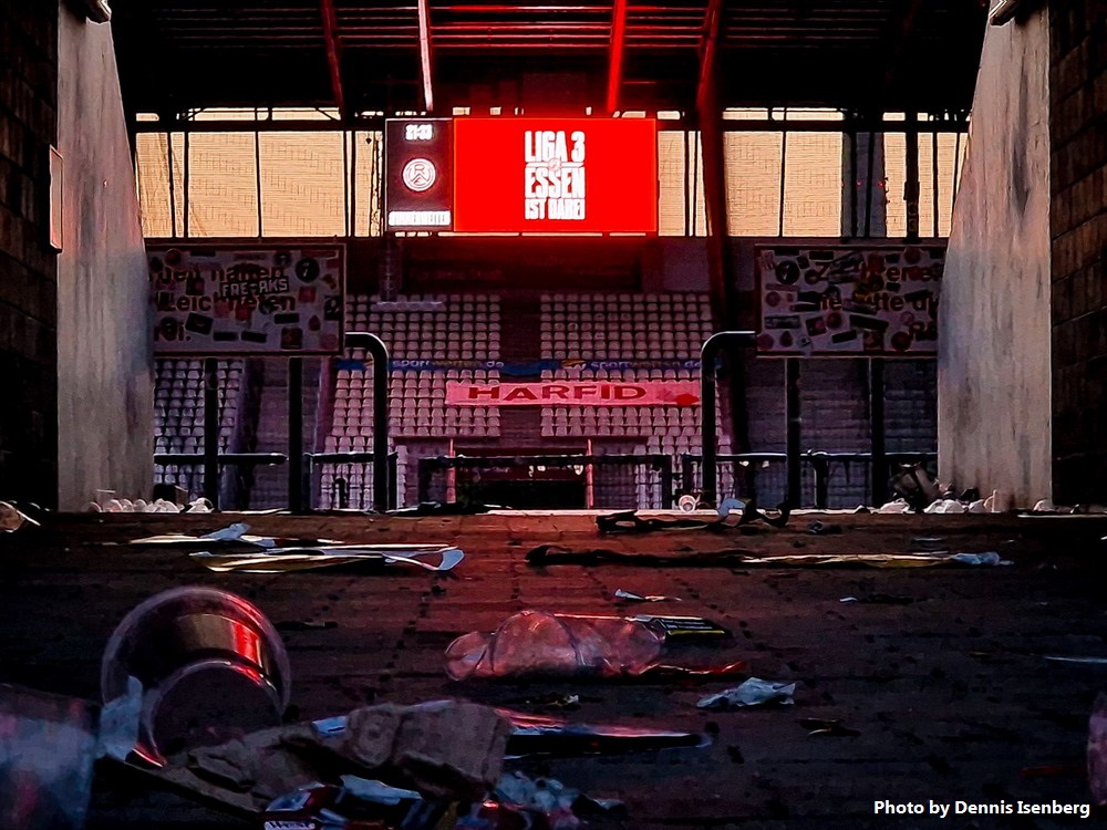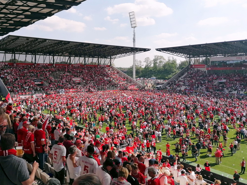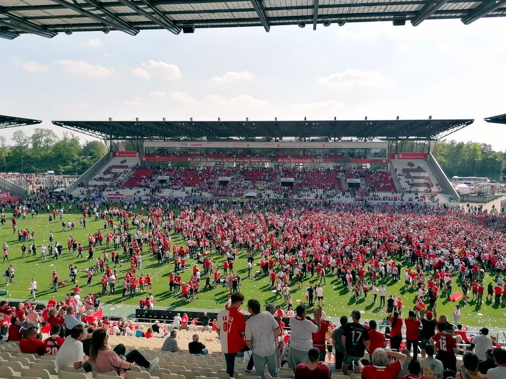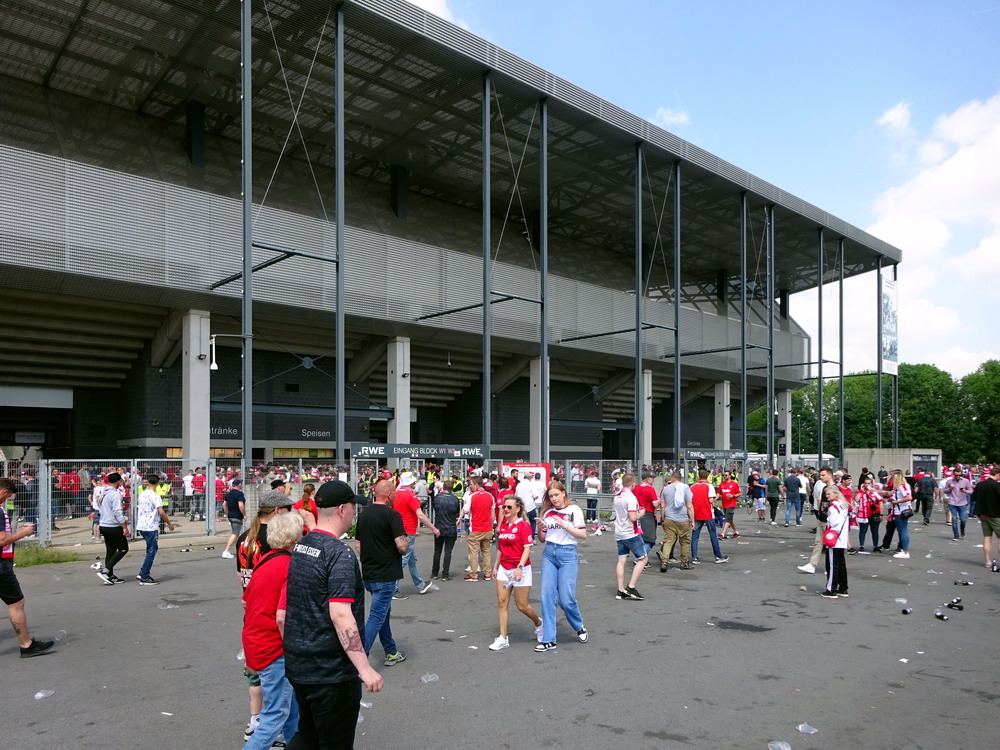 Ich fühlte mich völlig überwältigt, wusste gar nicht so richtig wohin mit mir. Der ersehnte, große Moment, auf den man sich ja so sehr gefreut hatte, war irgendwie schwer zu greifen und ich hatte Mühe, mich zu fokussieren. Prinzipiell begreife ich die RWE-Spiele ja recht sachlich und hatte nicht erwartet, dass mich dieser ganze geile Scheiß noch einmal so emotional verschlingen würde. So kann man sich in sich selbst täuschen. Eigentlich wurde erst in diesem Moment bewusst, welche Bedeutung dieser Aufstieg, für den Verein, für die Stadt und seine Menschen hat! So nebensächlich Fußball ja auch ist, so wichtig ist er doch! Die Teilnahme am Platzsturm sparten wir uns – man wird ja nicht jünger – und schauten uns die Geschichte und die Übergabe des Meisterpokals durch den Verbands-Fuzzi etwas benommen von der Tribüne aus an. Zwischendurch zog ich mich mal allein in die oberste Sitzreihe zurück und versuchte zu begreifen und zu realisieren, was hier gerade passiert war und weiter passiert. Das hat mich an das DFB-Pokalfinale in Berlin 1994 erinnert, das übrigens auf den Tag genau 28 Jahre zurück lag, denn nach diesem ja leider verlorenen Spiel brauchte ich auch erst einmal ein paar Minuten für mich allein. Irgendwann, das Zeitgefühl war längst verloren gegangen, machten wir uns in aller Ruhe auf den Heimweg.