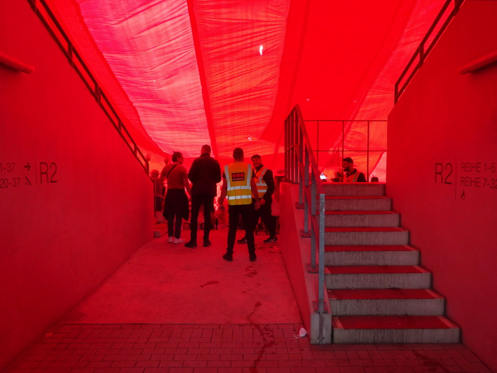 Auch im Stadion hielt sich meine Nervosität in Grenzen, die Vorfreude auf das, was erreicht werden konnte, überwog deutlich. Die Bude war natürlich unter aktuellen Bedingungen ausverkauft, das Knistern lag in der Luft, man spürte, dass nur ein Funke nötig war damit die Hütte auseinanderfliegt. Ich weiß schon gar nicht mehr, wie viele Bekannte ich getroffen habe, mit wem ich alles gequatscht habe. Es war einfach eine großartige Atmosphäre rund um dieses Spiel. Die Ultra-Fraktion hatte eine aufwändige Choreo über zwei Tribünen auf die Beine gestellt, die auch optimal funktionierte. Sah wohl gut aus, die Bilder zeigten es nachher – ich war halt selbst mit darunter und konnte nur mühsam ein Foto schießen. Von allen Seiten wurde Bier ran geschleppt, wer zum Bierstand aufbrach, fragte gar nicht mehr, sondern brachte mit, so viel er tragen konnte. Der Durst war groß und am Ende vielleicht sogar zu groß.